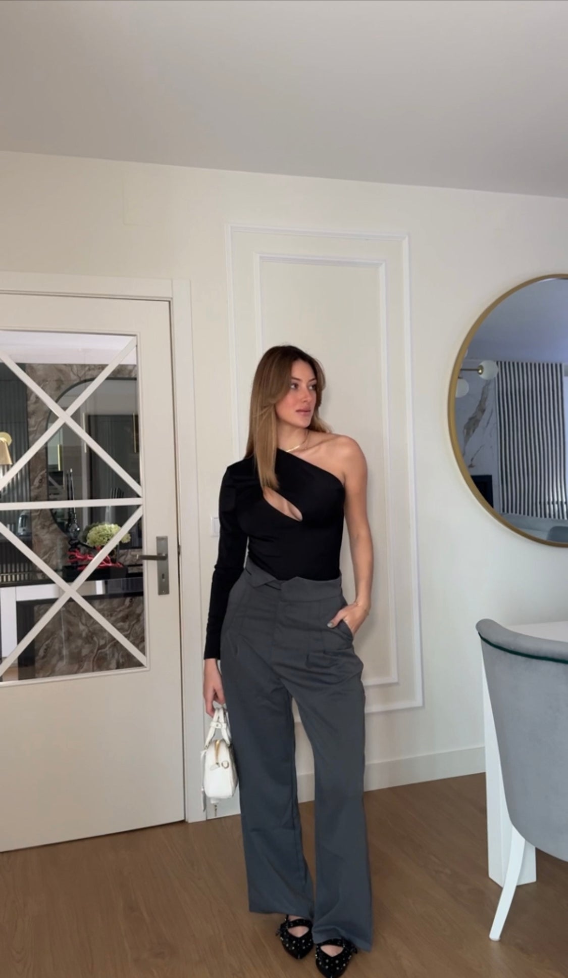 Broek in kostuumstof met stiksels, zeer soepel, hoge taille gedetailleerd met dubbele stof. Sluit met rits en haak, heeft zakken.