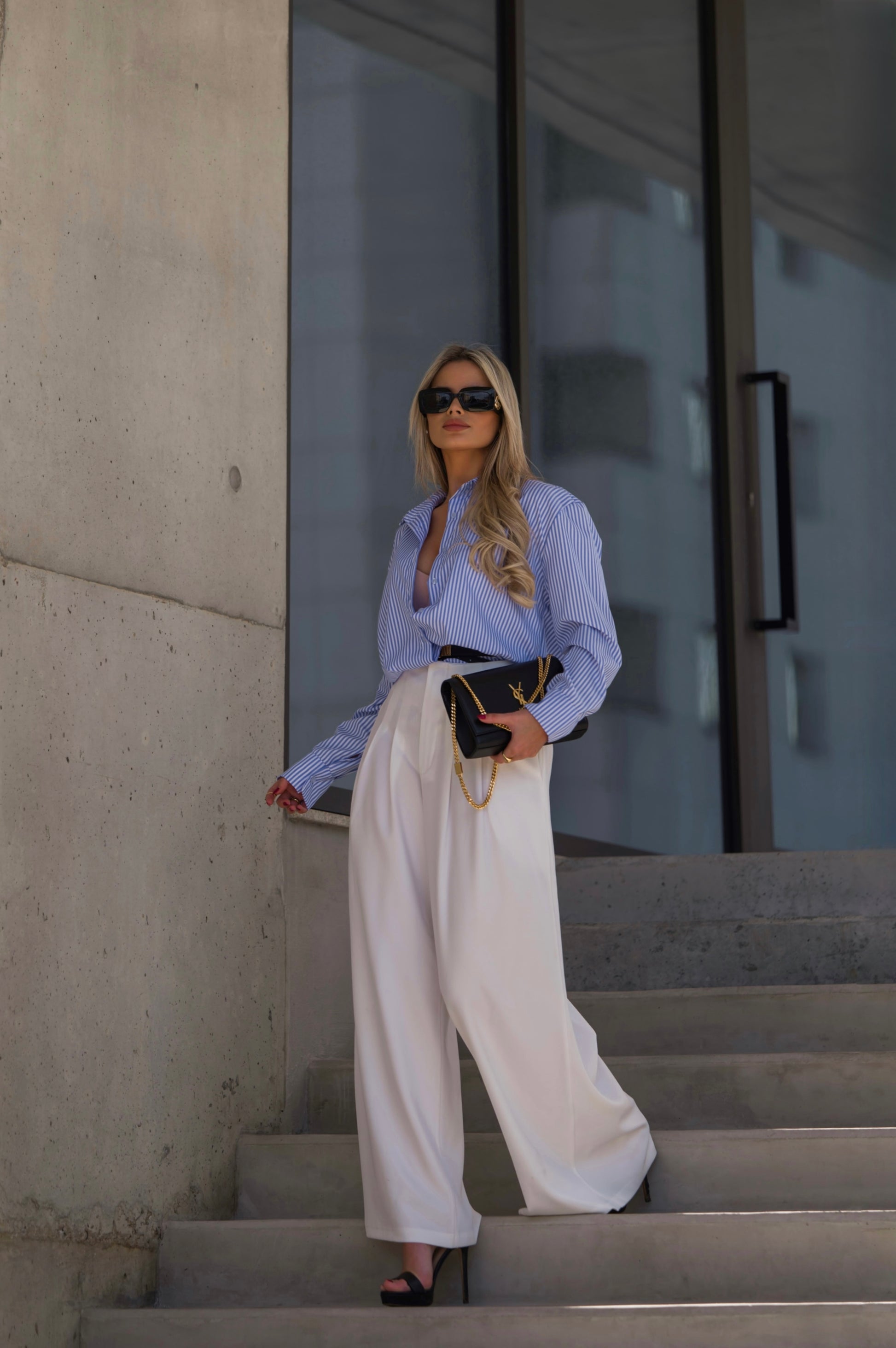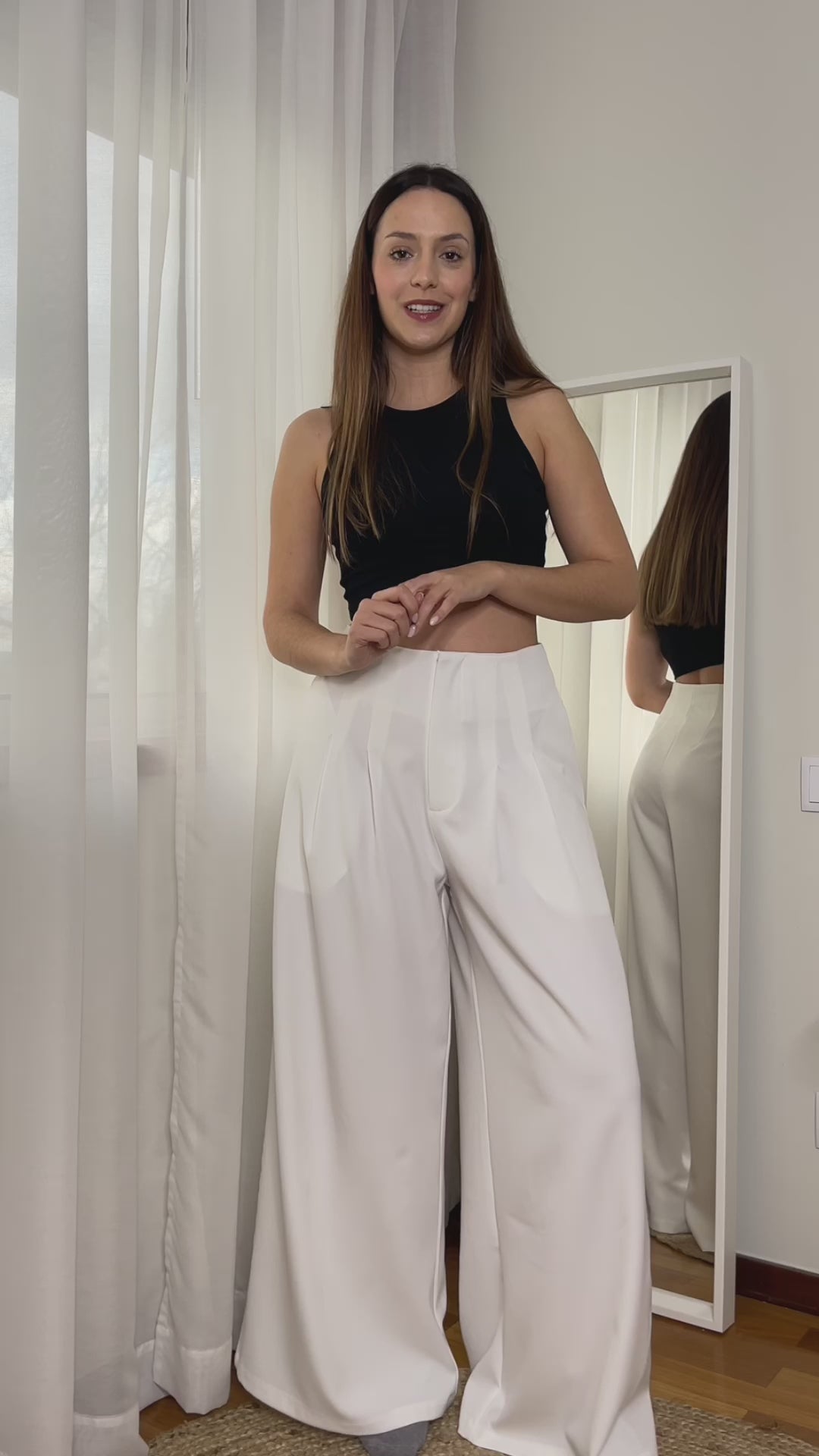 Wijde pantalon in kostuumstof met figuurnaden, een hoge tailleband, zakken en een sluiting met een gesp en haak.