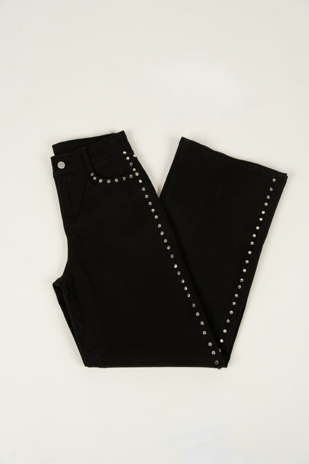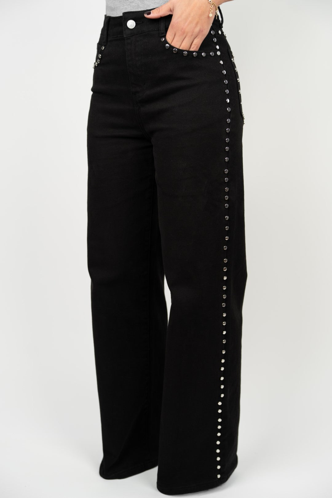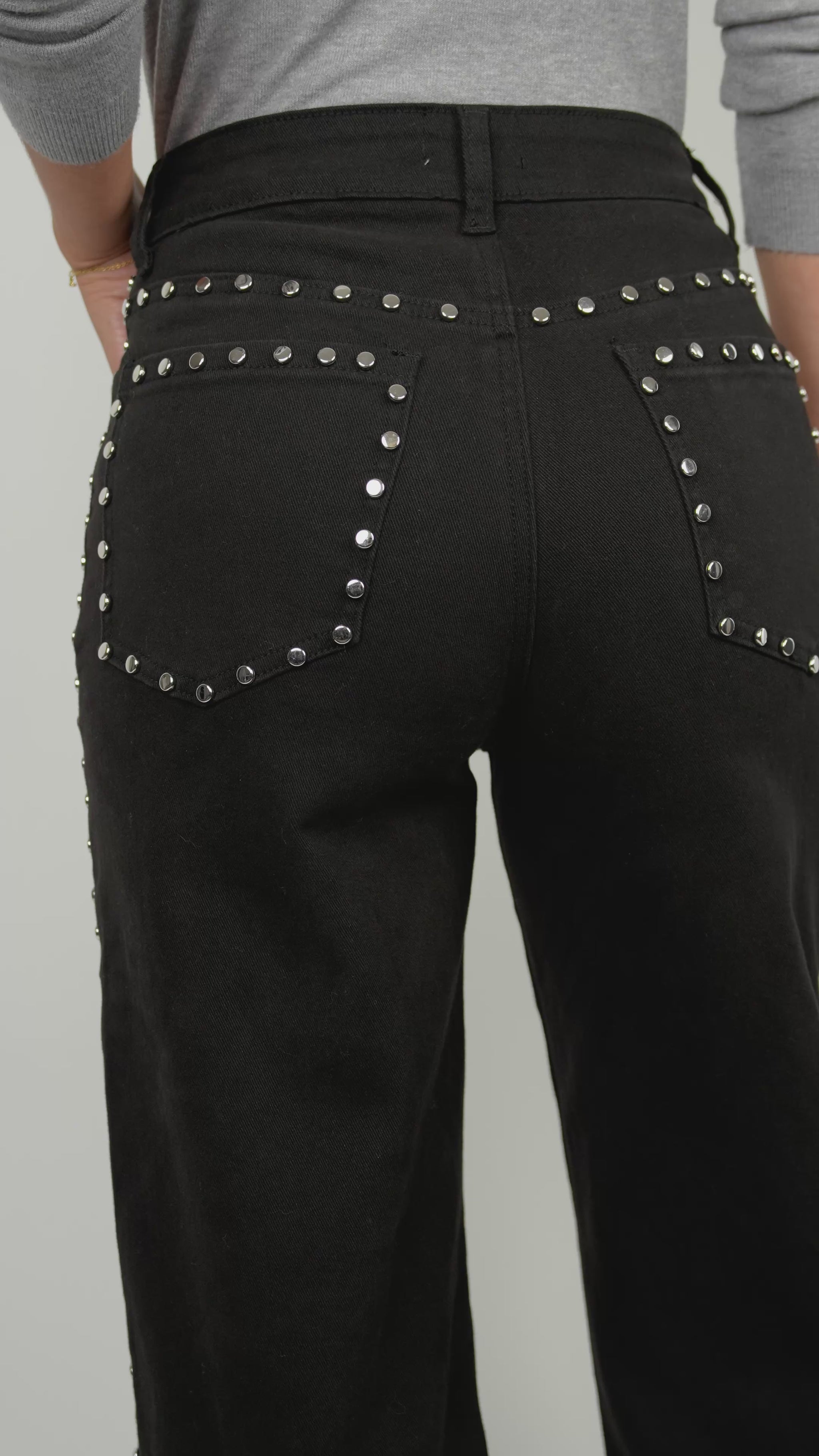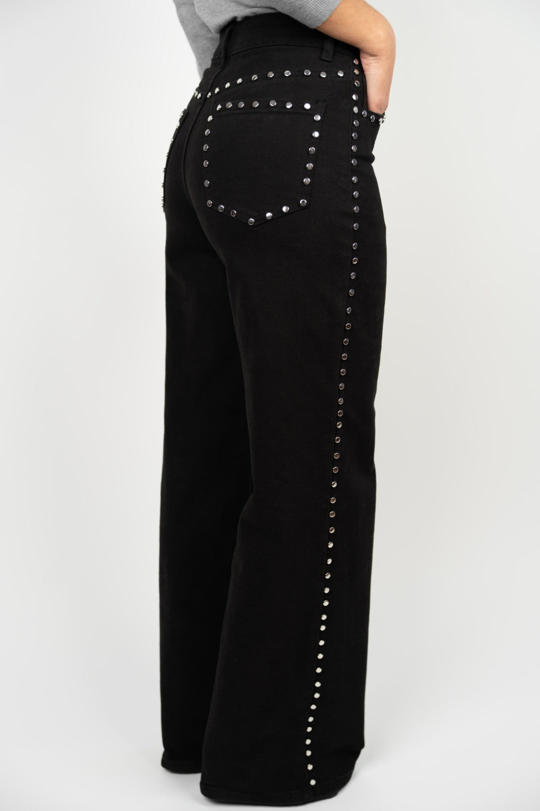 Calças de cintura alta com tachas prateadas, na lateral as pernas, bolsos frontais e traseiros. Modelo wide leg em preto com elasticidade.