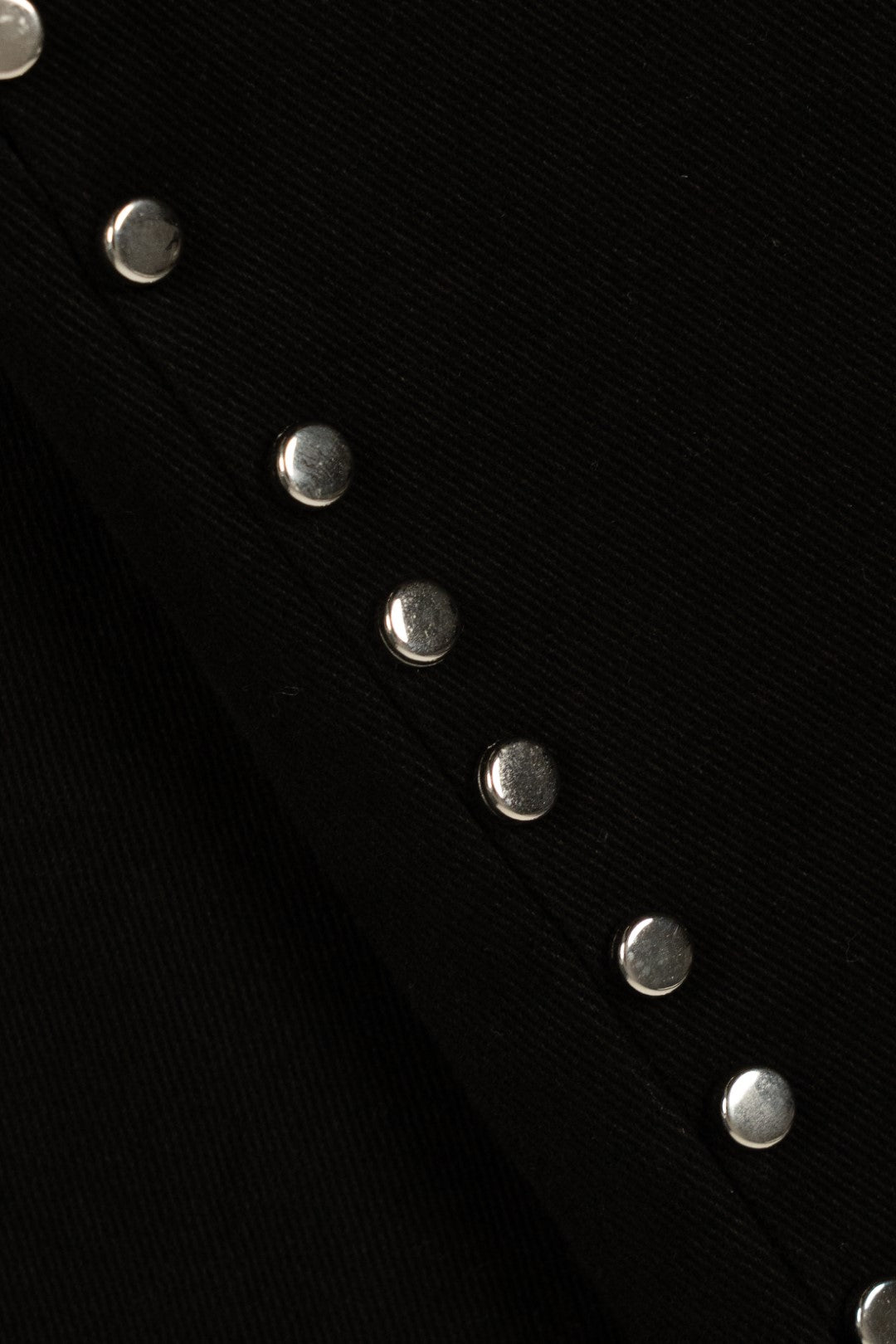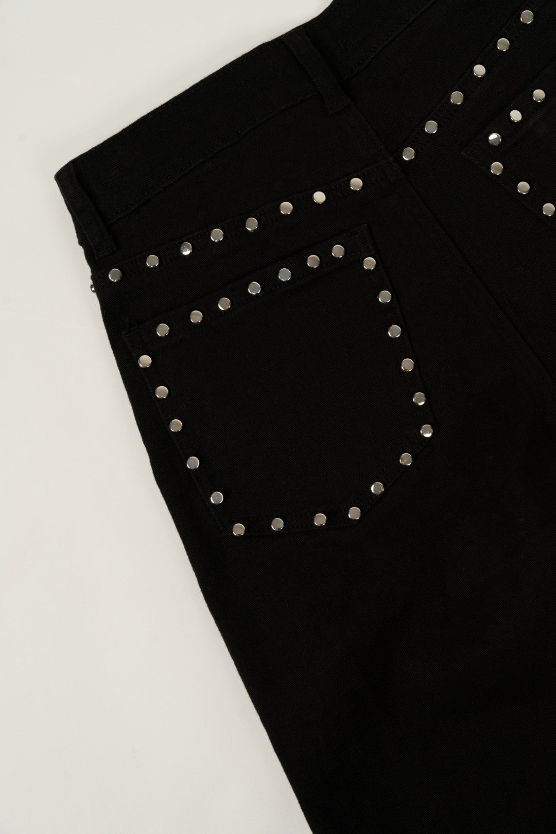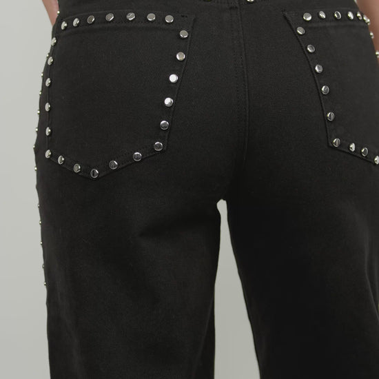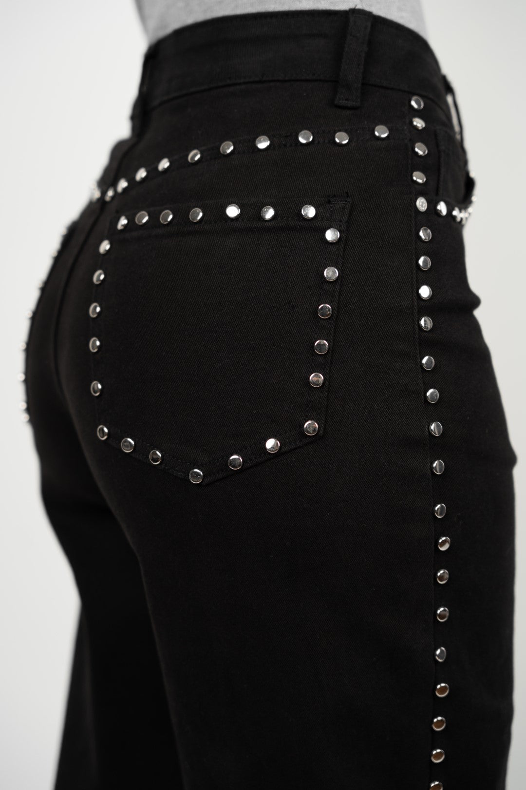 Calças de cintura alta com tachas prateadas, na lateral as pernas, bolsos frontais e traseiros. Modelo wide leg em preto com elasticidade.