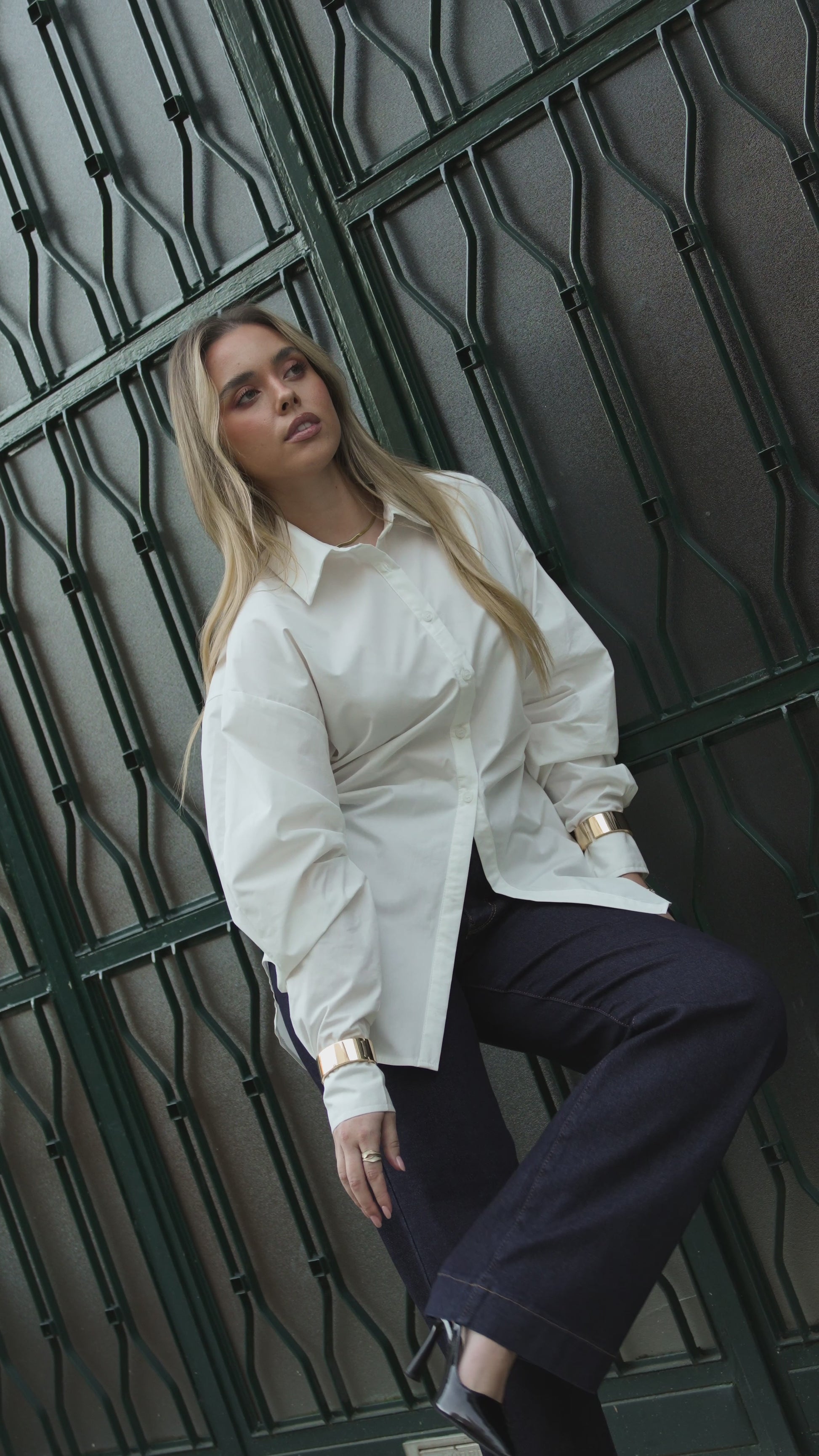 Camisa com efeito cintado e manga abalonada. Aperta com botões nos punhos e à frente.