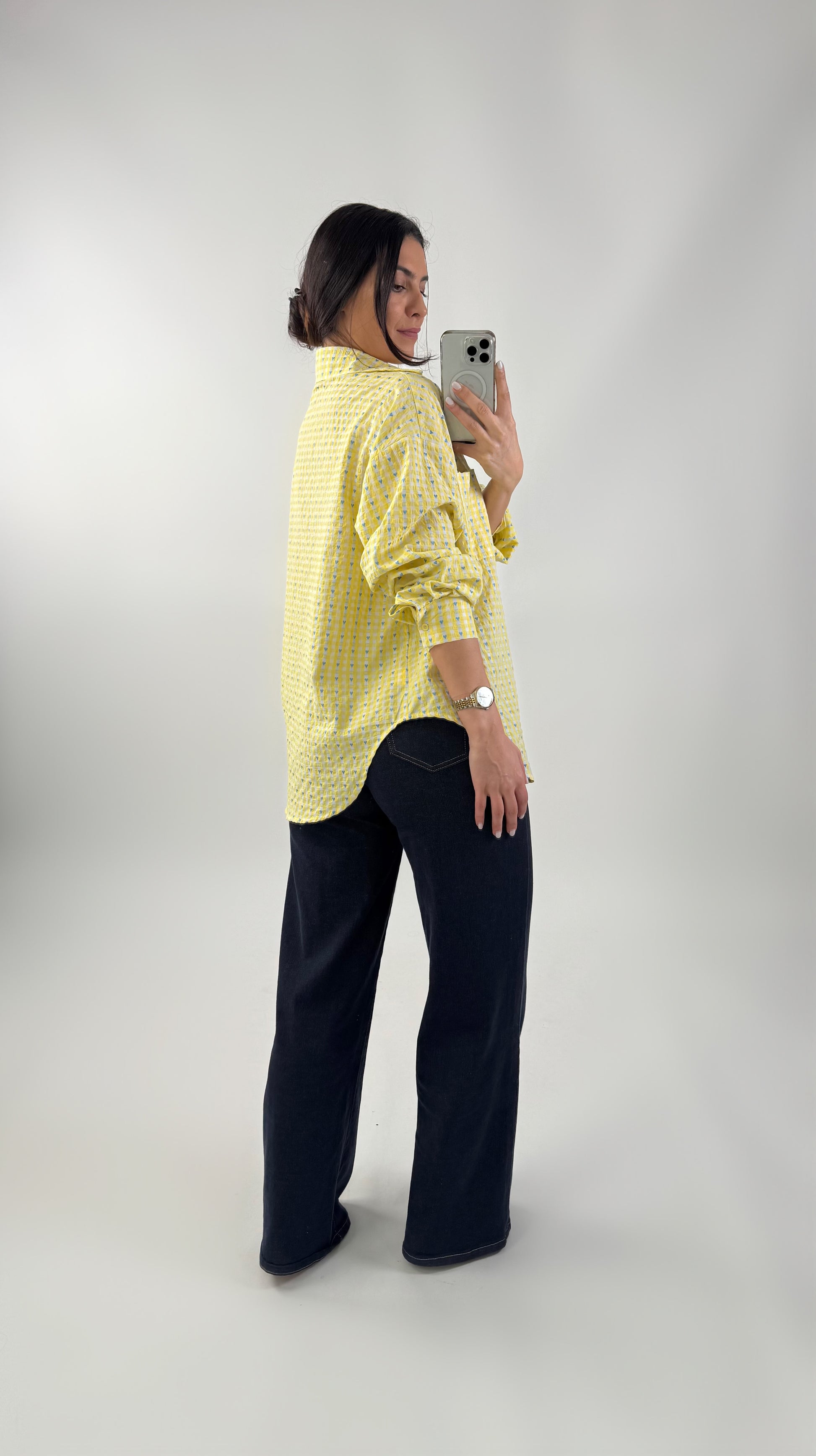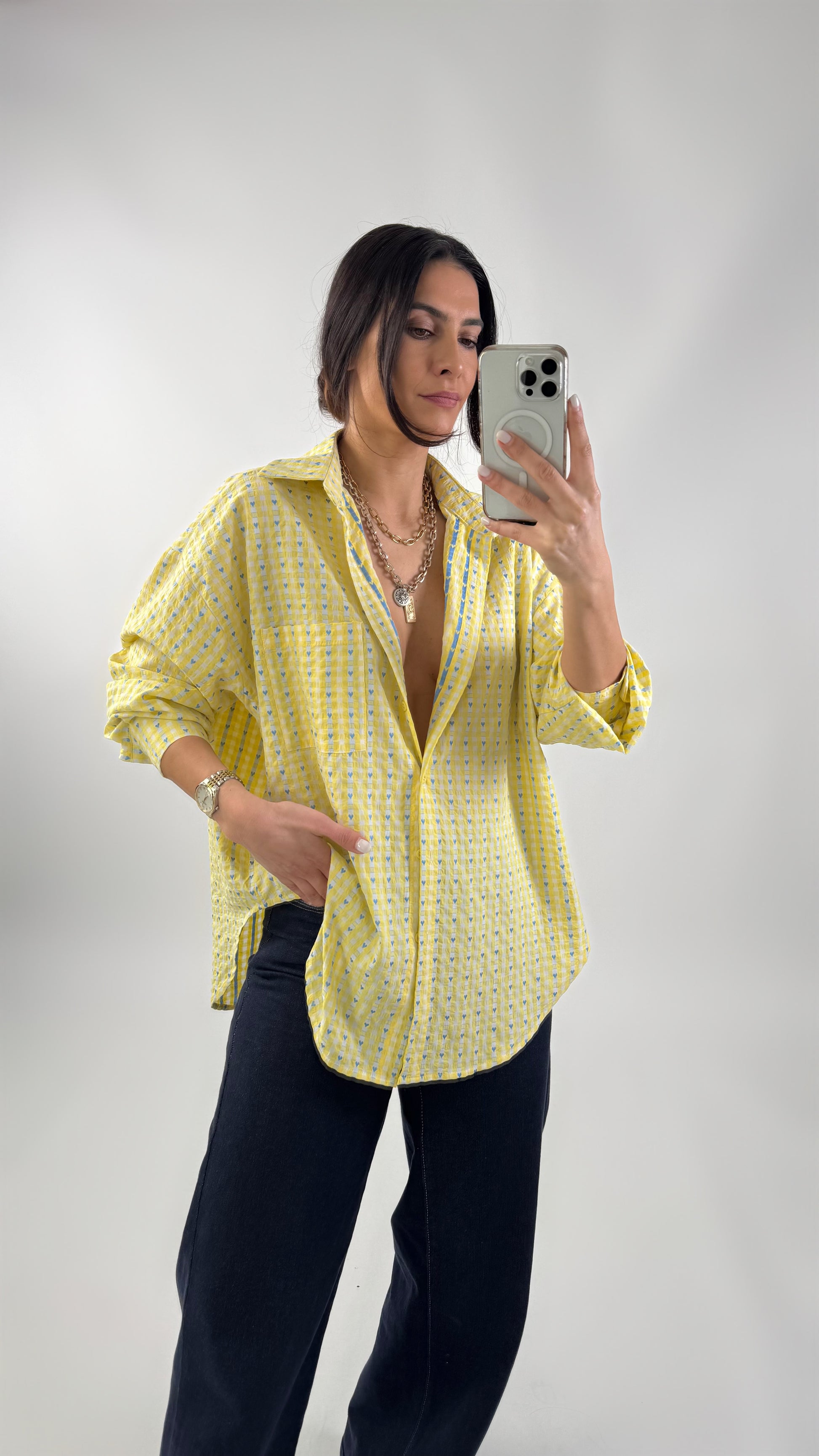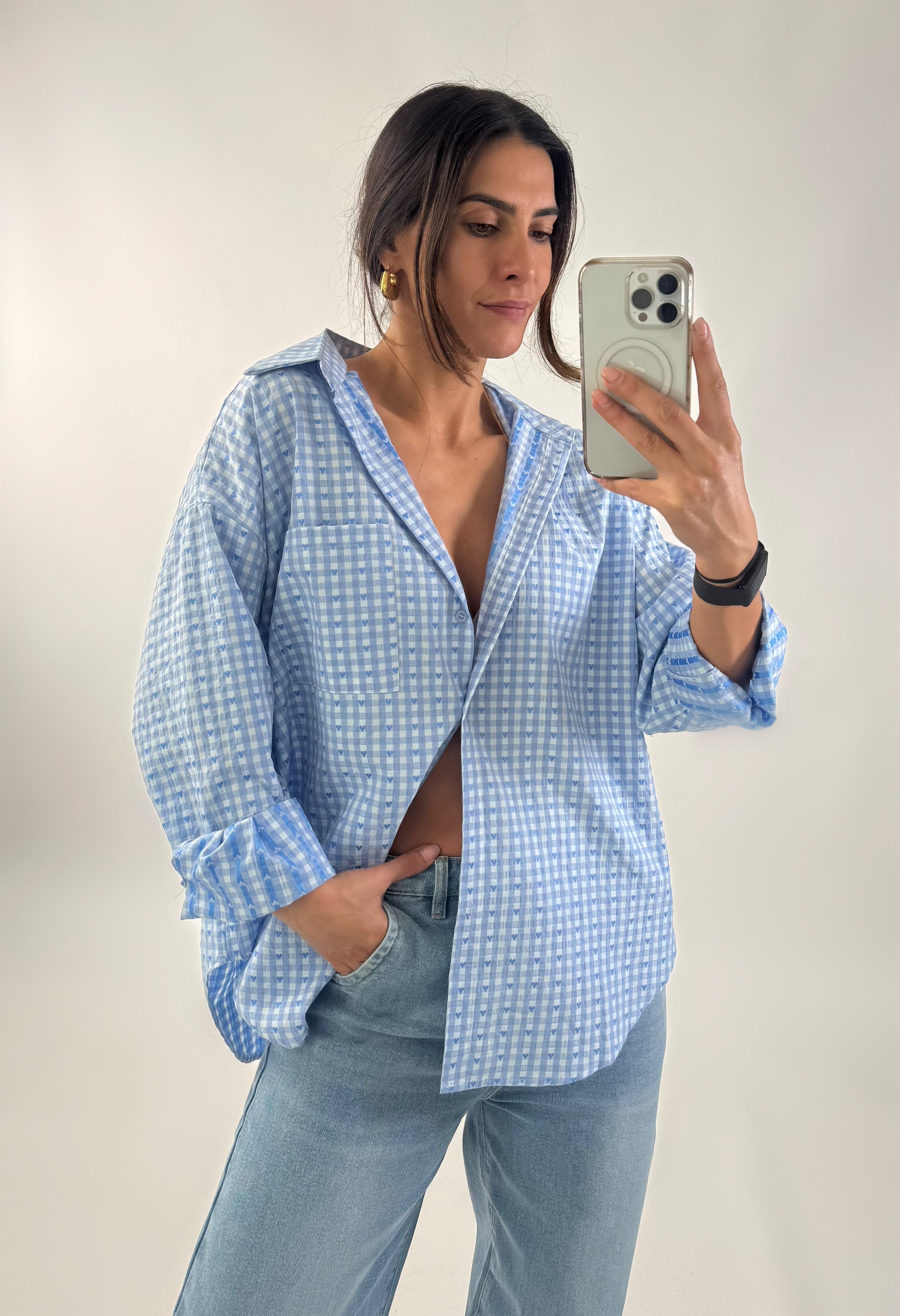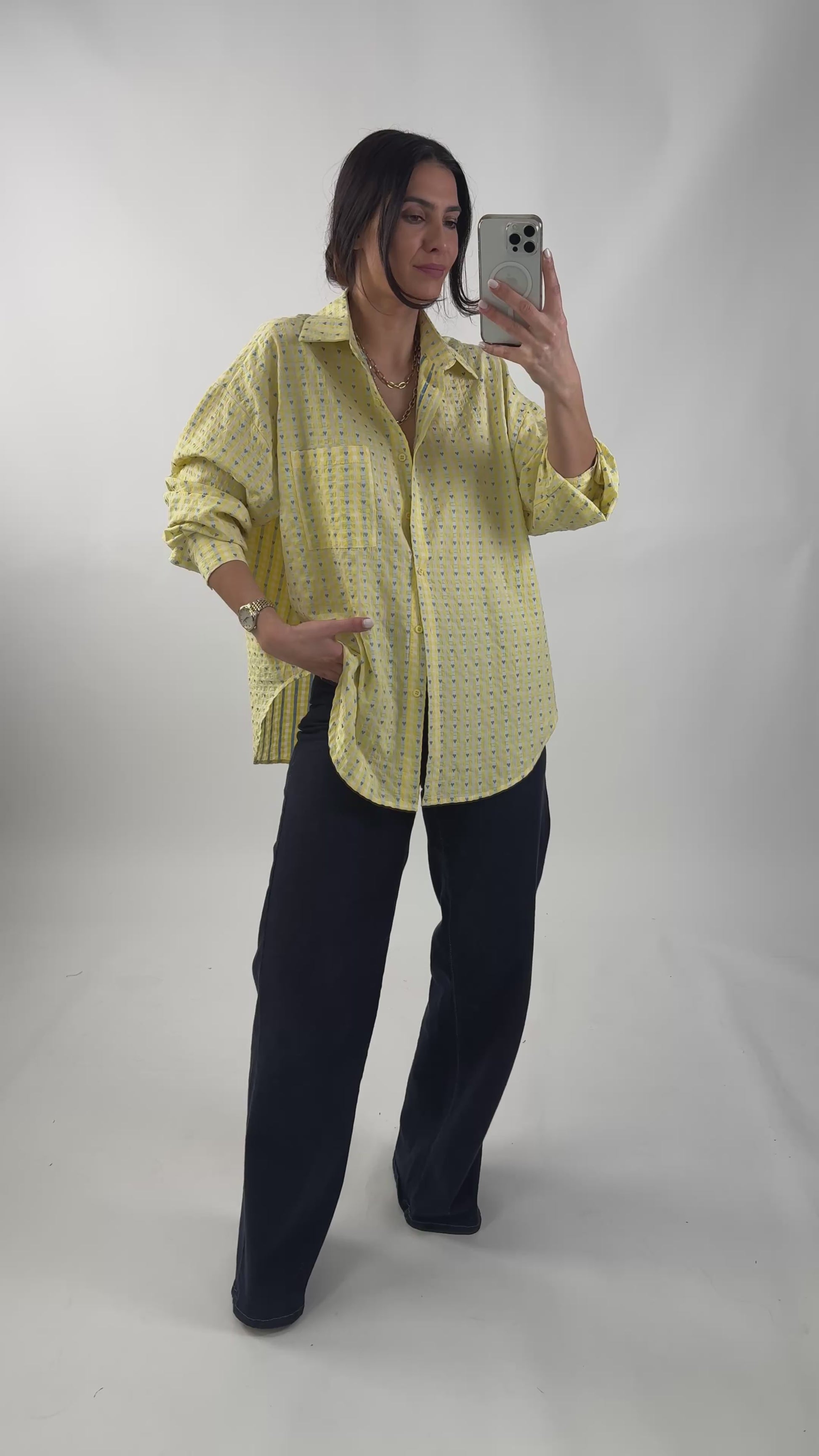 Oversized overhemd van structuurstof. Het heeft een voorzak en een sluiting met knopen. Het heeft een ovale snit aan de zijkanten. One size fits all. S naar de L.