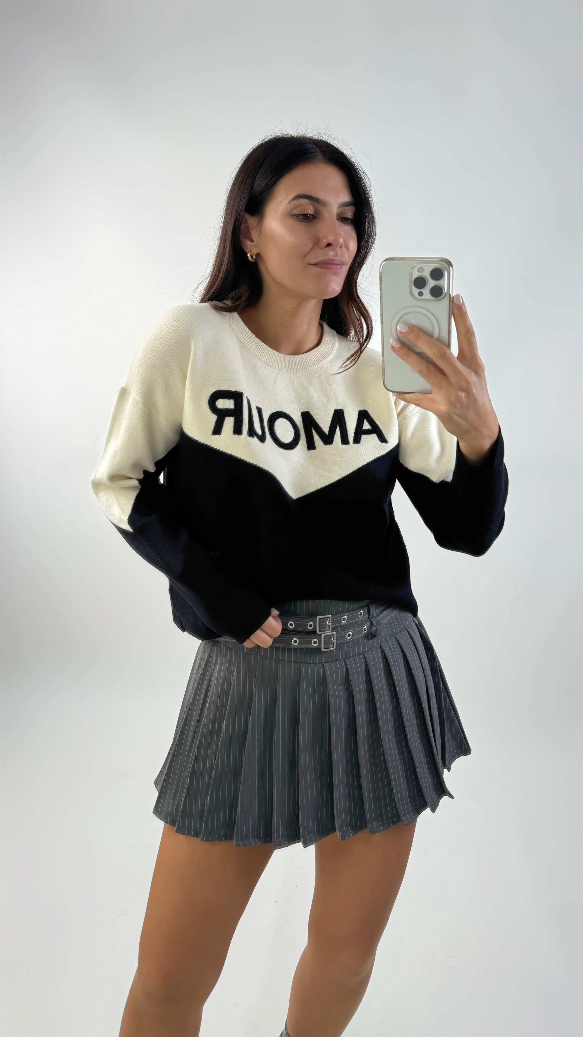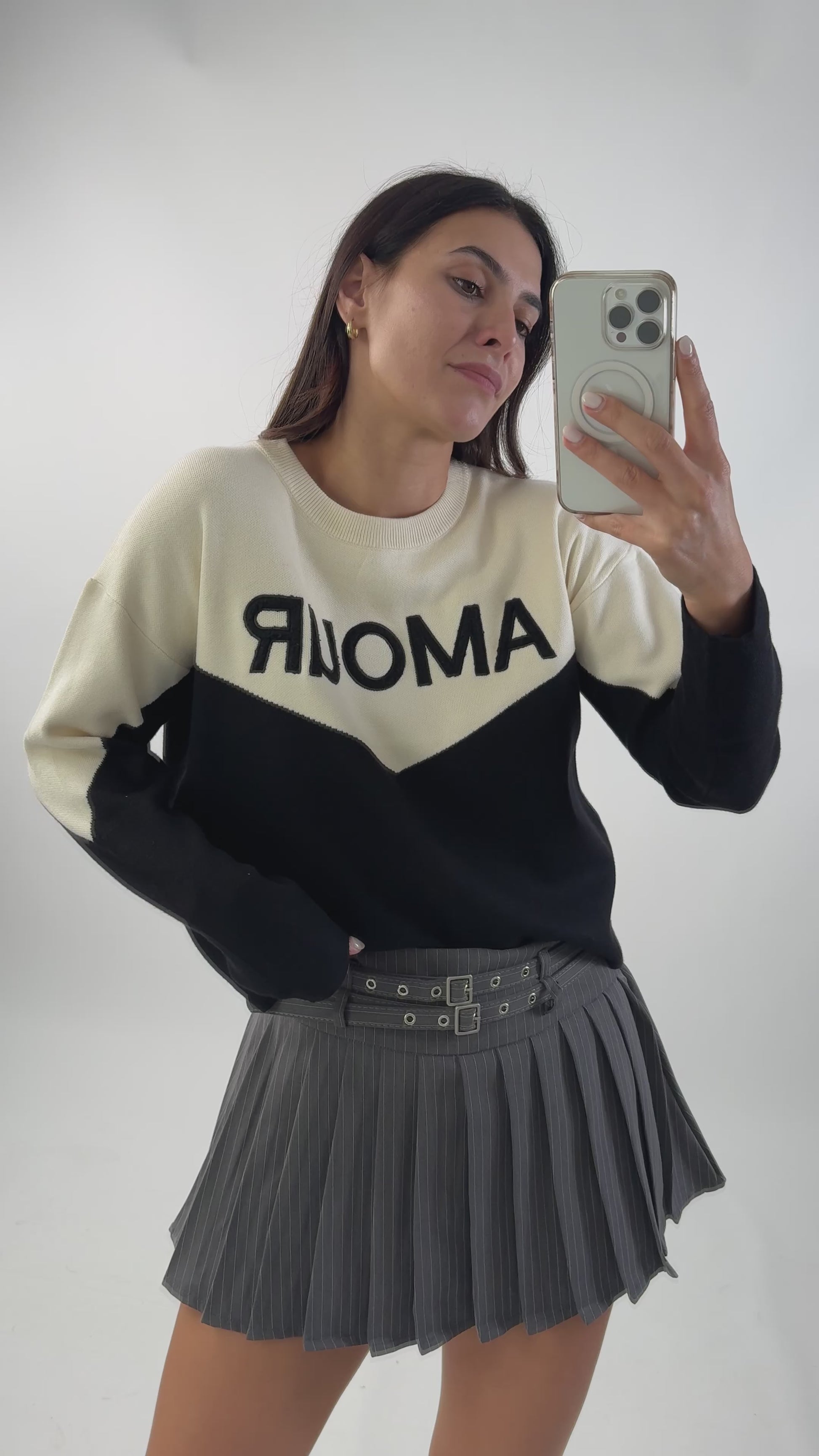 Stretch gebreide trui met een geribbelde ronde hals. Tweekleurig en voorzien van een slogan in licht verhoogde letters. One size fits all. S naar de L.