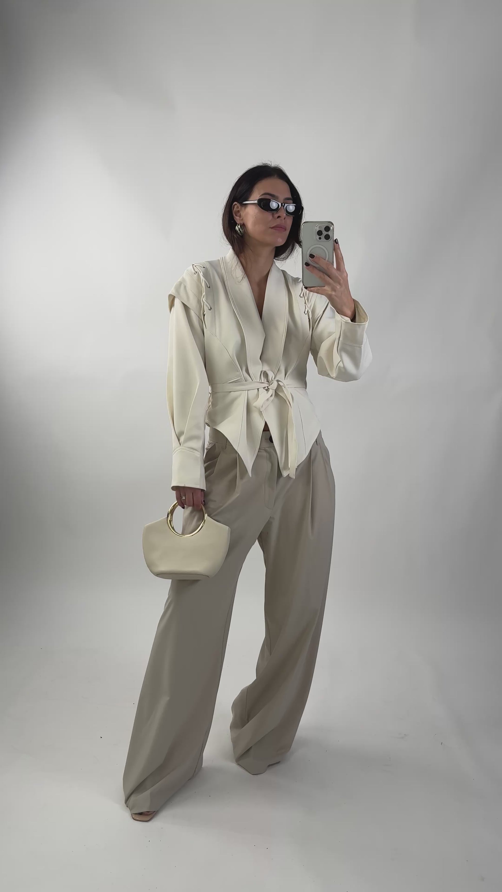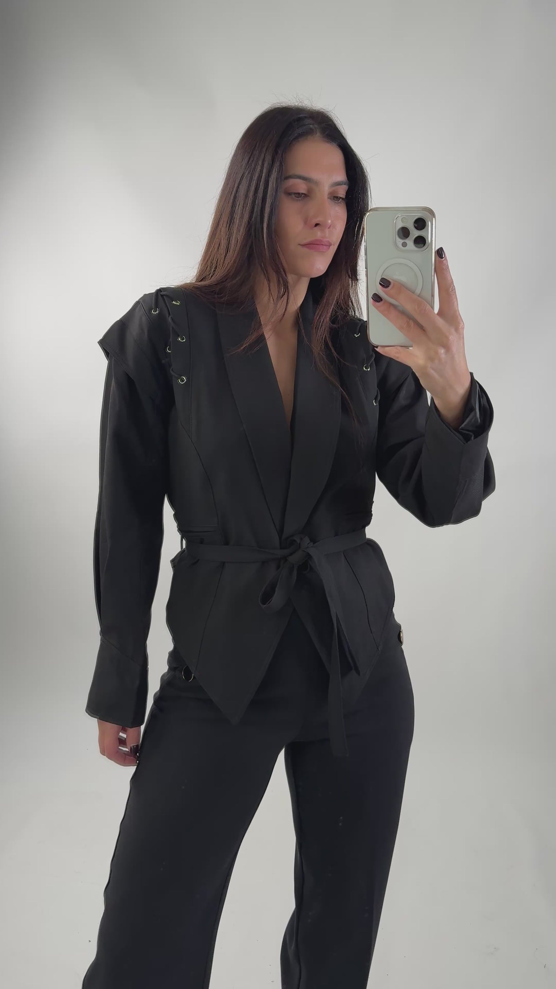 Jas gevoerd met polyester. Asymmetrische snit met een driehoekig effect aan de voorkant. Sluit met een knoop en een riem van dezelfde stof. Trekkoord op de schouder en rug. Dit artikel valt kleiner uit dan normaal.