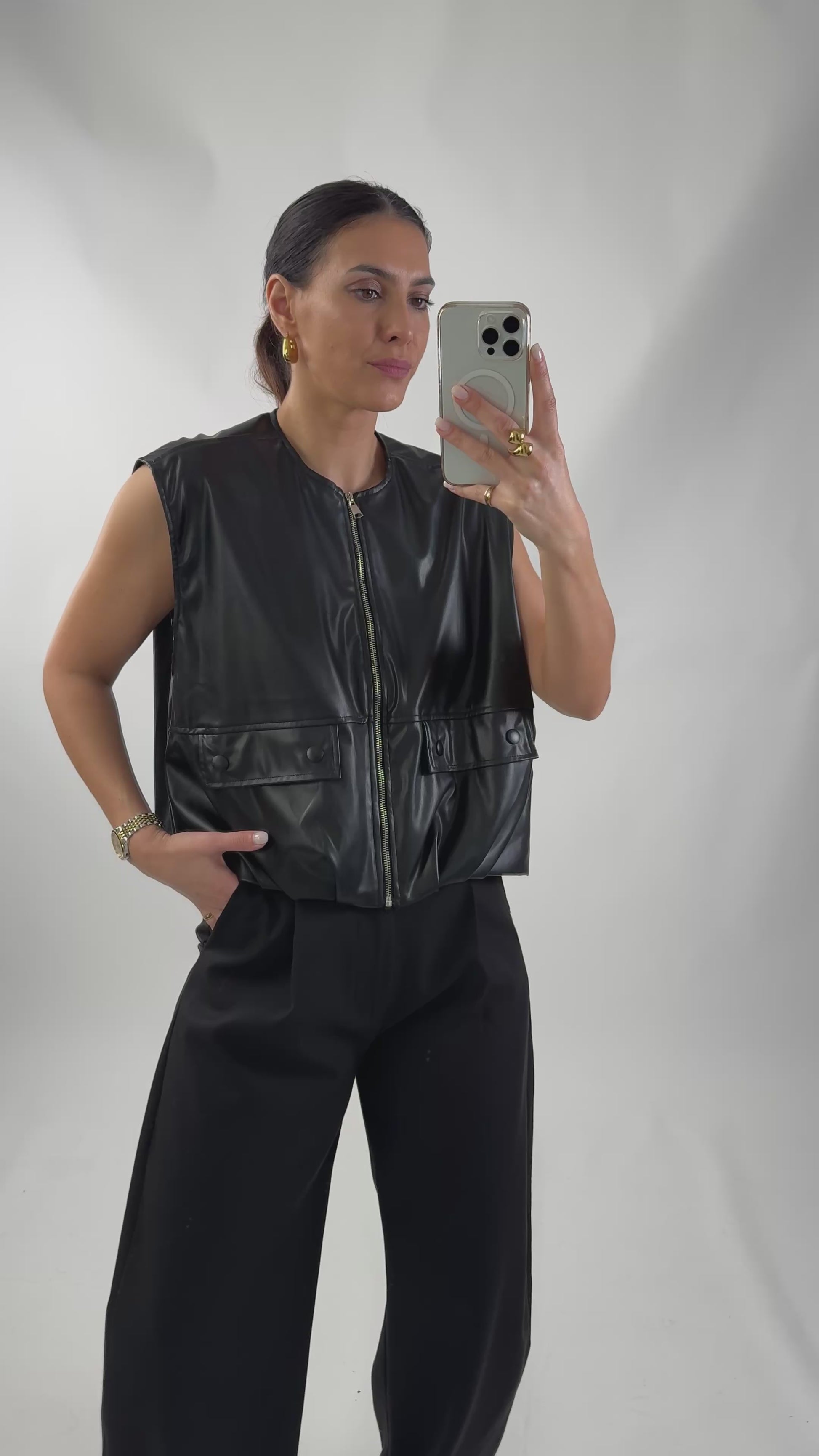DE Eco-leren bombervest Dit trendy item combineert een sportieve stijl met een moderne, duurzame touch. Oversized en gemaakt van eco-leer, is dit vest volledig gevoerd voor comfort. De zilveren ritssluiting geeft het een urban uitstraling, terwijl de praktische zakken met drukknoopsluiting extra functionaliteit toevoegen. De lichte drapering in de taille zorgt voor een stijlvolle en comfortabele pasvorm. S naar de L.
