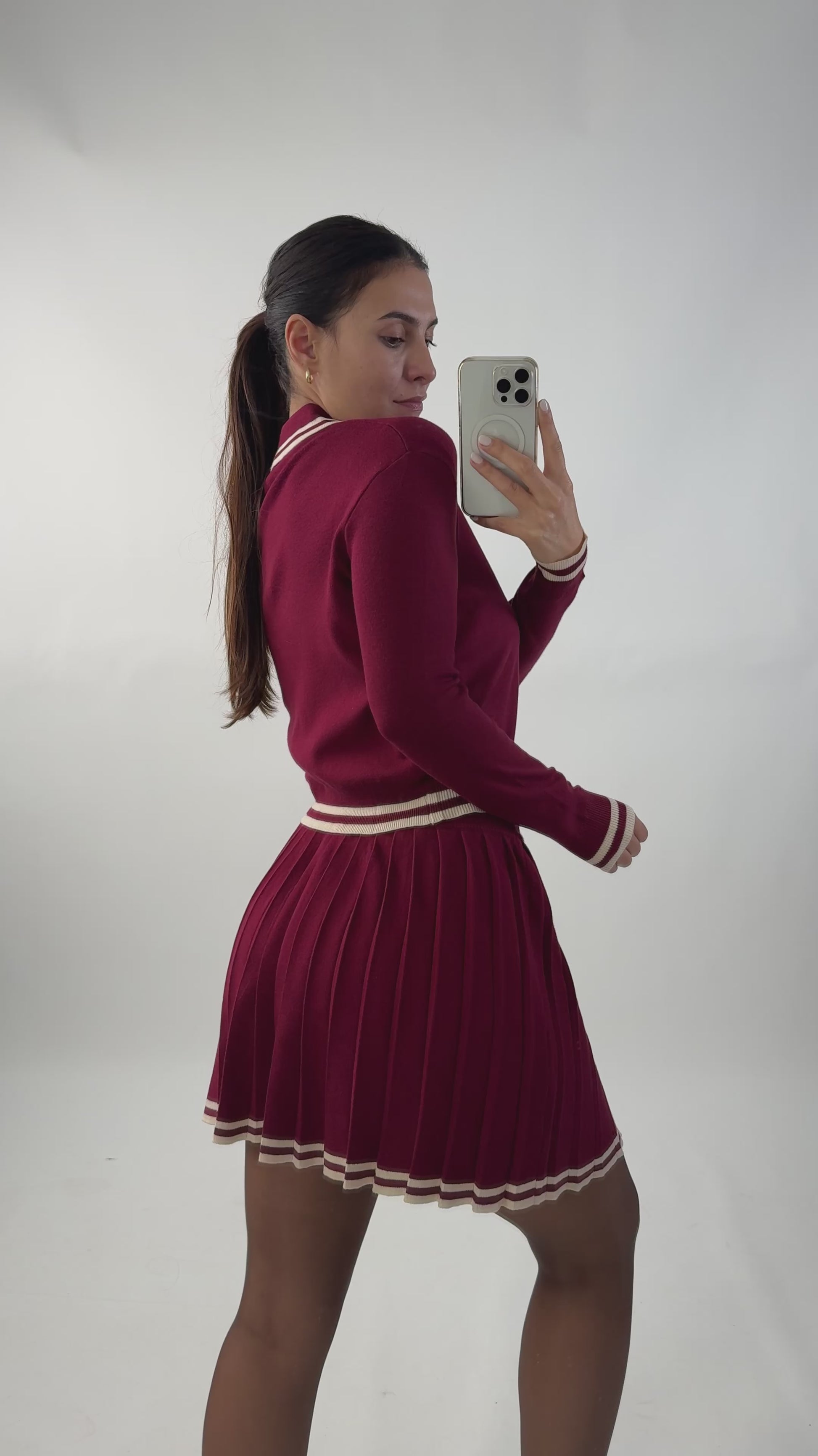 Rok en topset van fijn gebreide stof met stretch. Geplooide rok met elastische tailleband. Top met kraag, smalle halslijn en knoopsluiting.