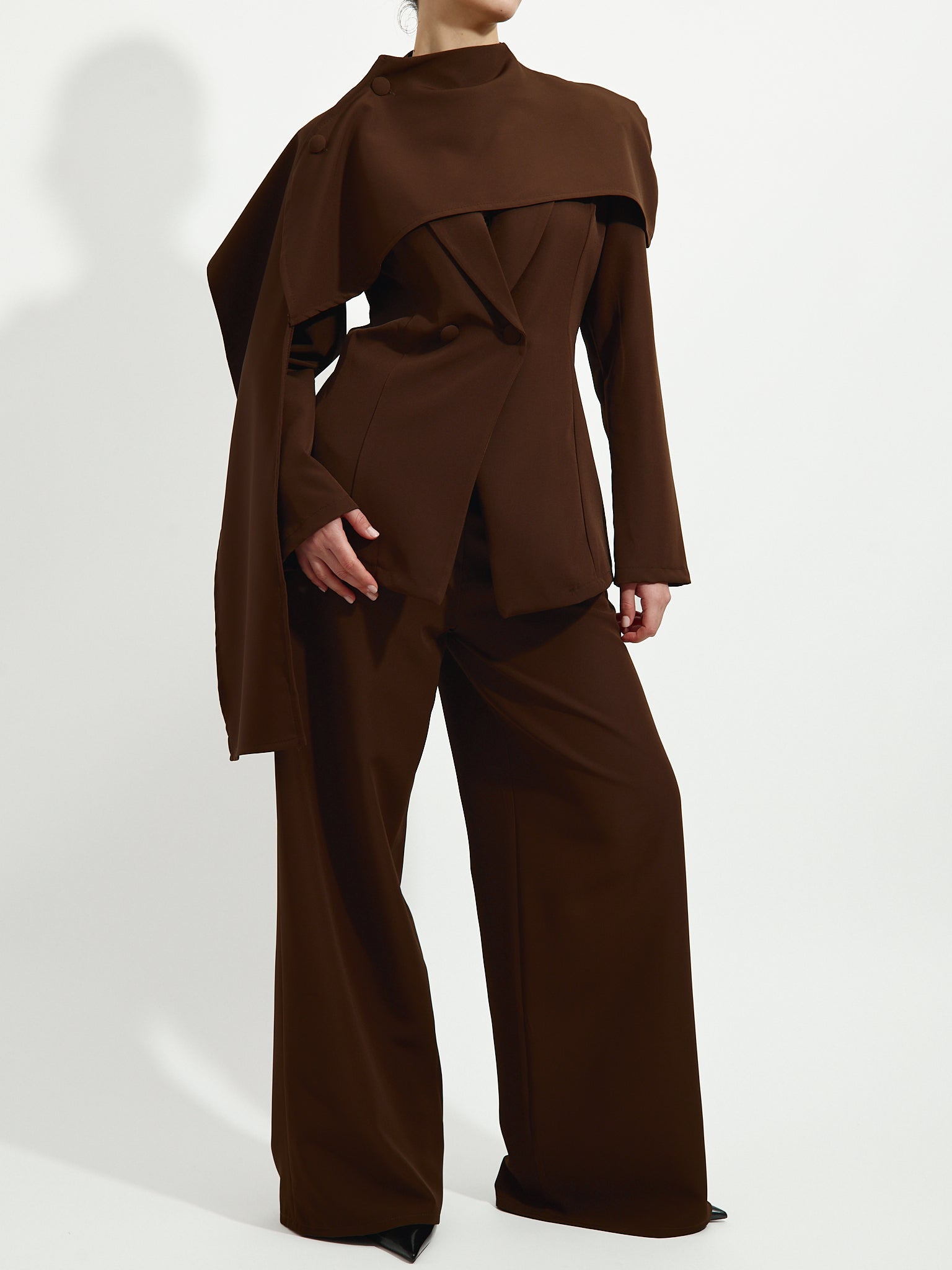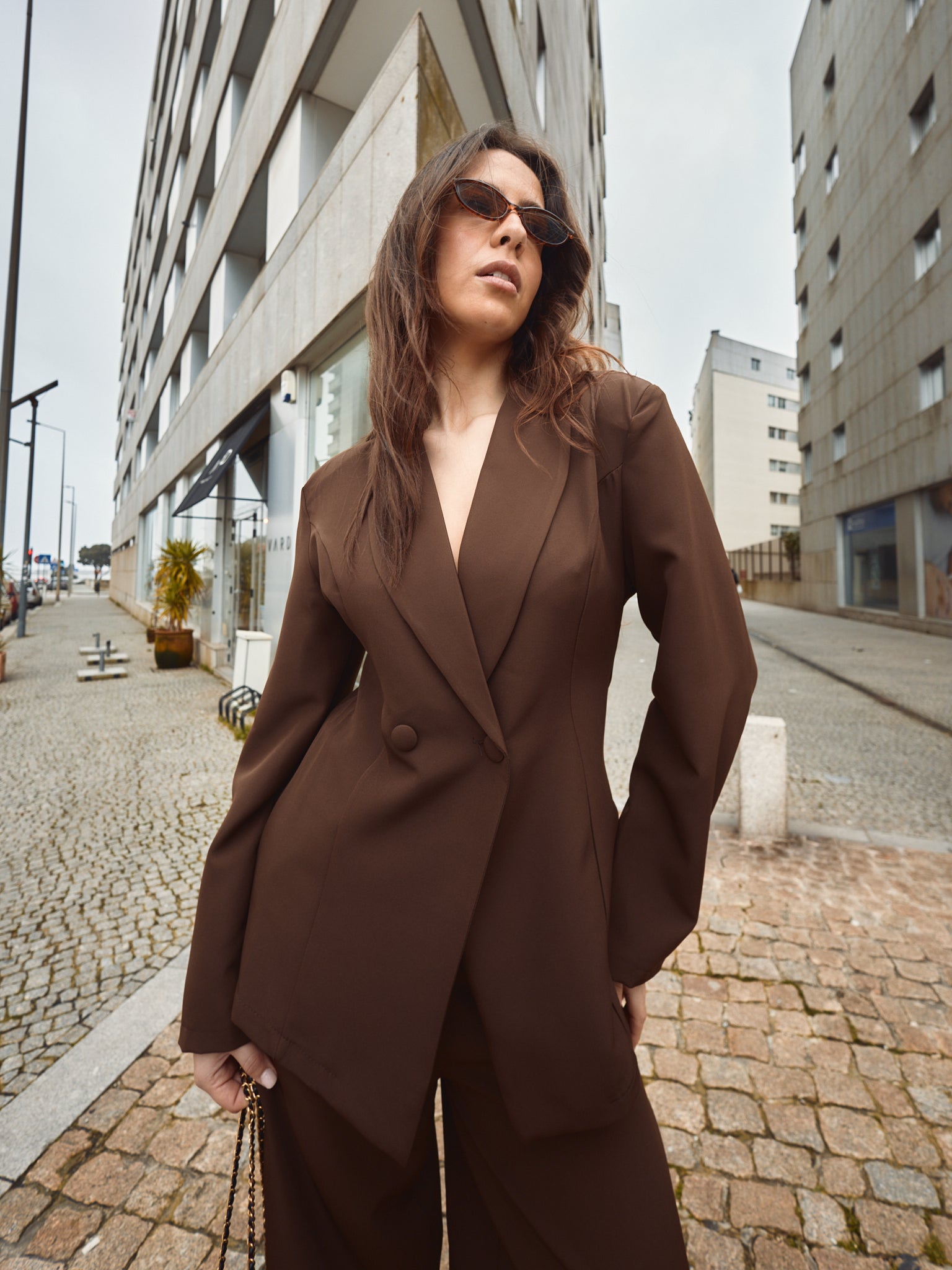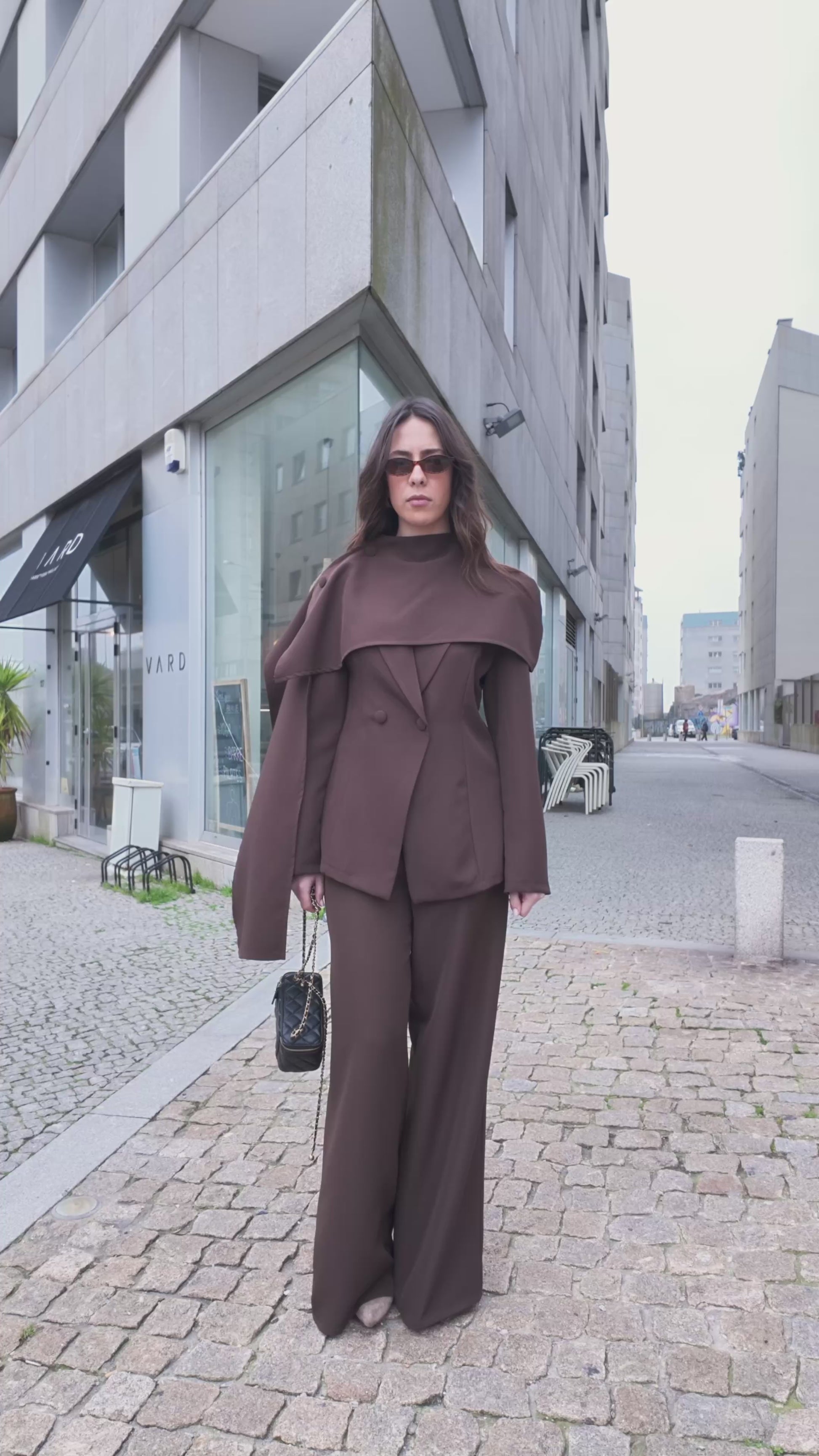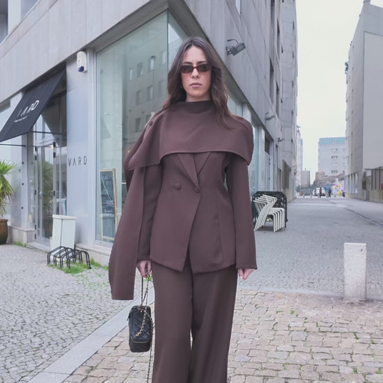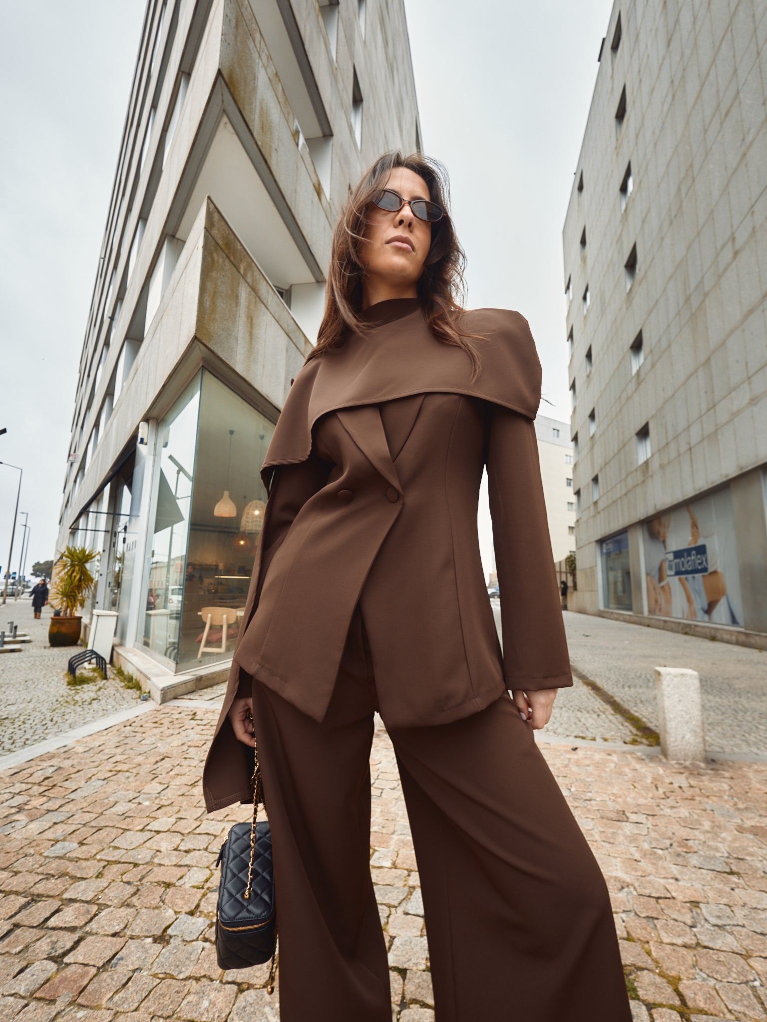 Conjunto de blazer e calças. O blazer tem modelagem cintada, fecha com dois botões efeito trespasse. As calças pantalonas têm caimento amplo, bolsos e fecho frontal com fecho e botão. Tem detalhe removível em efeito cachecol, aperta com dois botões.