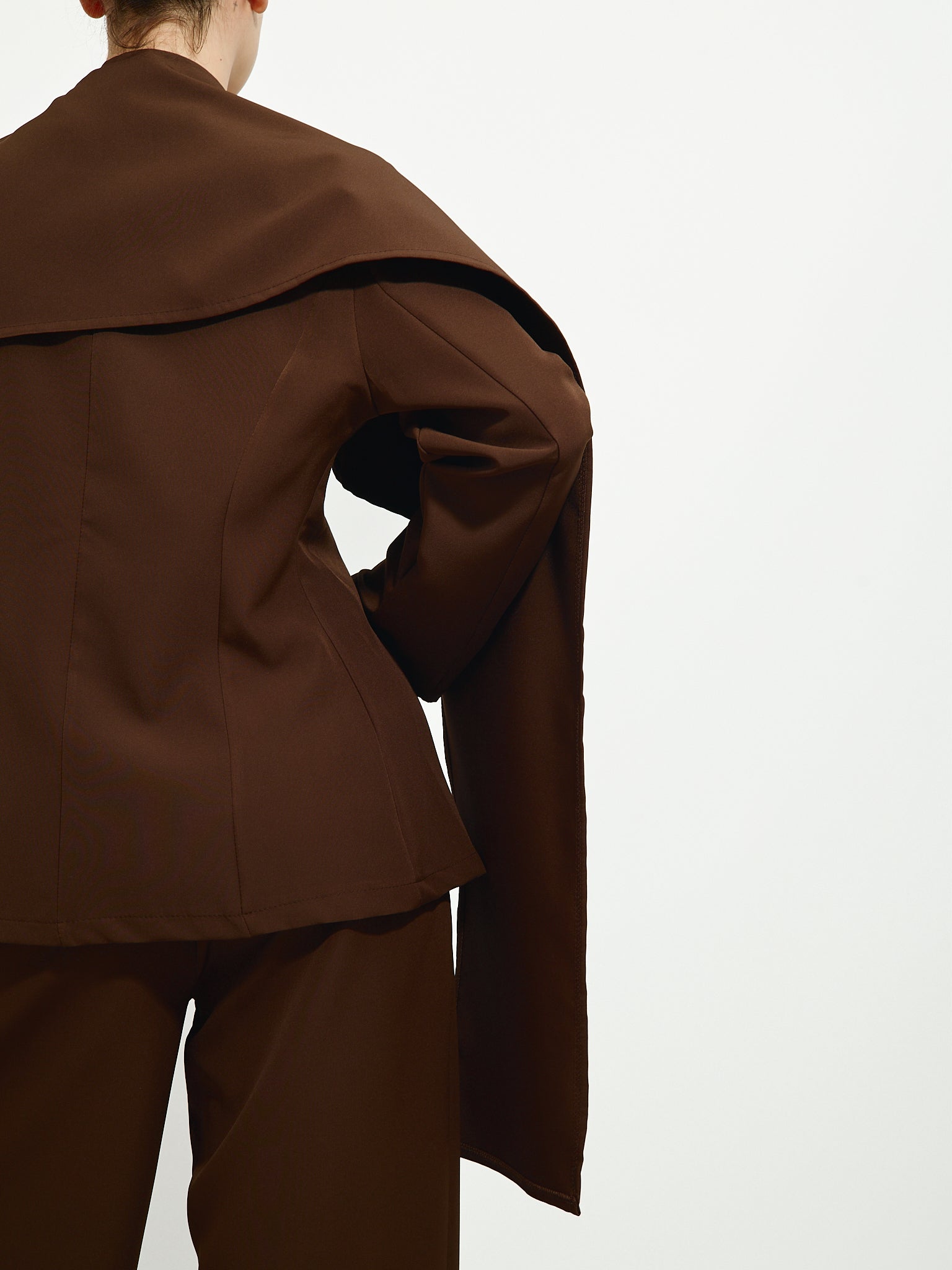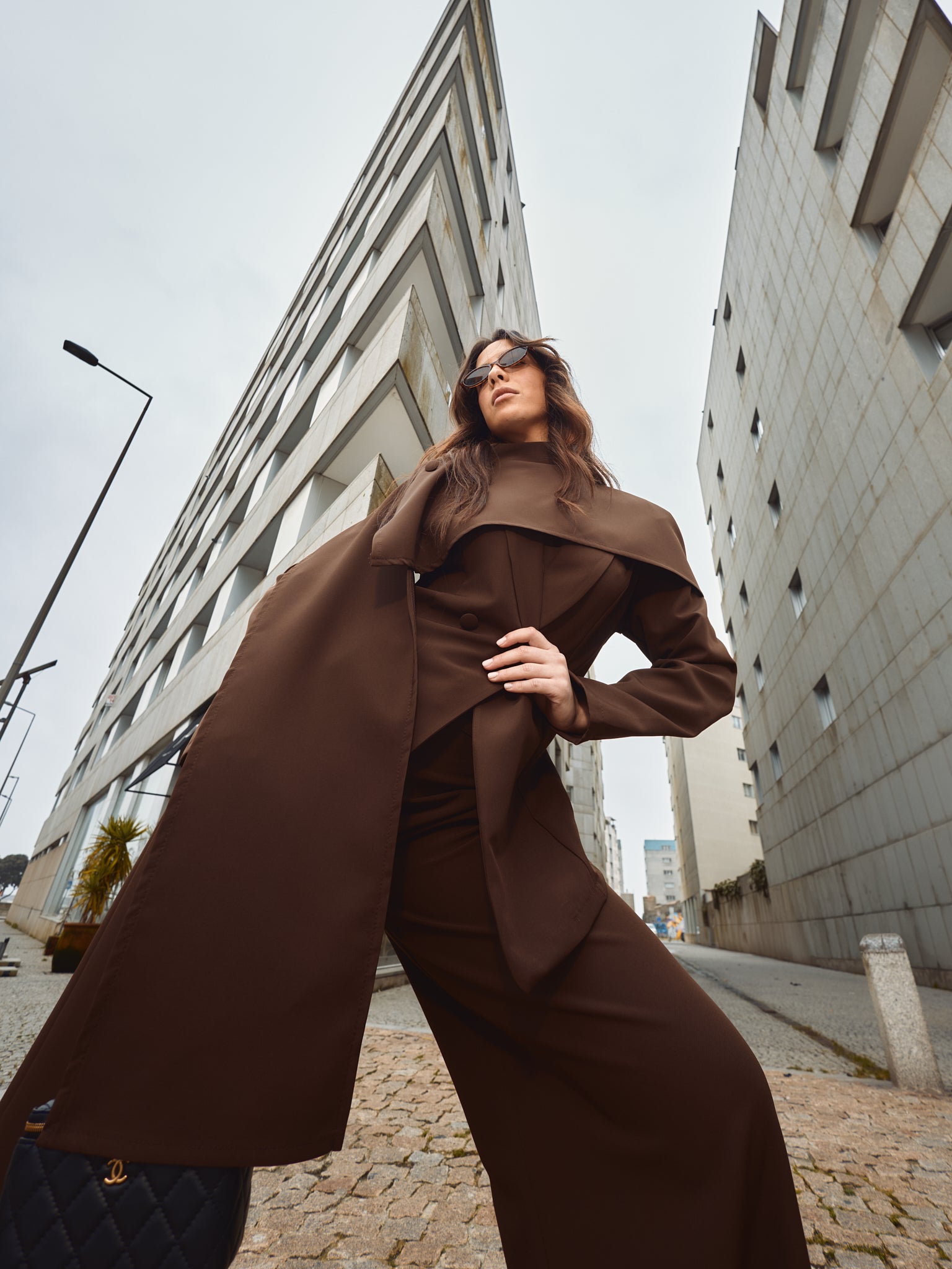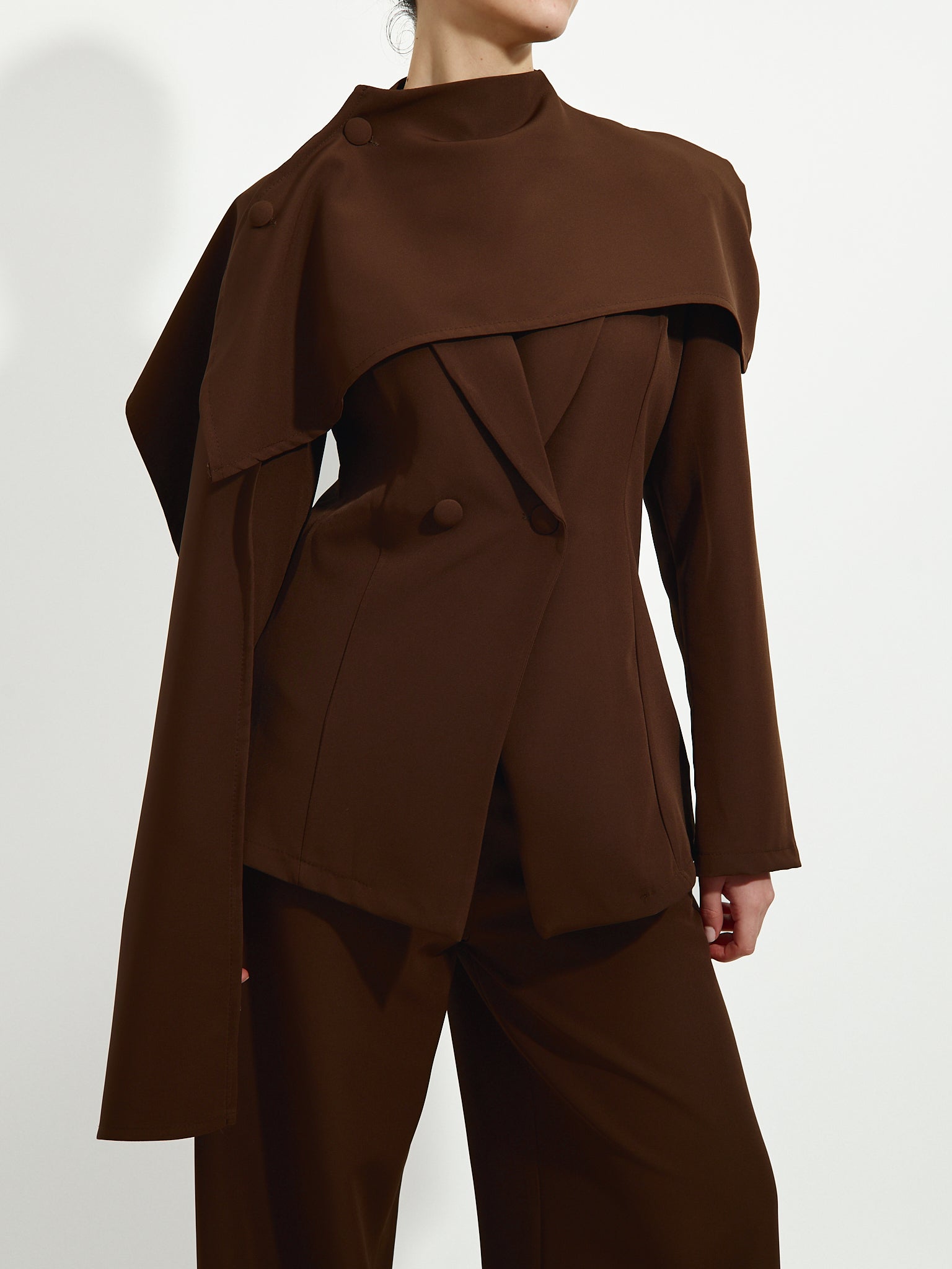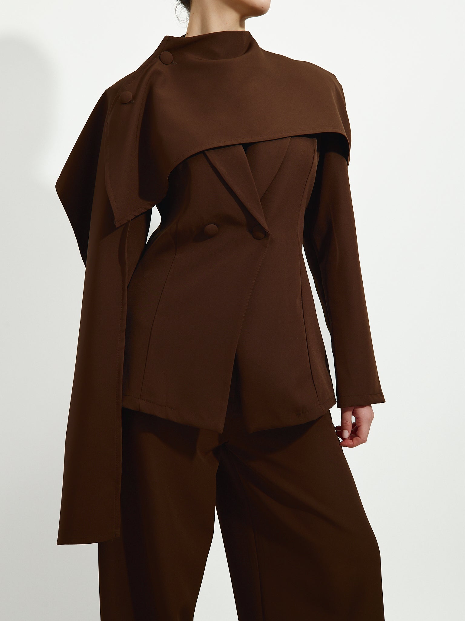 Conjunto de blazer e calças. O blazer tem modelagem cintada, fecha com dois botões efeito trespasse. As calças pantalonas têm caimento amplo, bolsos e fecho frontal com fecho e botão. Tem detalhe removível em efeito cachecol, aperta com dois botões.
