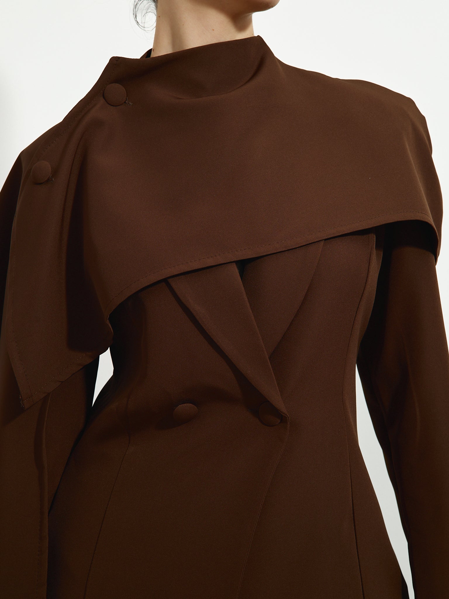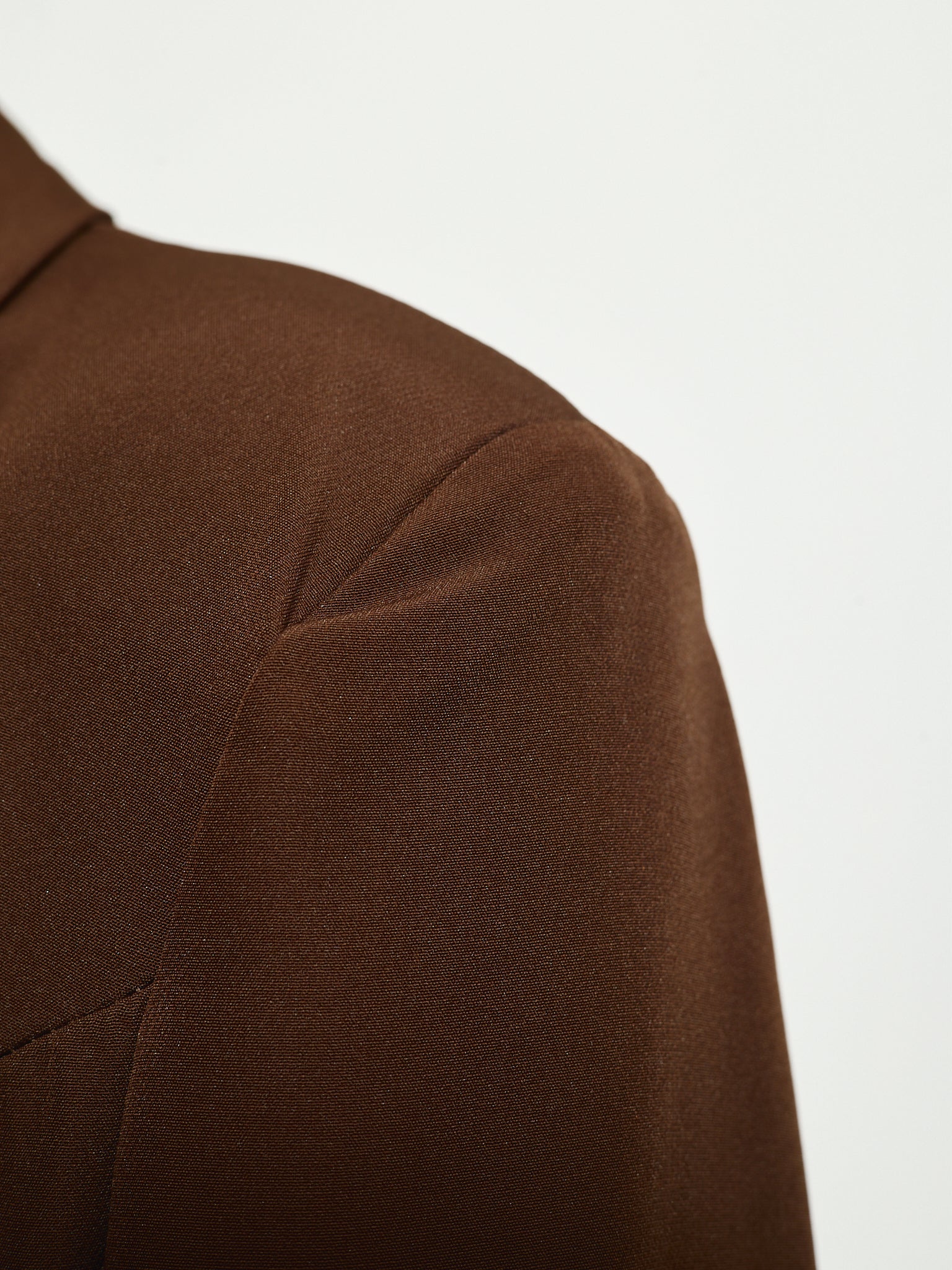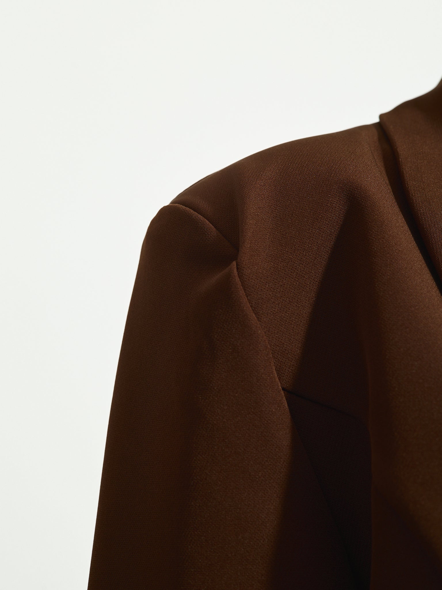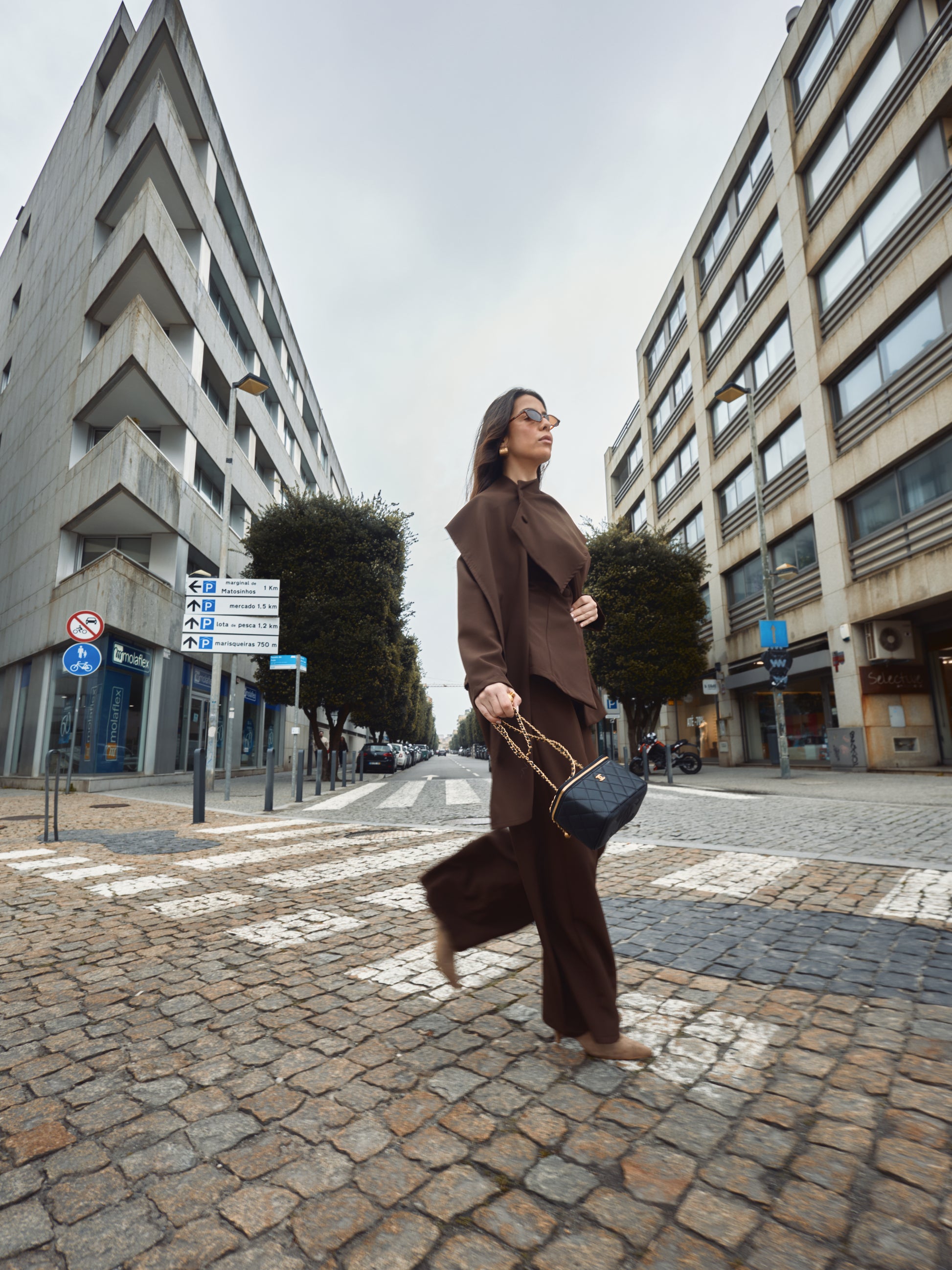 Conjunto de blazer e calças. O blazer tem modelagem cintada, fecha com dois botões efeito trespasse. As calças pantalonas têm caimento amplo, bolsos e fecho frontal com fecho e botão. Tem detalhe removível em efeito cachecol, aperta com dois botões.