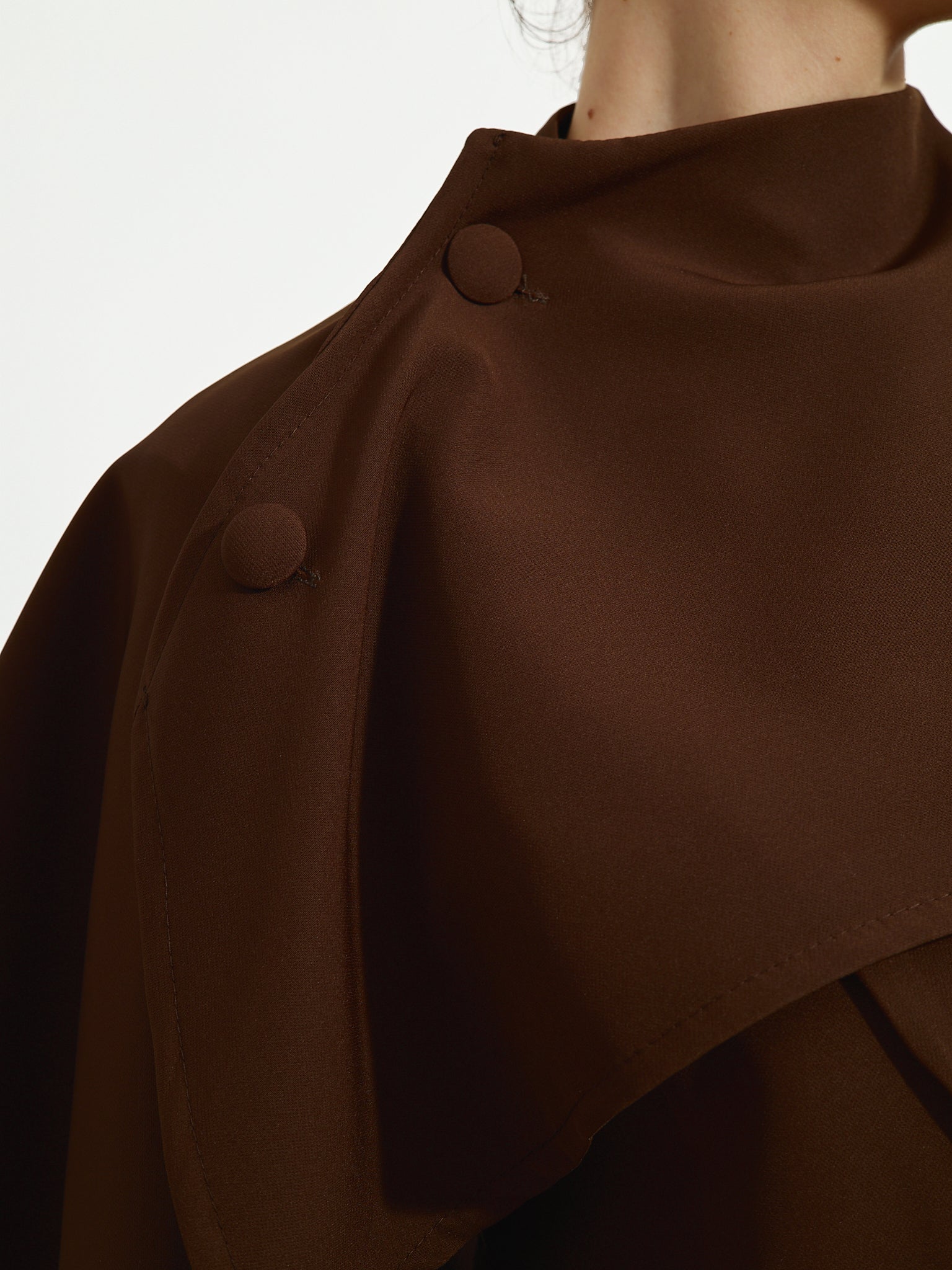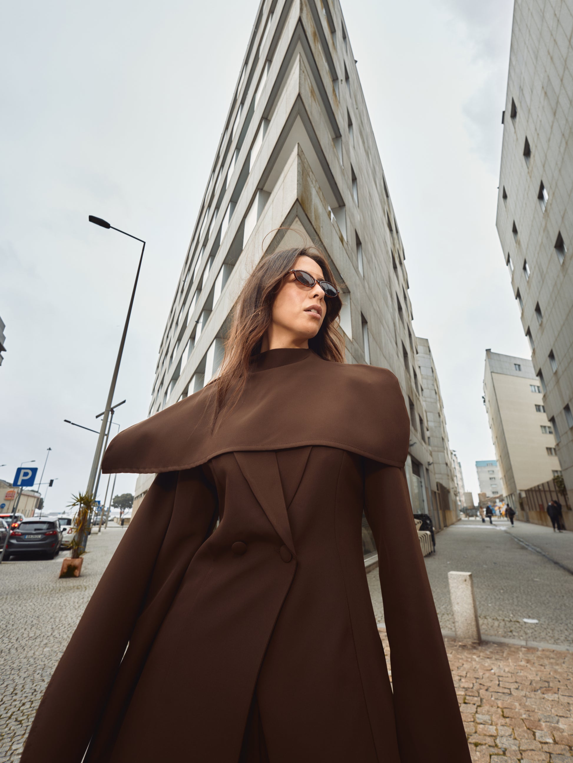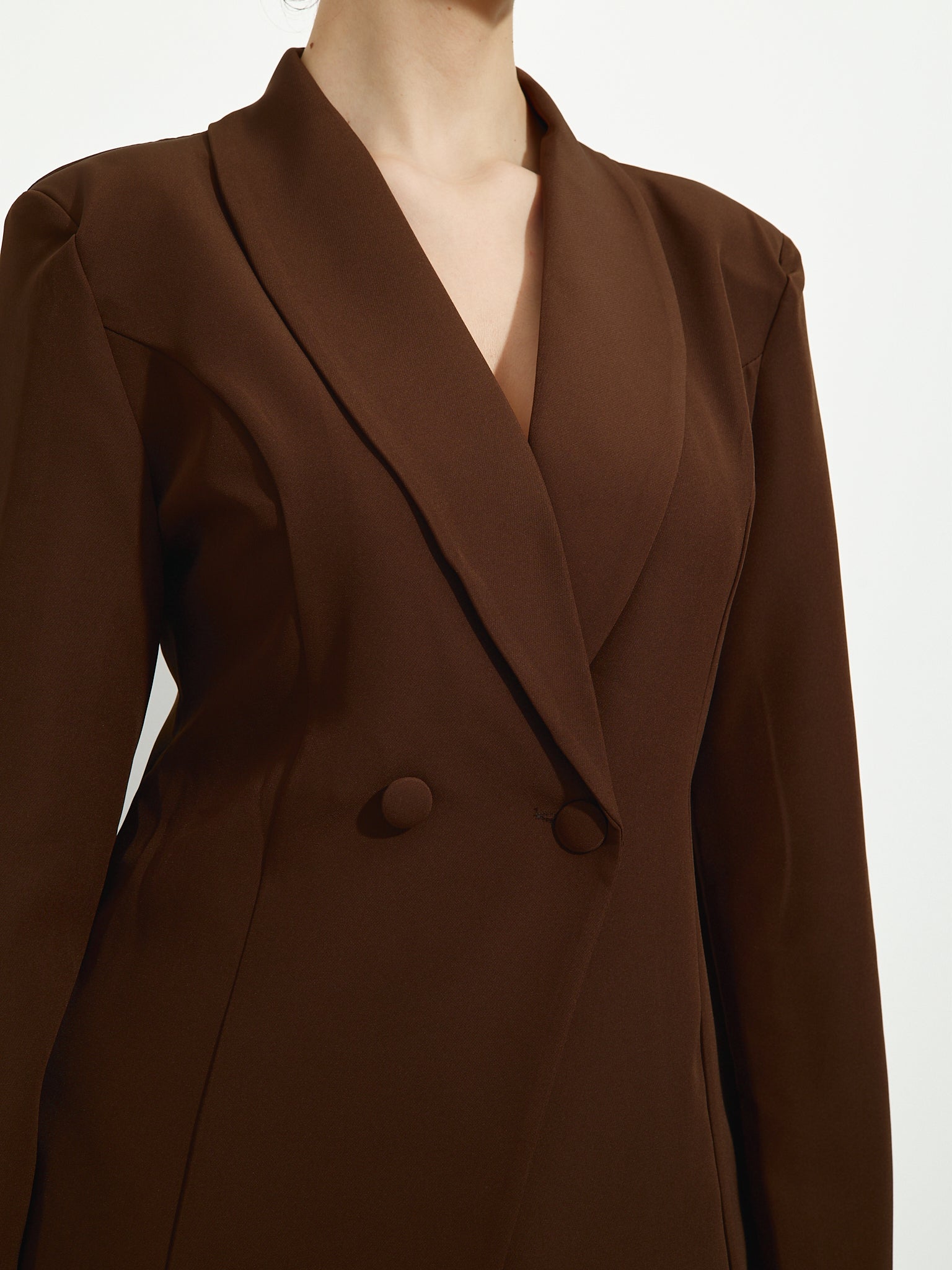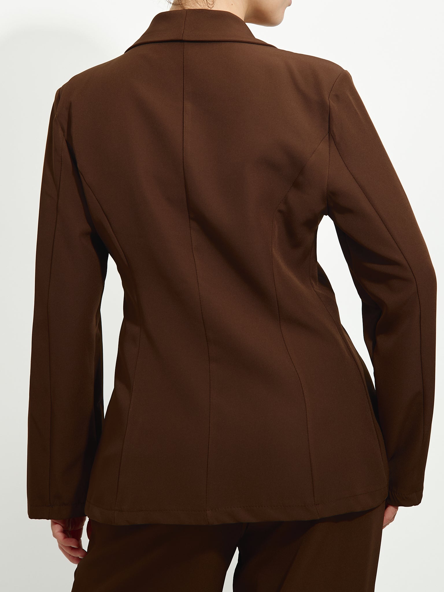 Conjunto de blazer e calças. O blazer tem modelagem cintada, fecha com dois botões efeito trespasse. As calças pantalonas têm caimento amplo, bolsos e fecho frontal com fecho e botão. Tem detalhe removível em efeito cachecol, aperta com dois botões.