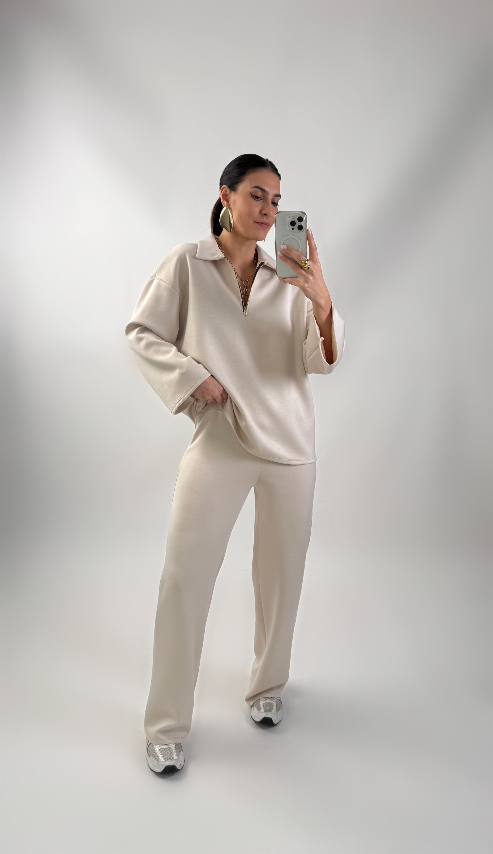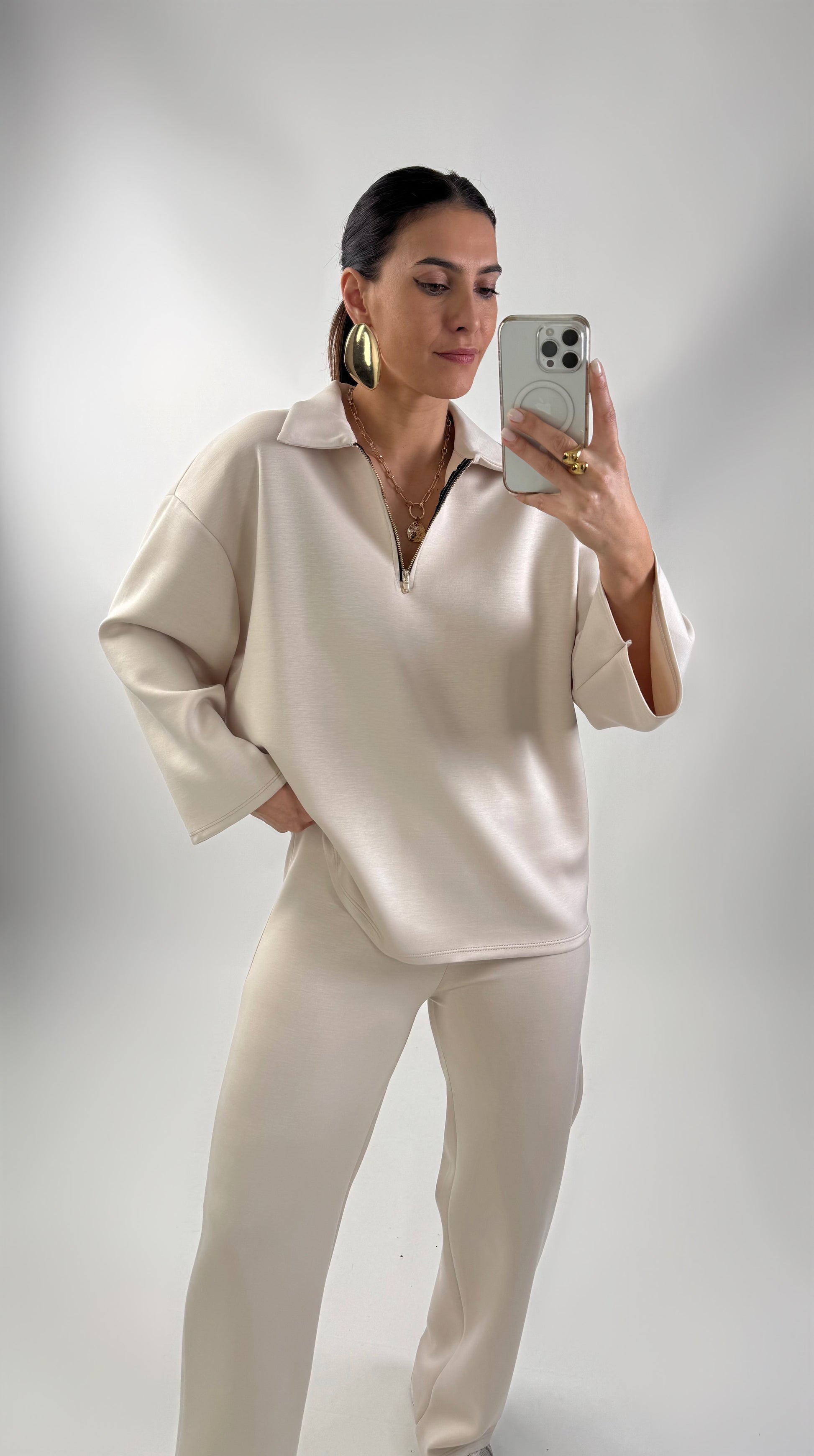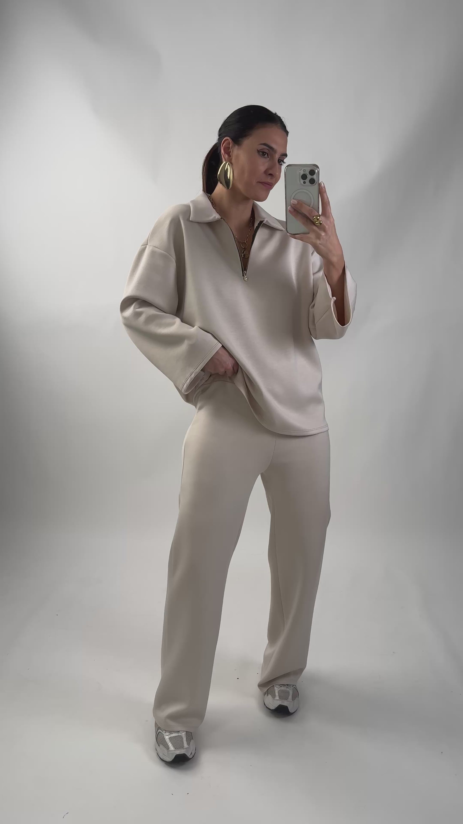 Trainingspak van viscose en polyester met stretch. De stof is heerlijk zacht, de broek heeft een rechte pasvorm en een elastische tailleband. Het shirt heeft een oversized effect en sluit met een rits. De mouwen zijn driekwart, wijd. One size fits all. S naar de L.