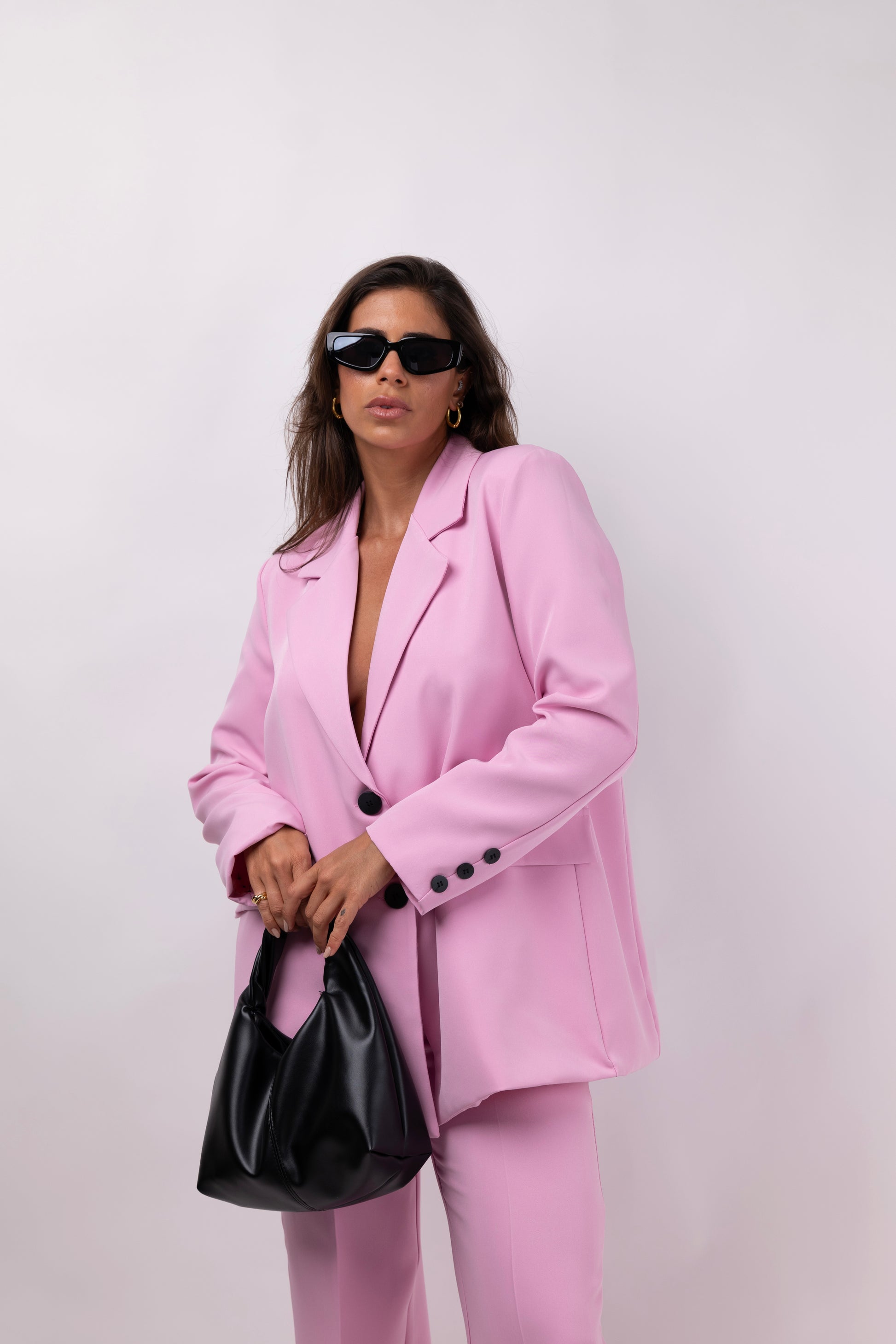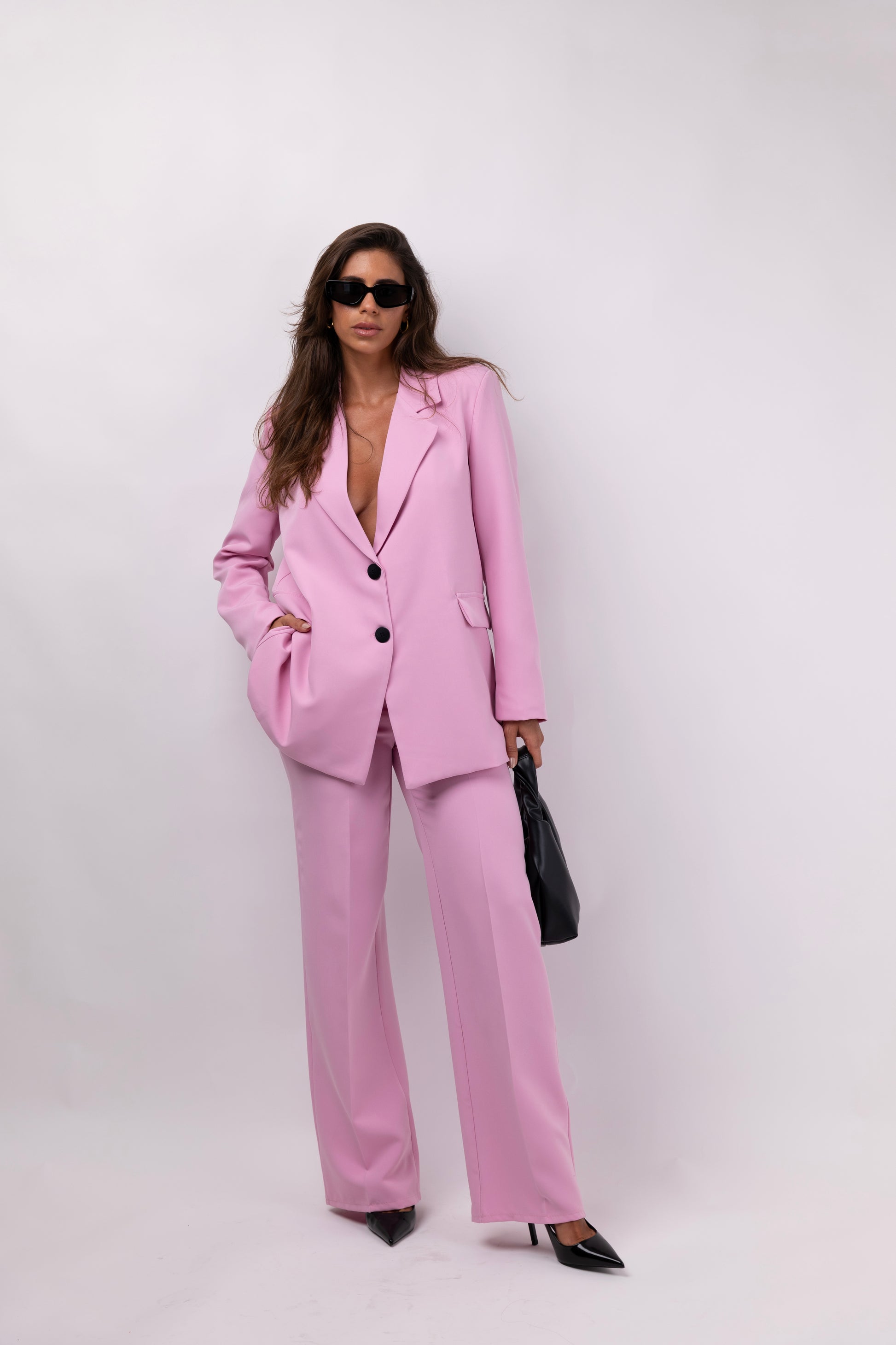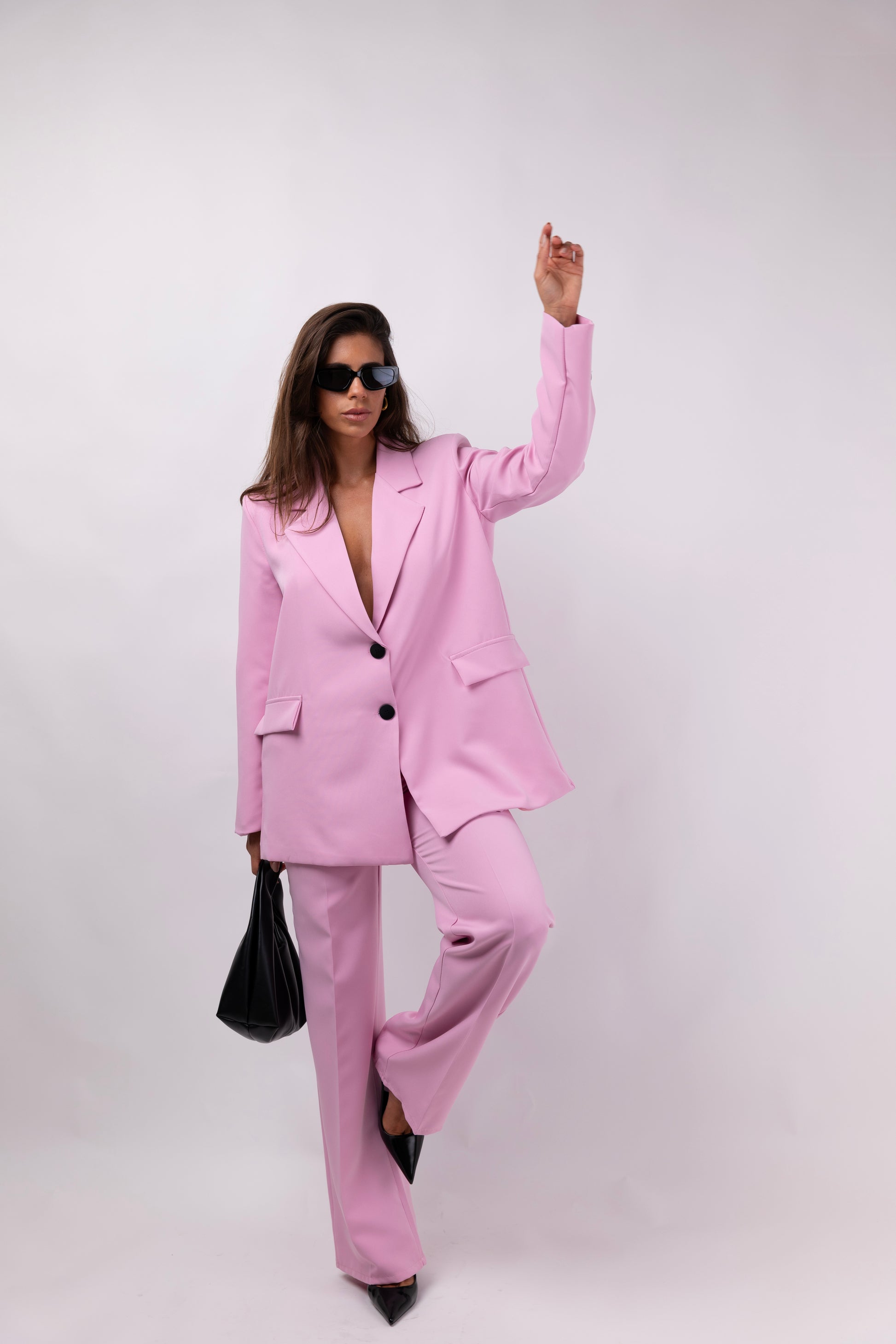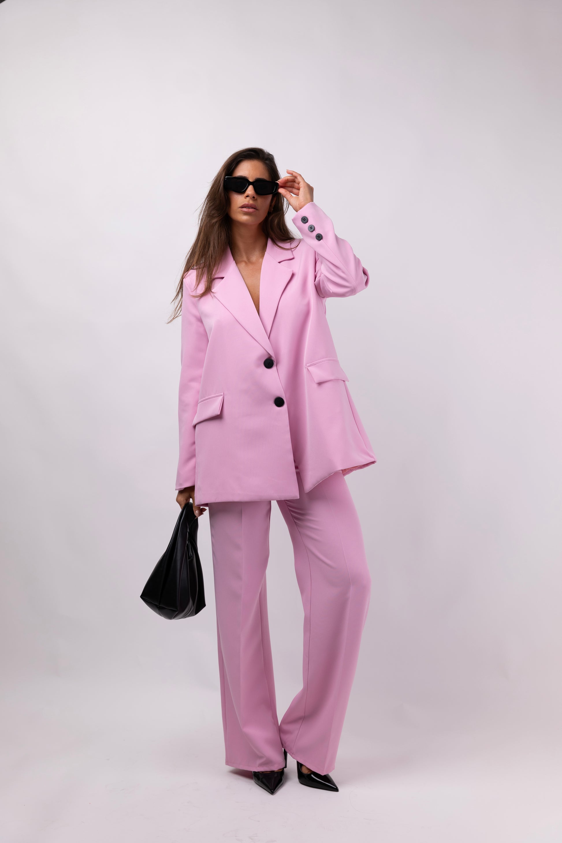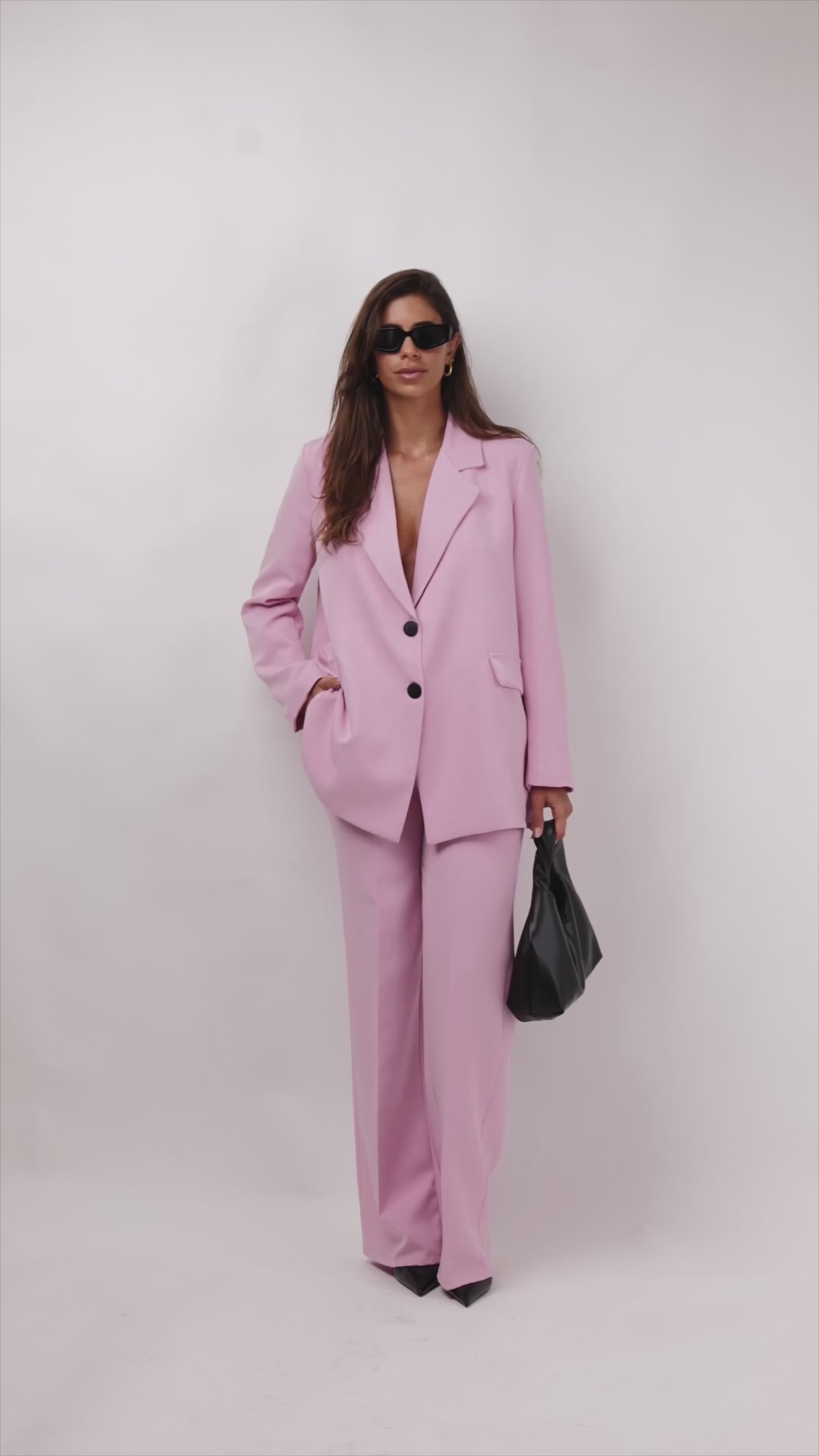 Pak bestaande uit een pantalon en een blazer. De pantalon is recht gesneden, heeft een elastische tailleband met riemlussen, een rits- en knoopsluiting en zakken. De blazer is oversized, sluit met knopen en is volledig gevoerd.