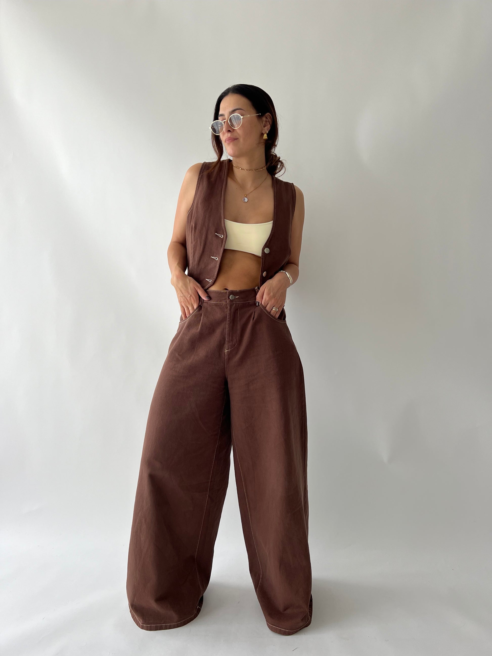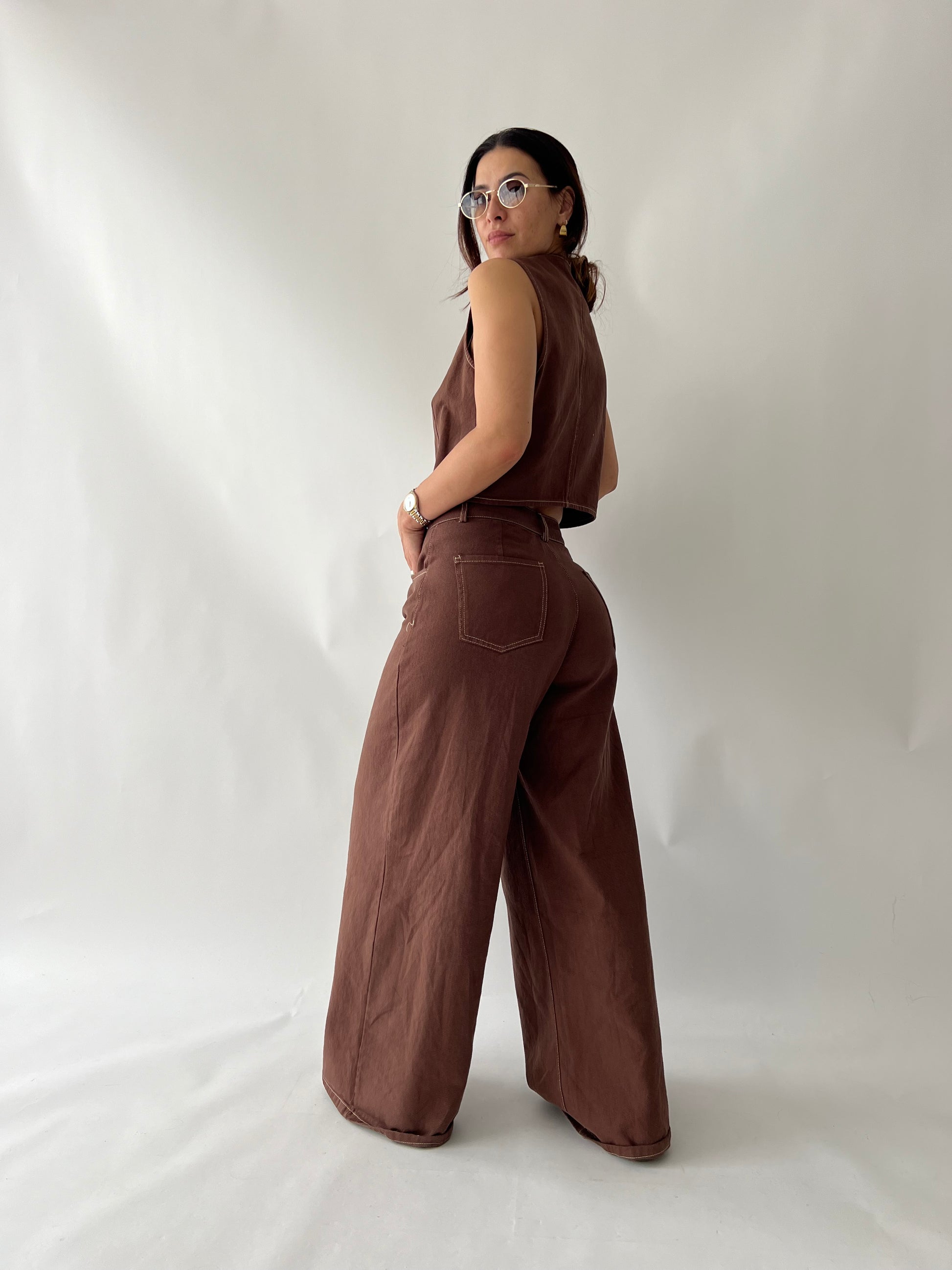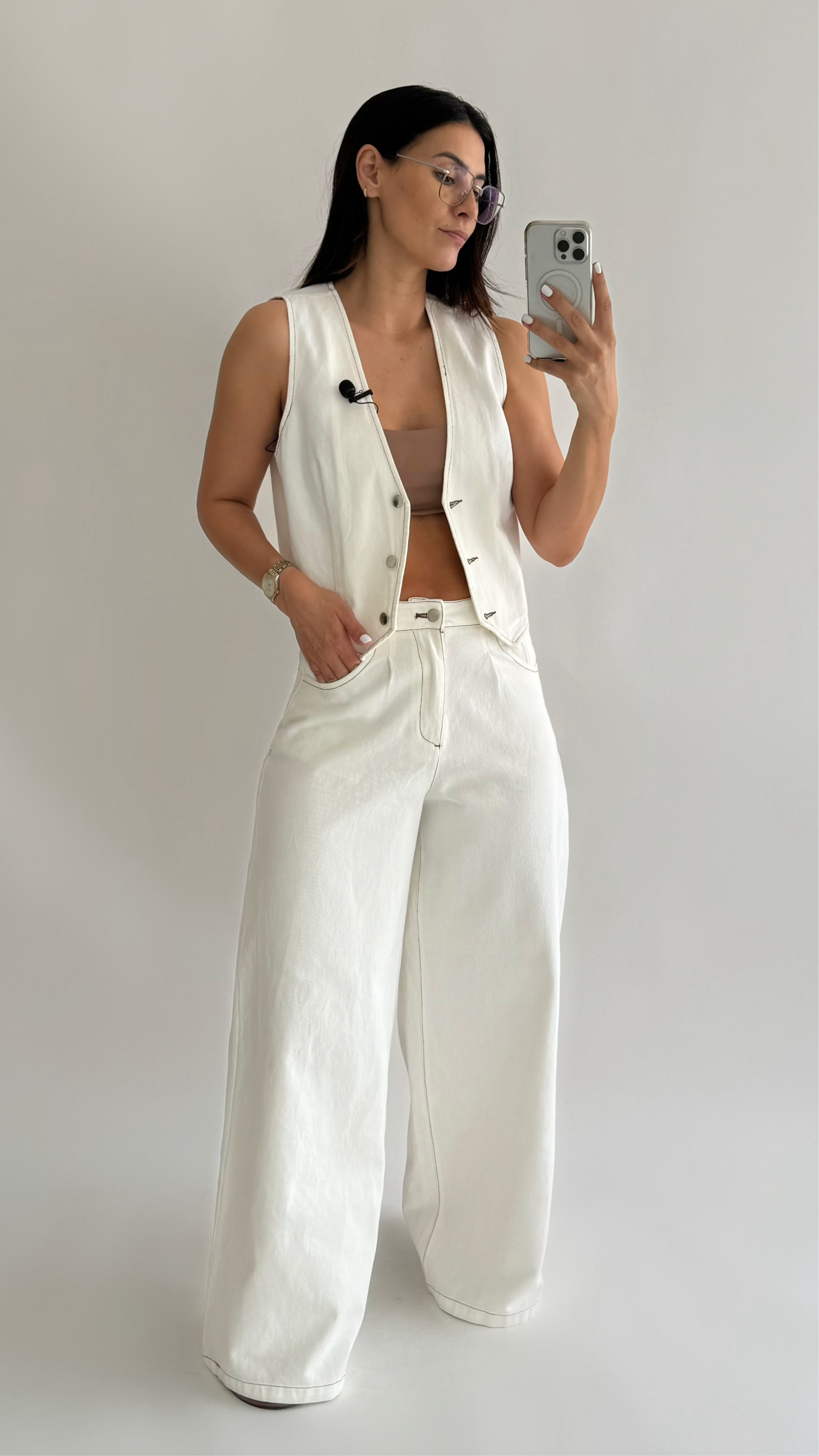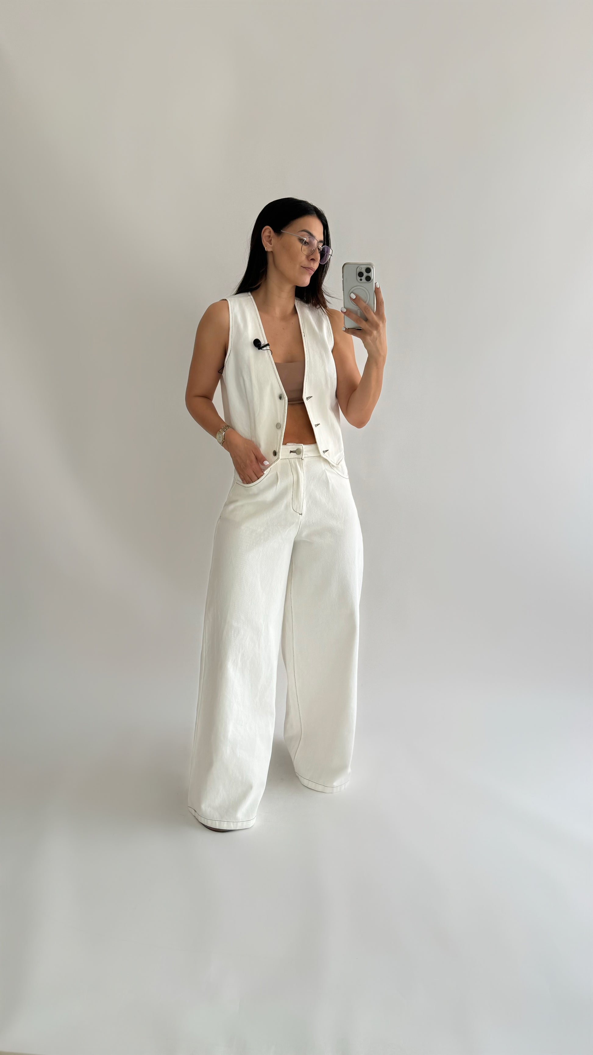 Jeans met hoge taille en wijde pijpen. Wit/crème contraststikseldetail. Het model maakt gebruik van de M. Vest sluit met zilveren knopen aan de voorkant.