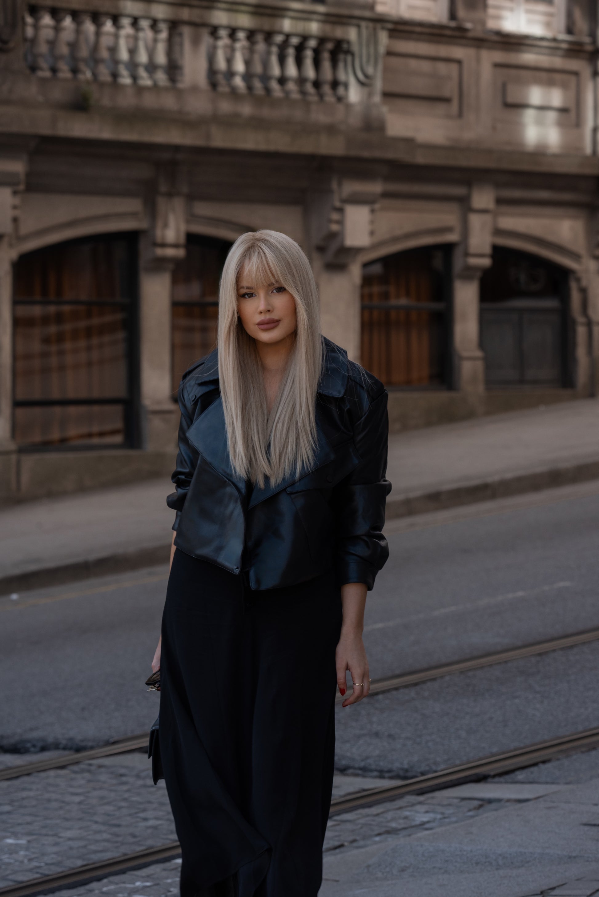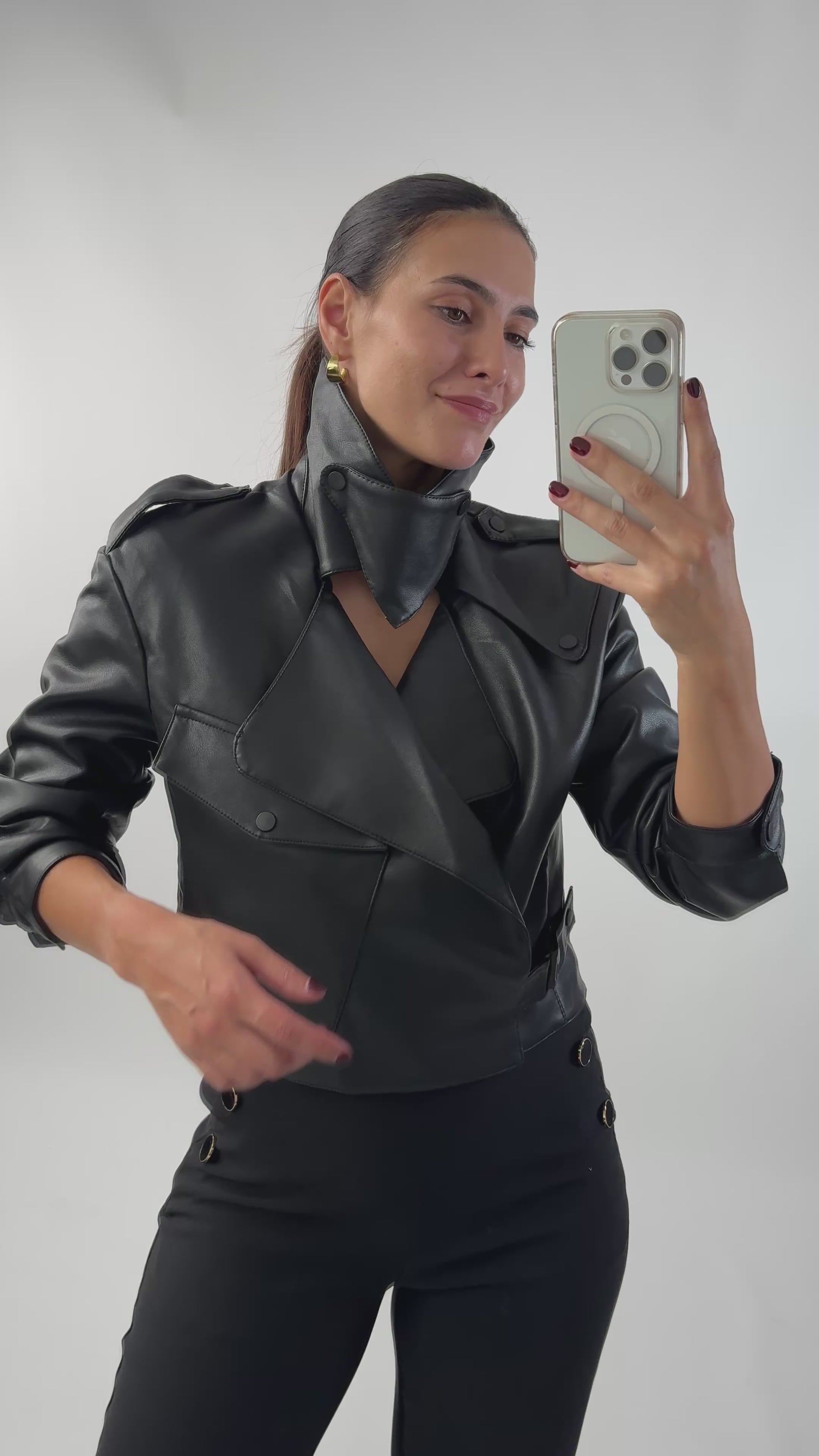 Eco-leren jasJas gevoerd met eco-leer met een zak linksvoor. Voorzien van een afneembare V-hals in dezelfde stof. Sluit met een double-breasted effect en sluit met verstelbare drukknopen. De manchetten sluiten met drukknopen.