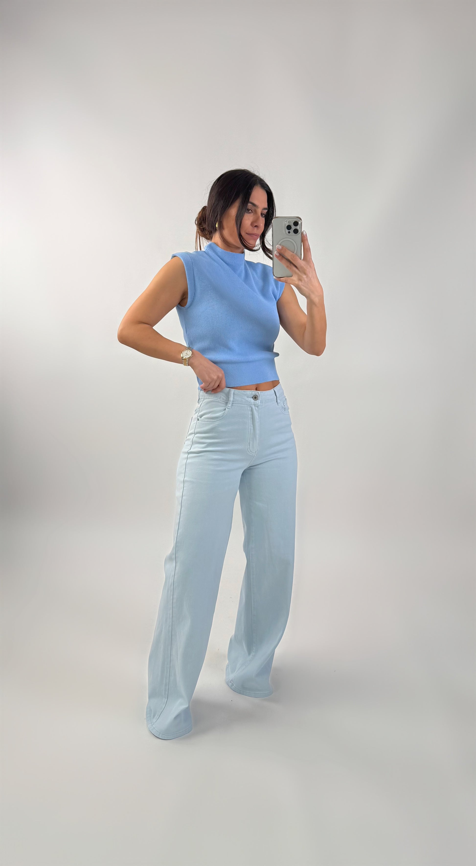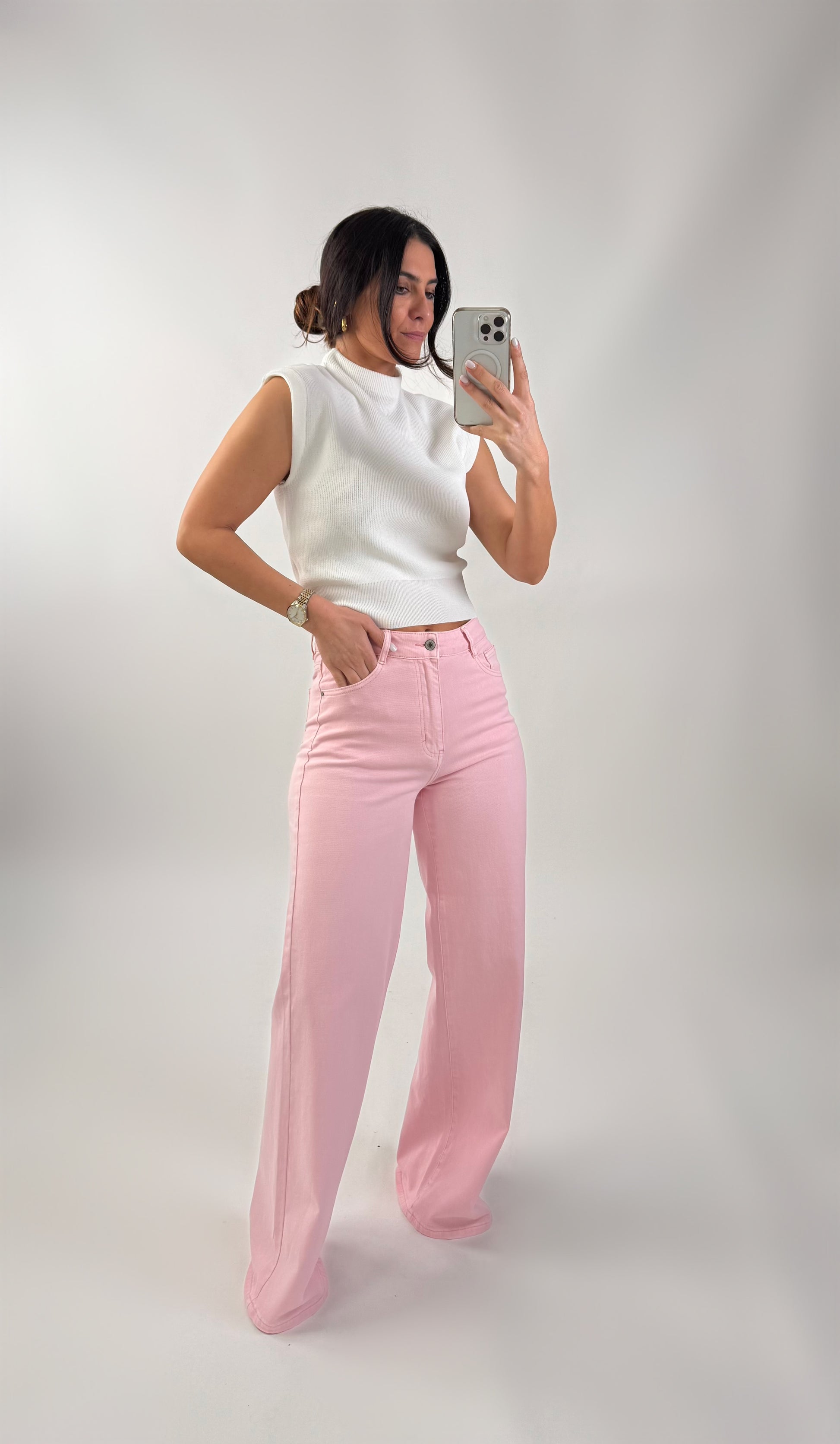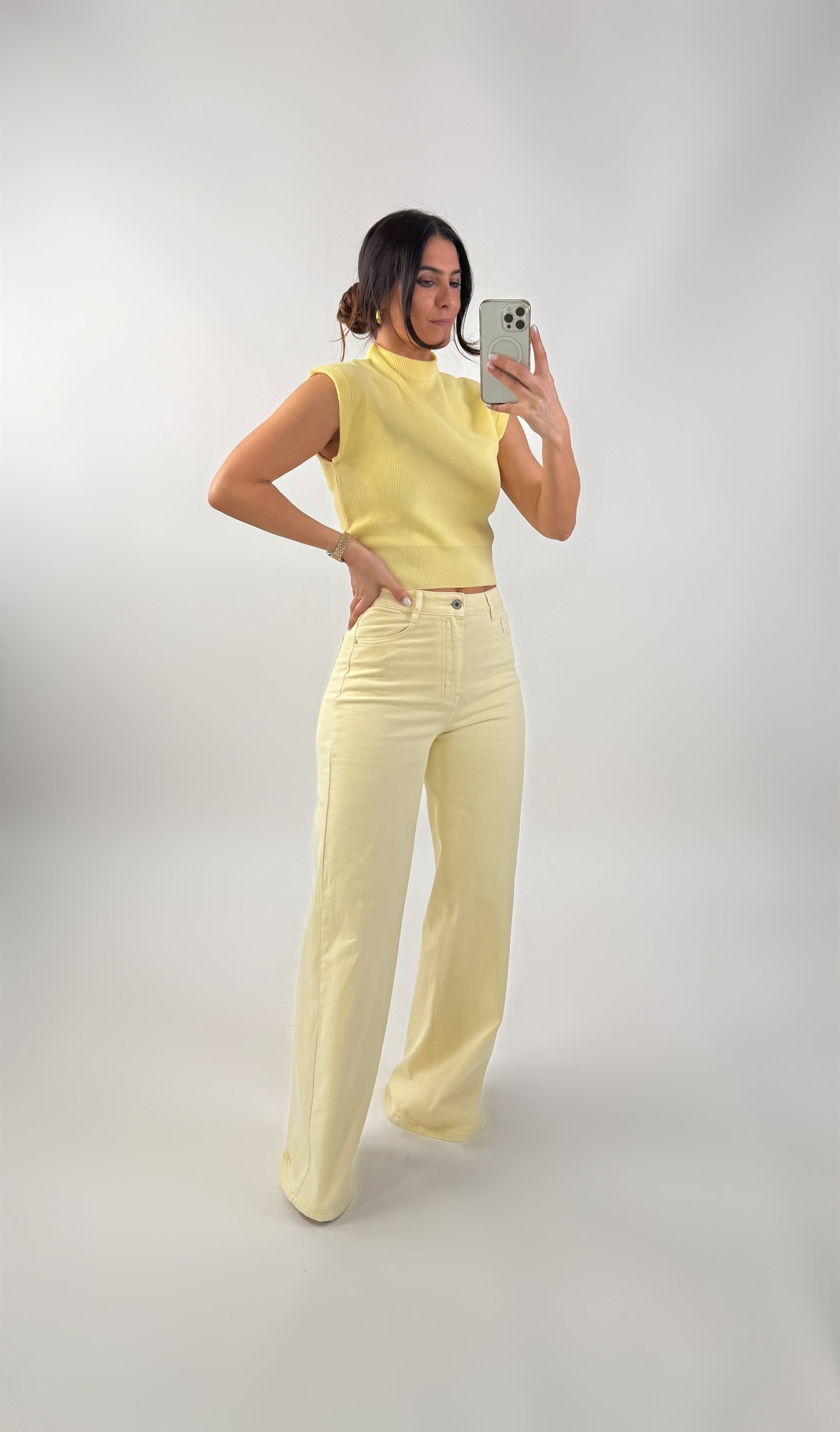 Wijde jeans. Hoge taille. Stretchstof, rits- en knoopsluiting, riemlussen en zakken. Zit je tussen twee maten in? Kies dan de kleinere maat.