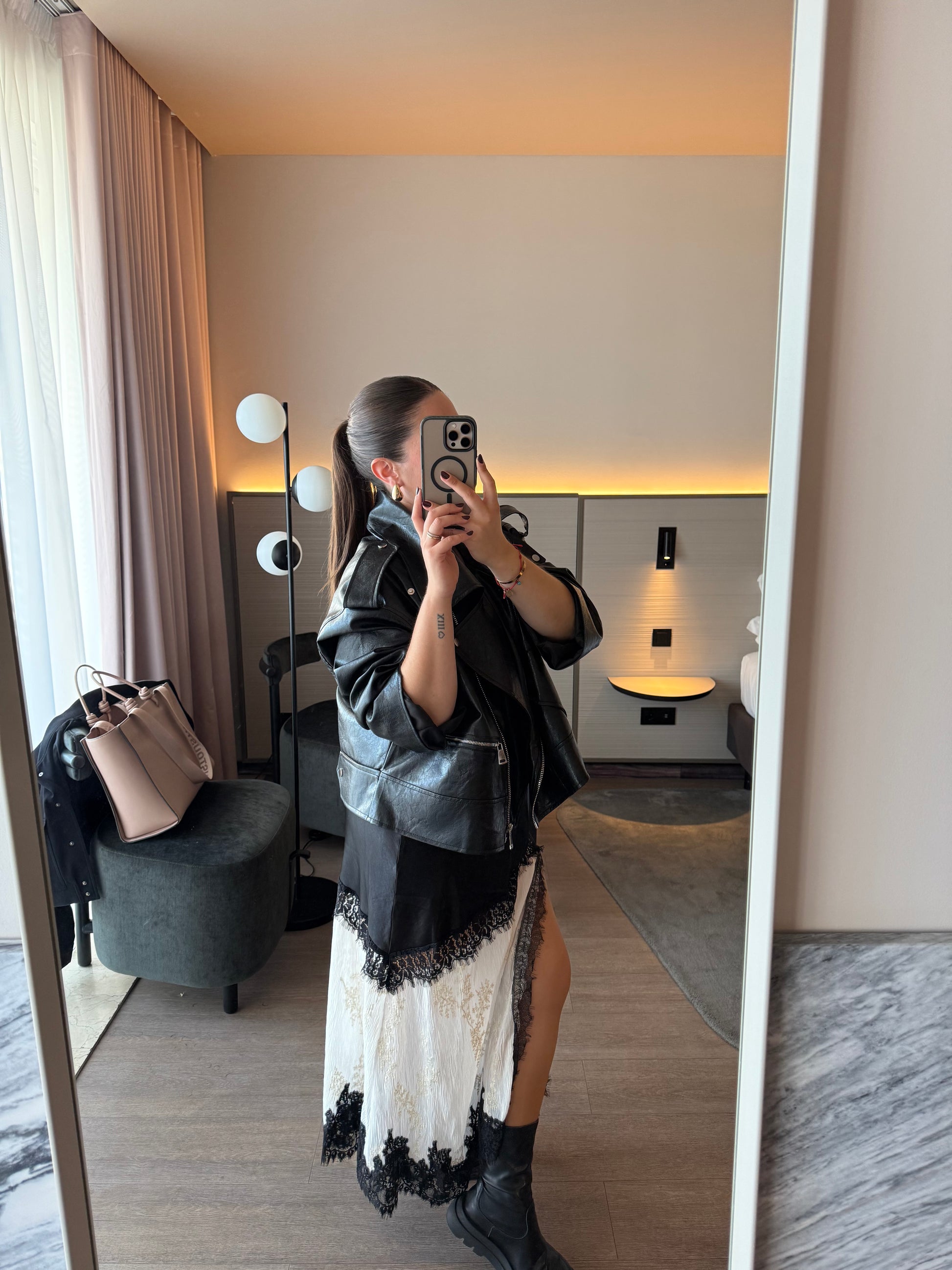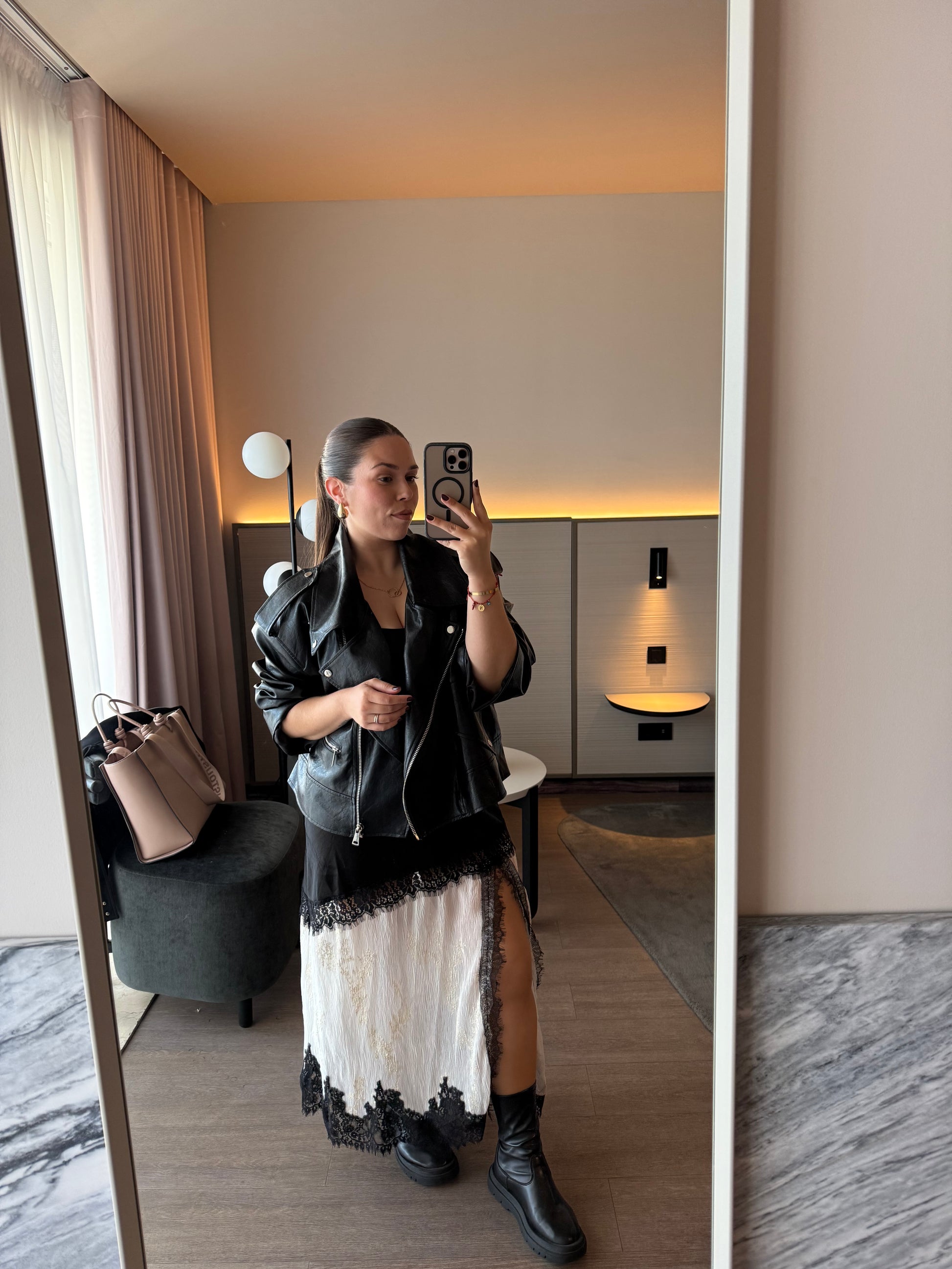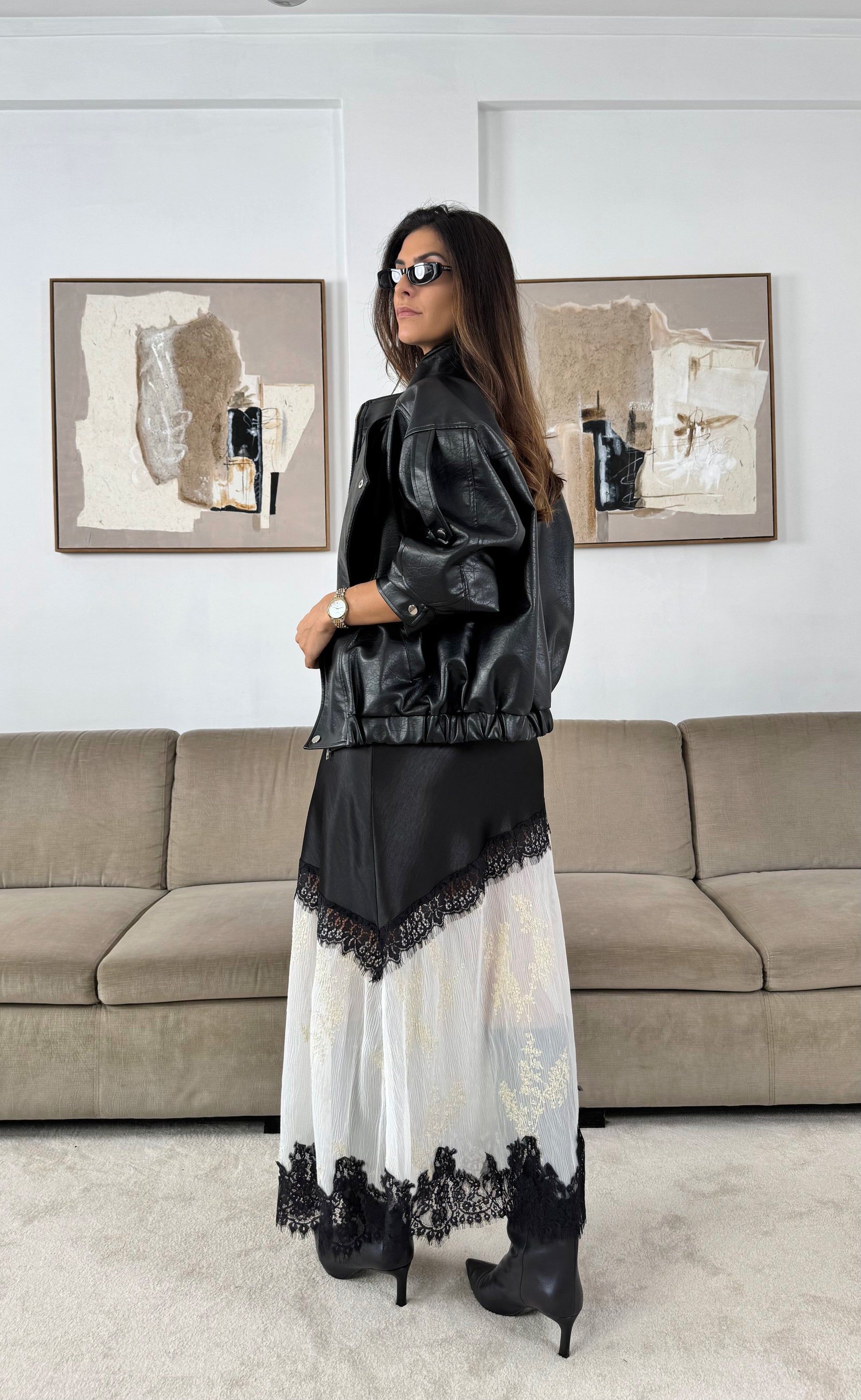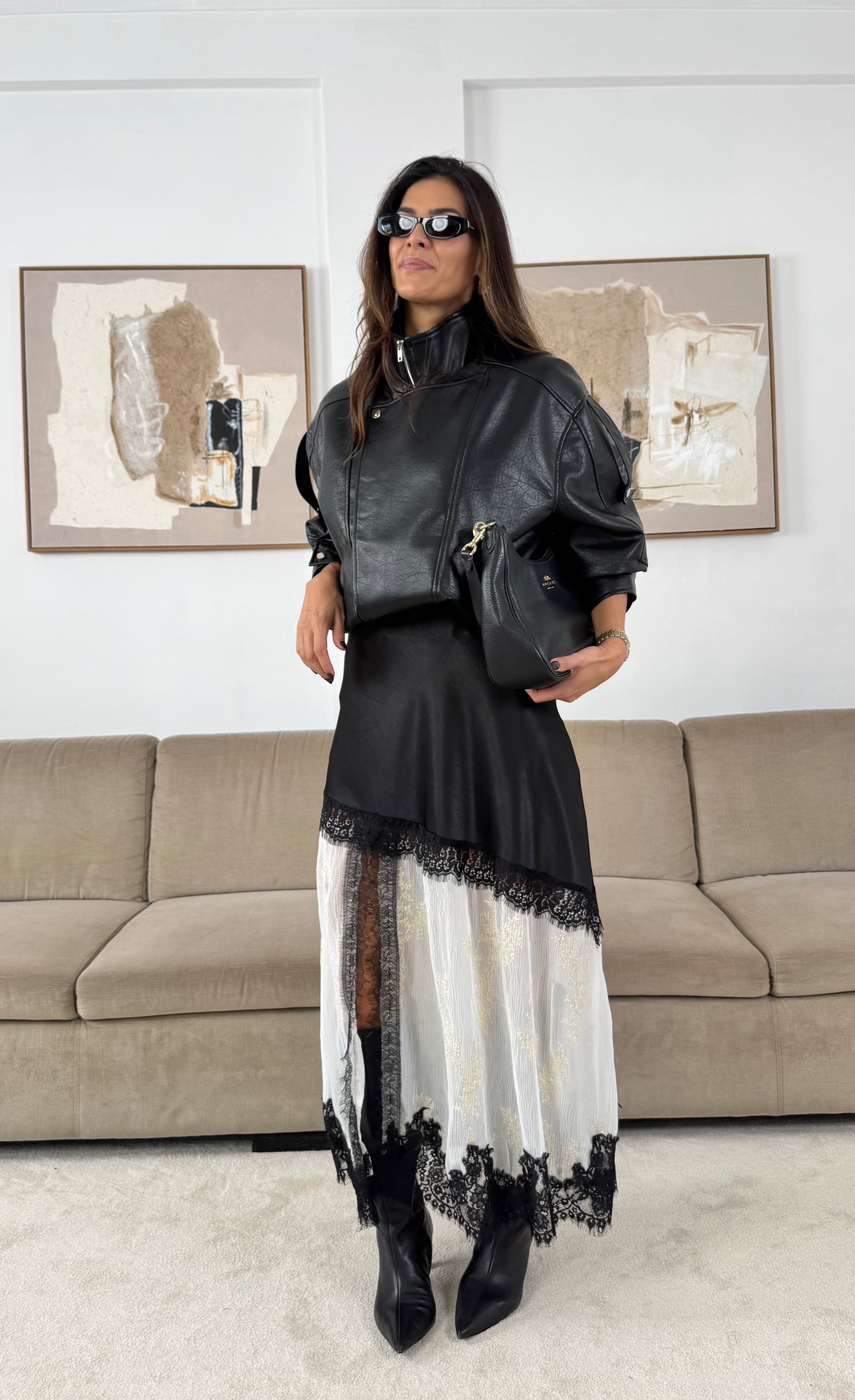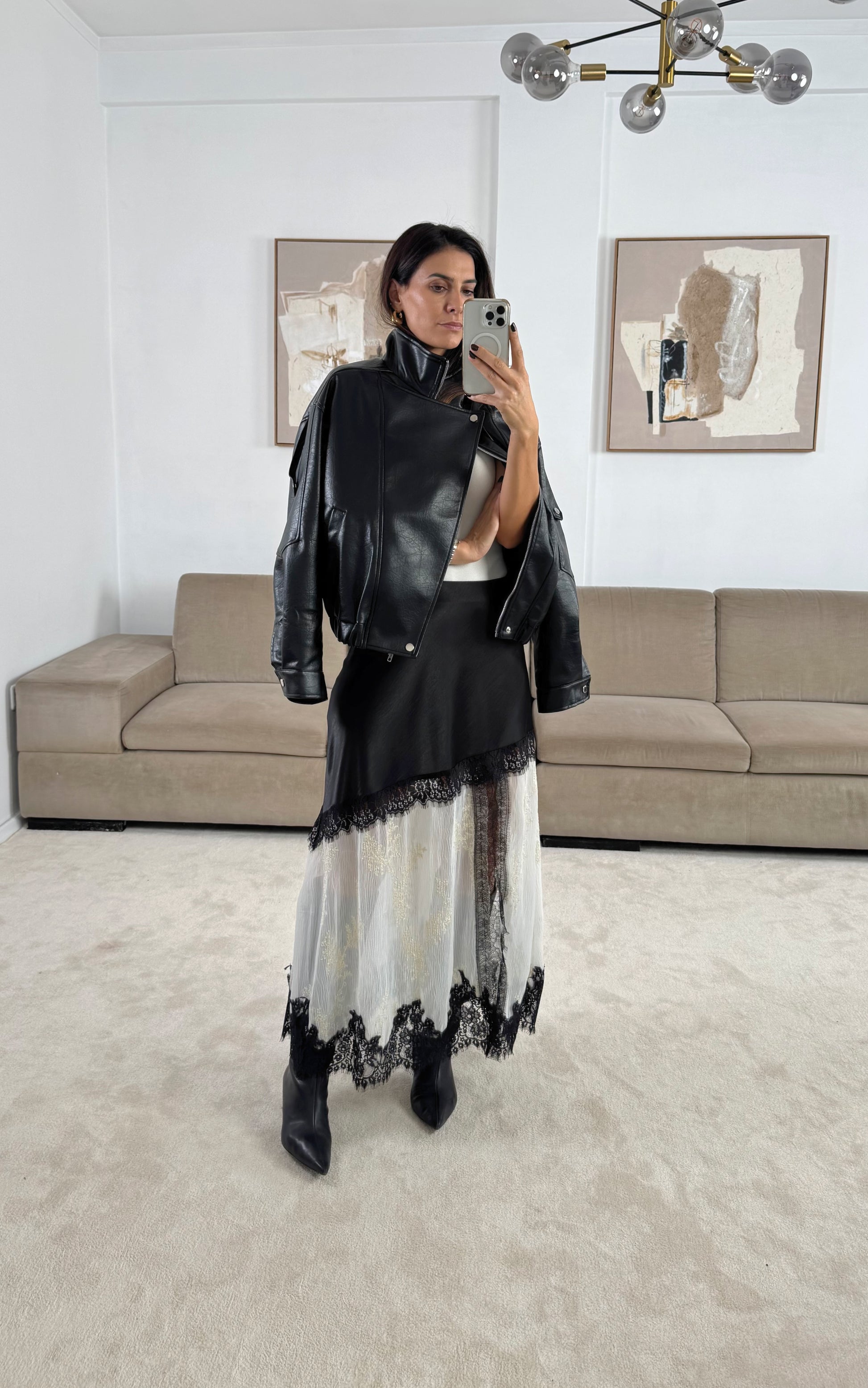 Saia midi com parte superior em efeito cetim na cor preto e parte inferior em tecido leve branco com renda preta e detalhes dourados. Possui cintura elástica para maior conforto e racha lateral à esquerda.