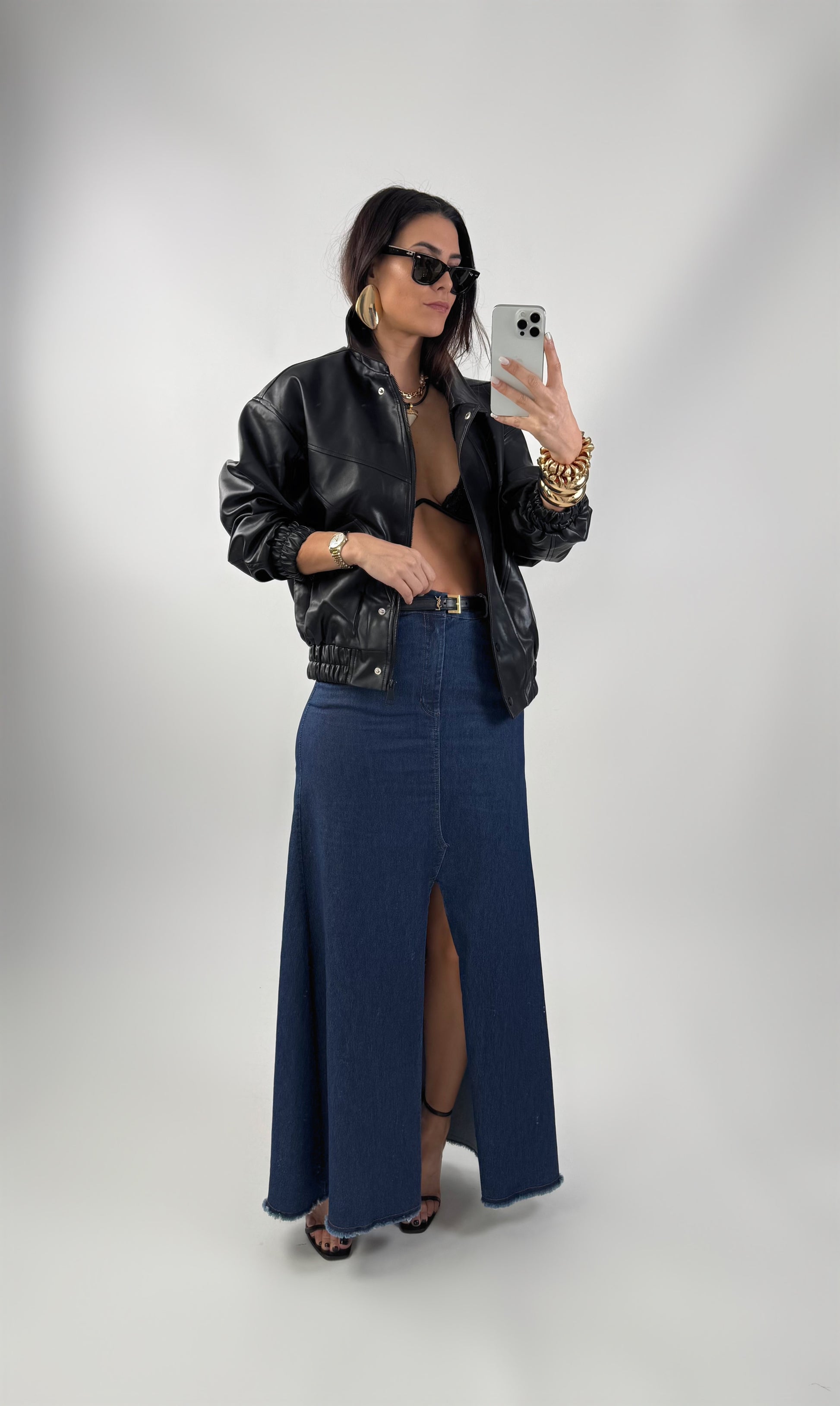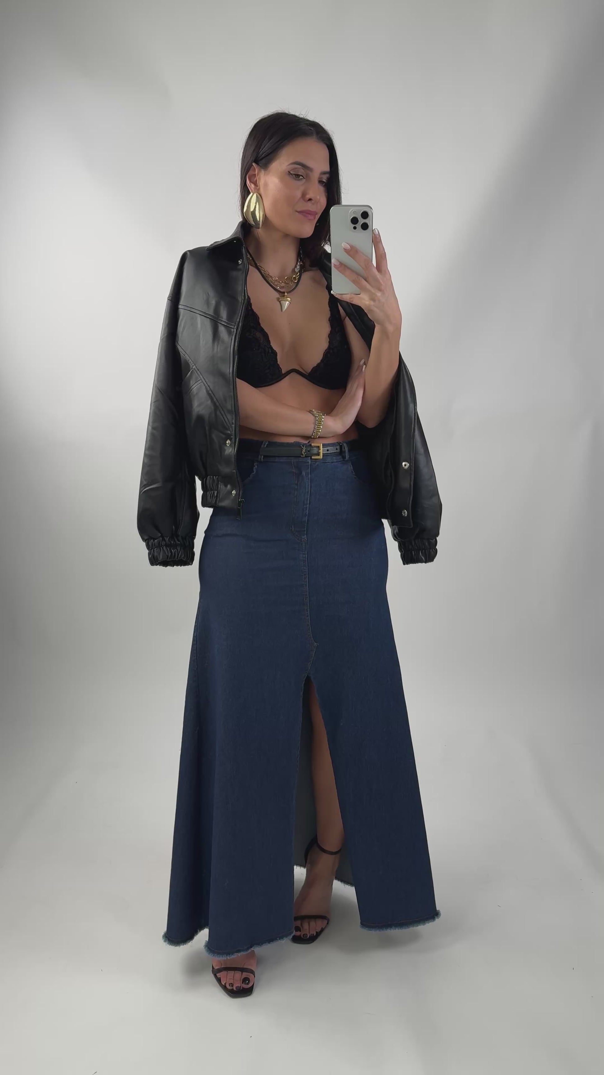 Midirok van stretchdenim. Met gerafelde zoom, een opening aan de voorkant, zakken en riemlussen, inclusief een nappaleren riem. Sluit met een rits en knoop.