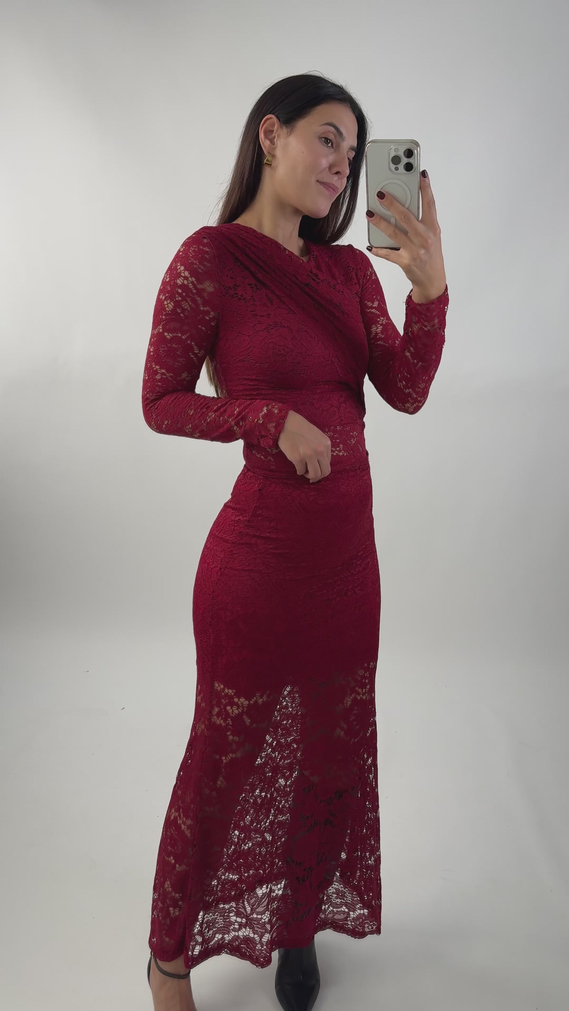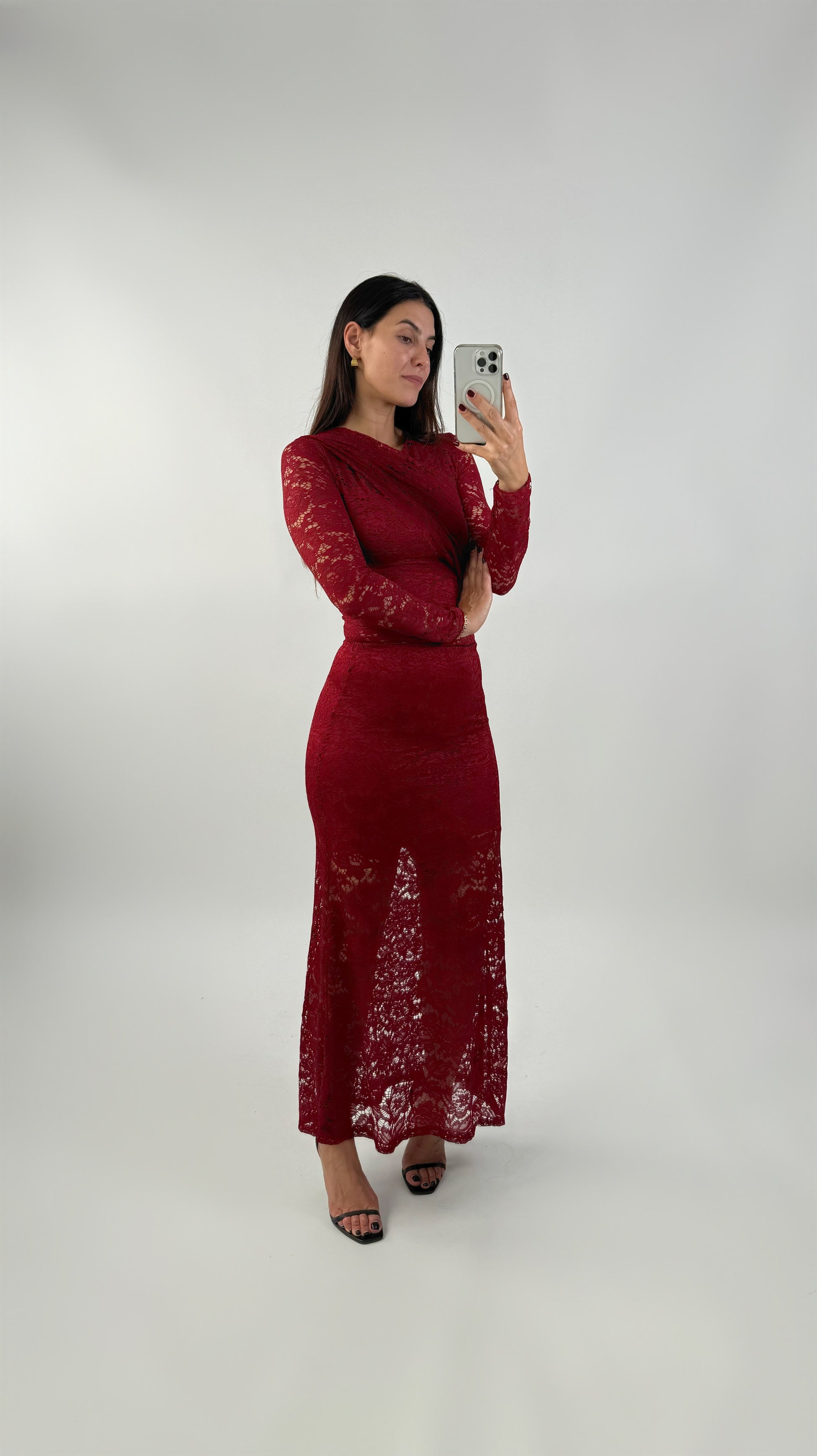 Set bestaande uit een kanten rok en een hemdje. Het hemdje is asymmetrisch, rekbaar en heeft een dubbel kanten detail in een kruis op de overgang van schouder naar taille.Aia heeft tule en voering in een kortere, ondoorzichtige rok. Hij heeft een elastische tailleband. Hij draagt S naar de L.