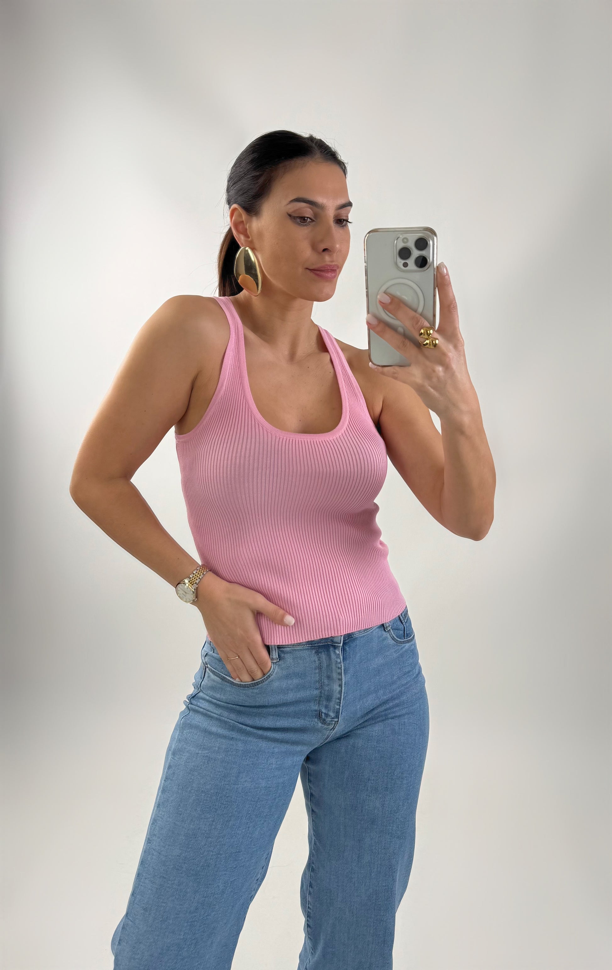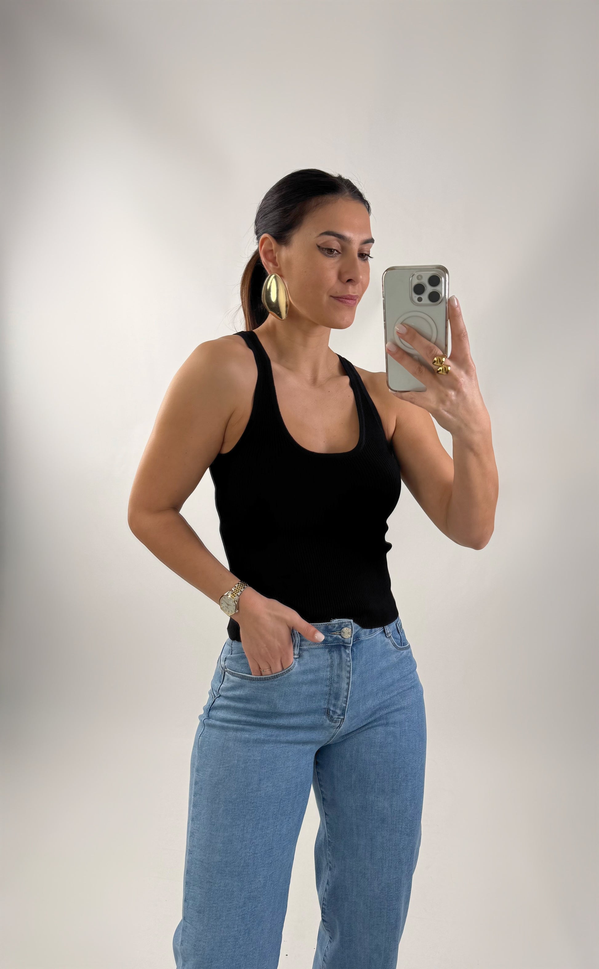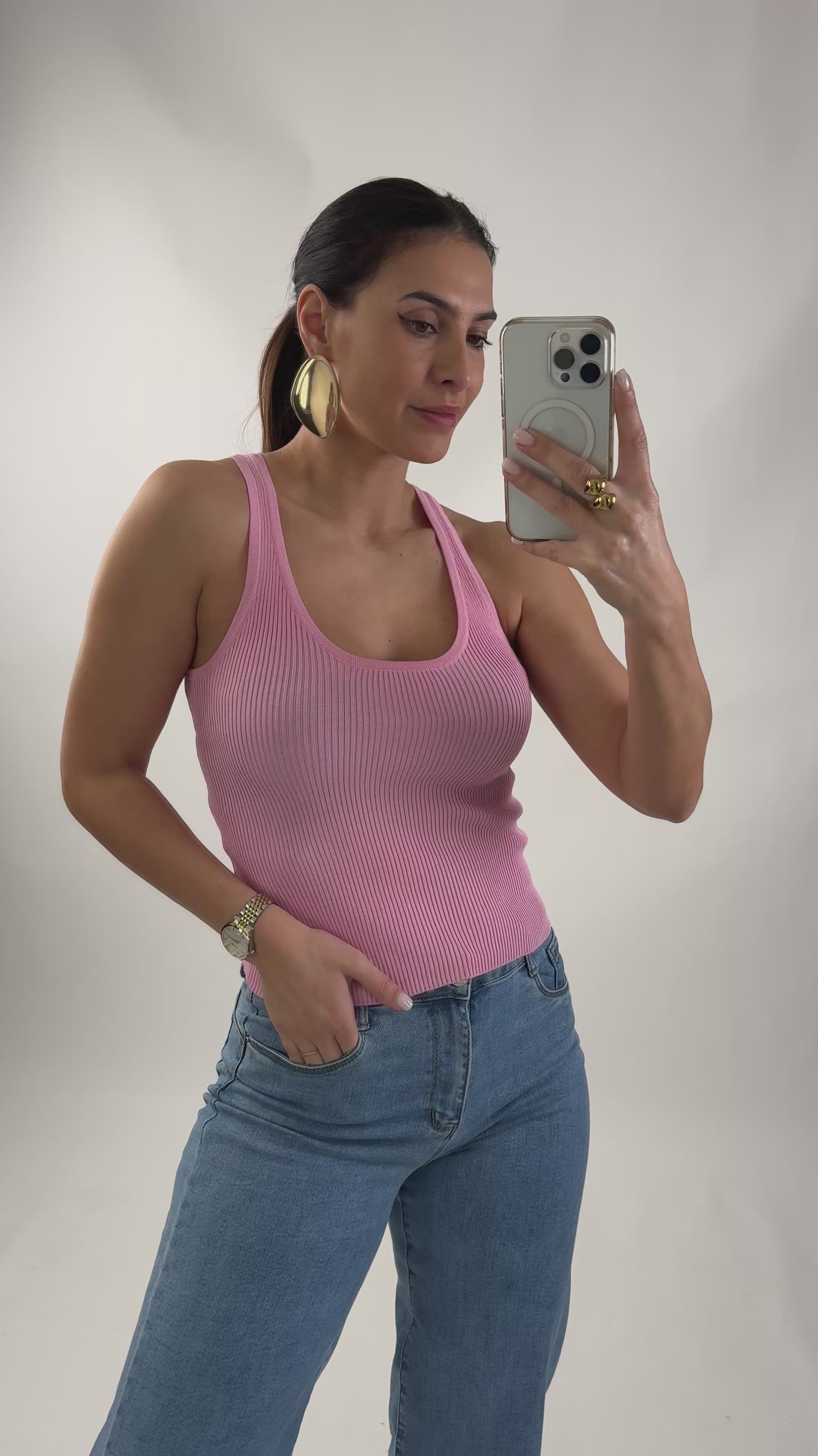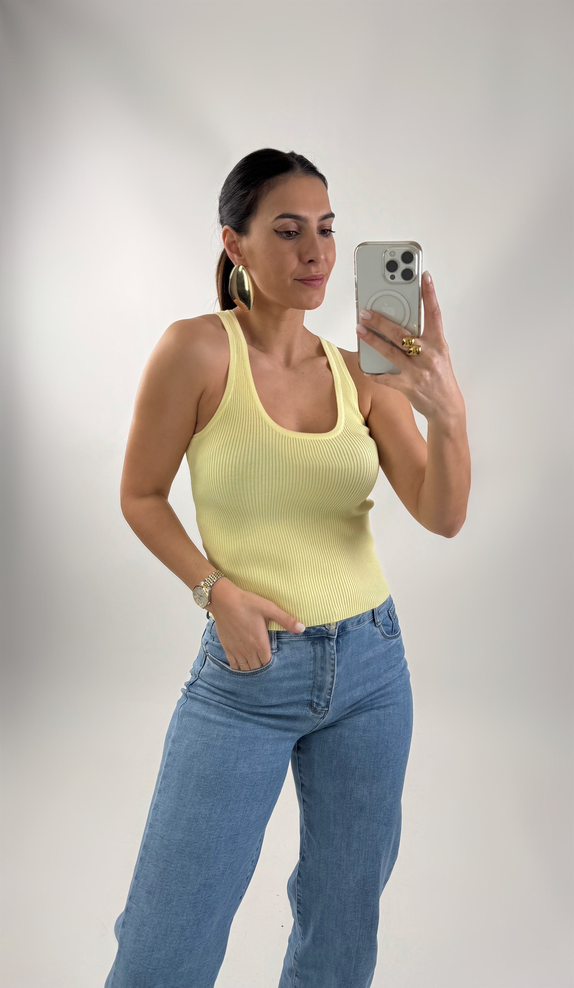 Geribbelde viscose top met stretch. Halterhals. One size fits all. S naar de L.