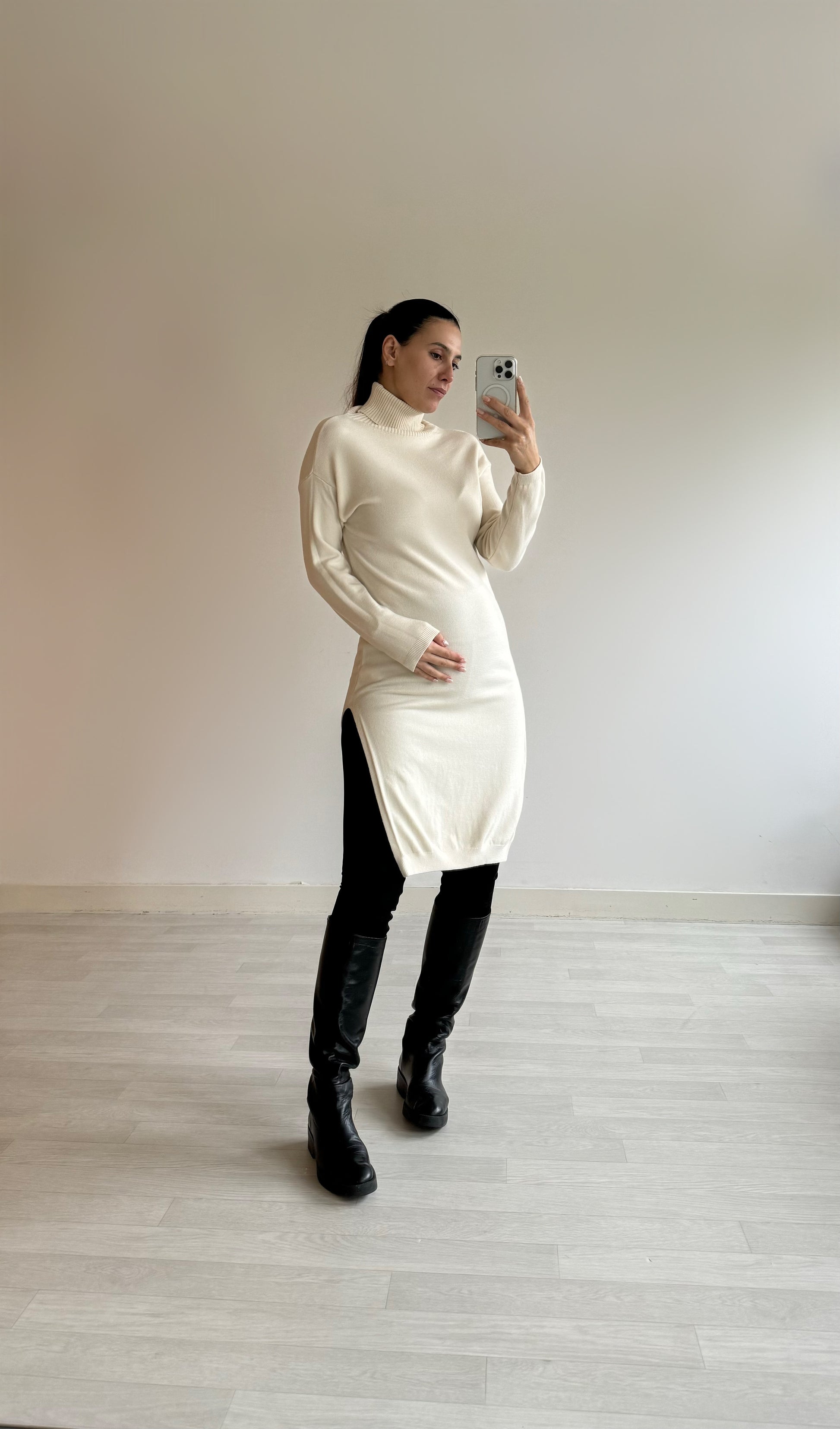 Zacht aanvoelende gebreide tuniek, hoge kraag, 100% ondoorzichtig. One size fits all met elasticiteit. Kleed je goed XS naar de L