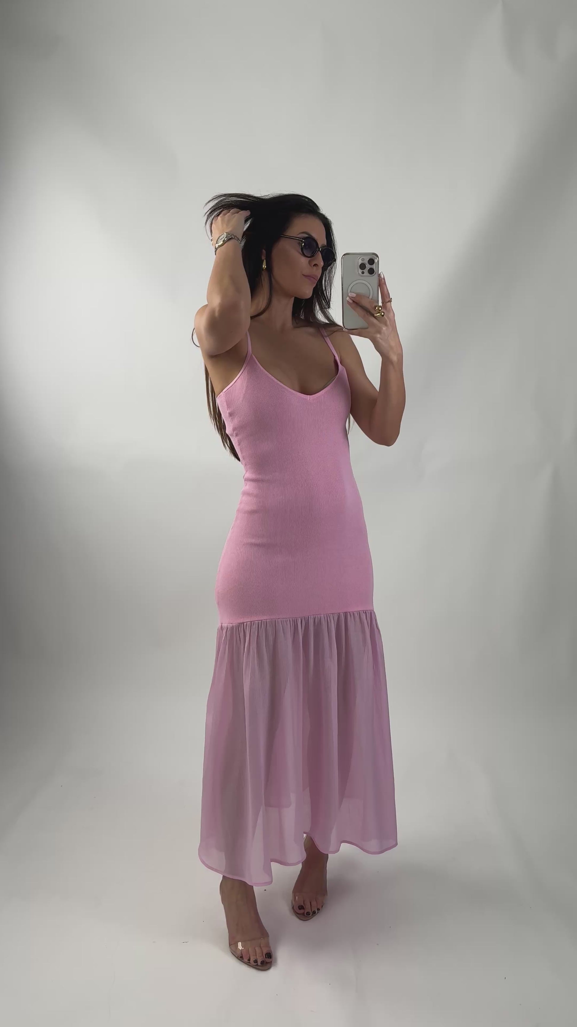 Midi-jurk van fijngebreide en geplooide stof. Met stretch, verstelbare bandjes en een V-hals.