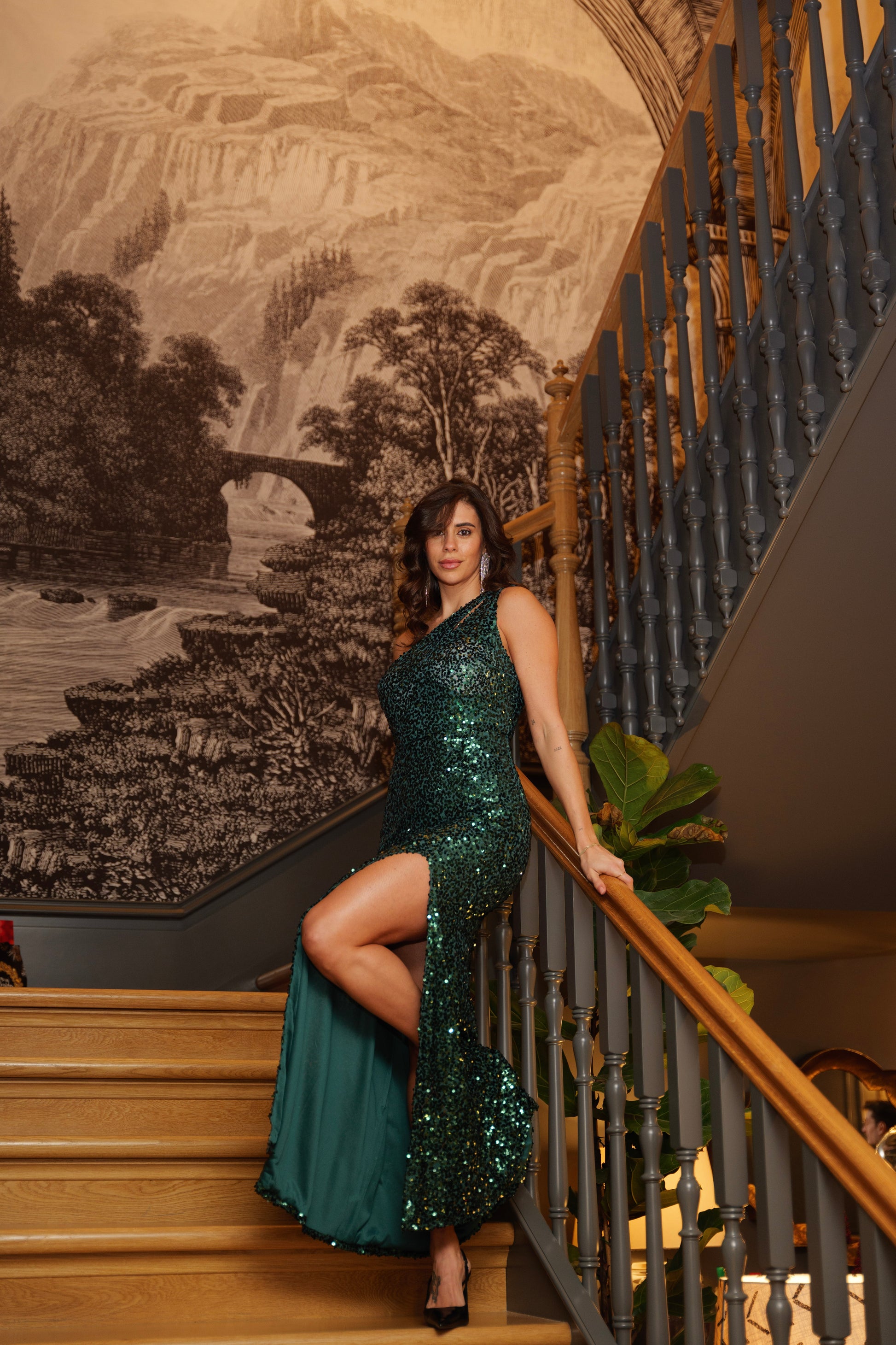 Lange paillettenjurk met contrasterende voering. De jurk heeft een gewatteerde buste, een opening aan de voorkant en een halslijn tot over de schouder. De jurk sluit met een verborgen rits.