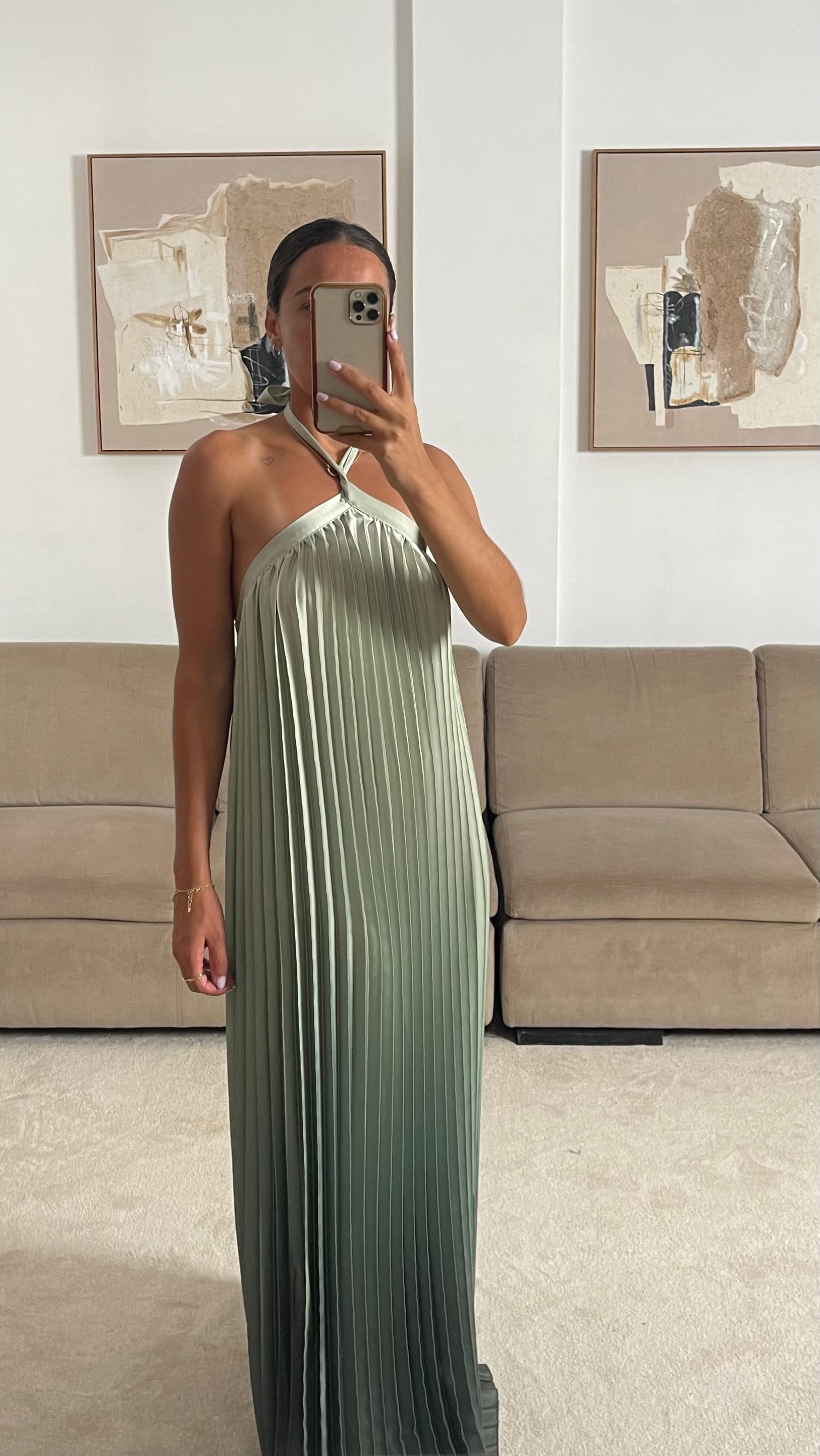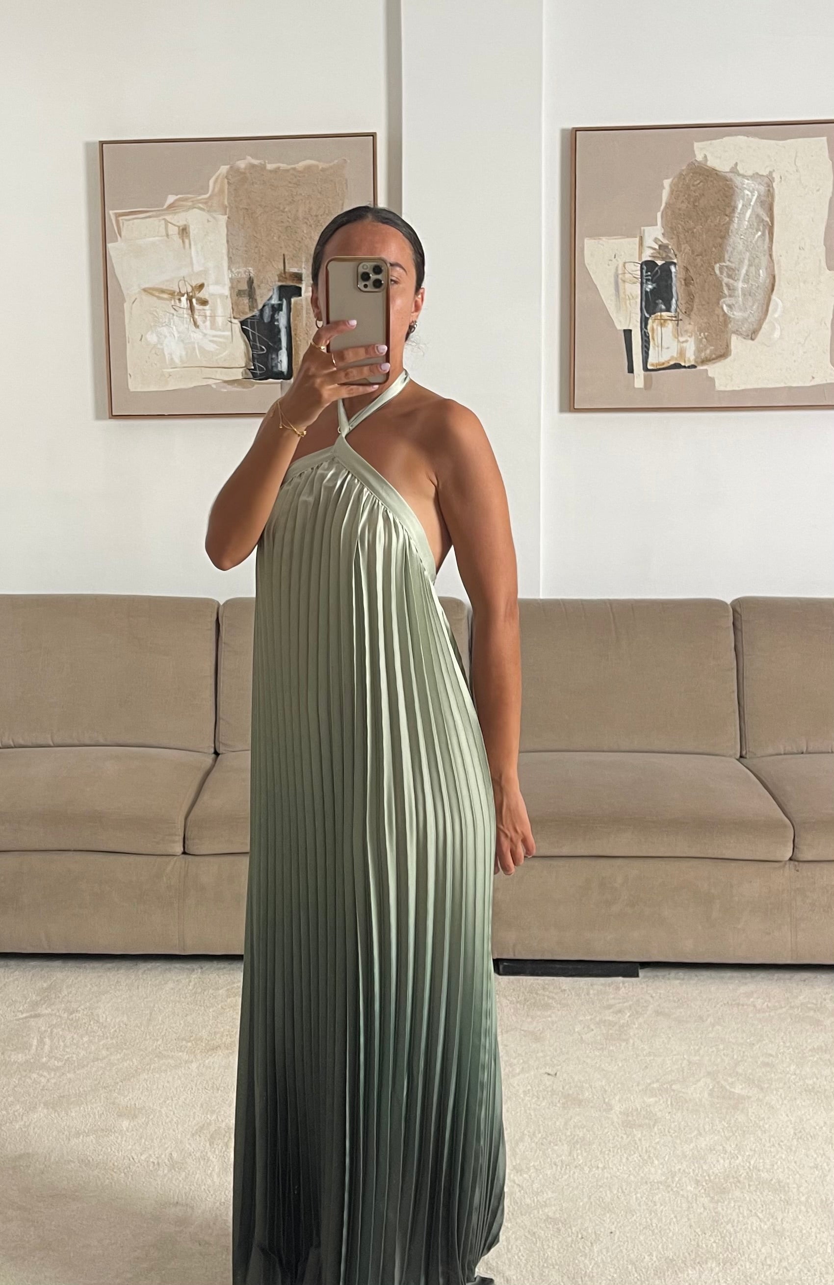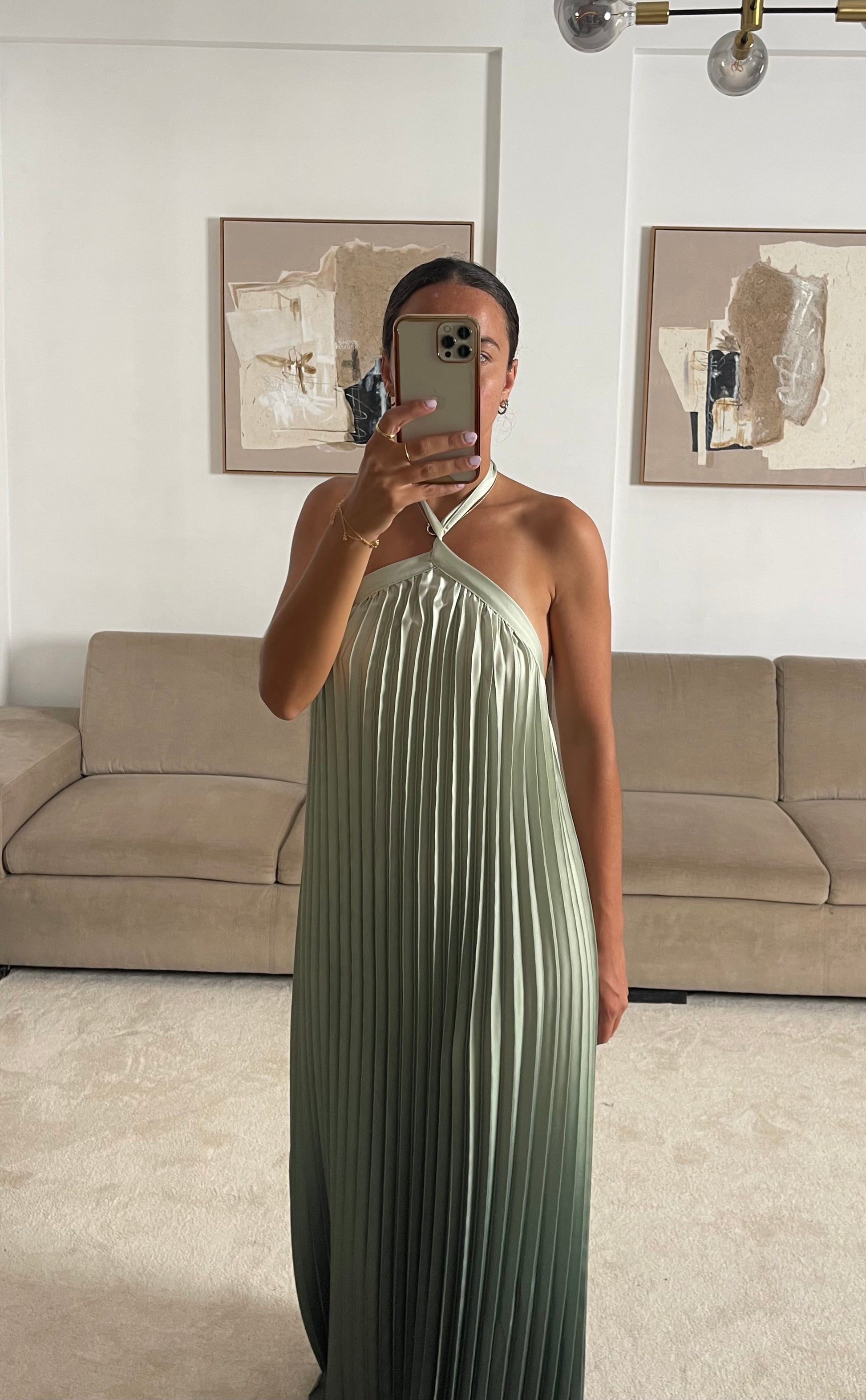 Jurk met gedrapeerd effect. Striksluiting in de nek en open rug. S naar de L.