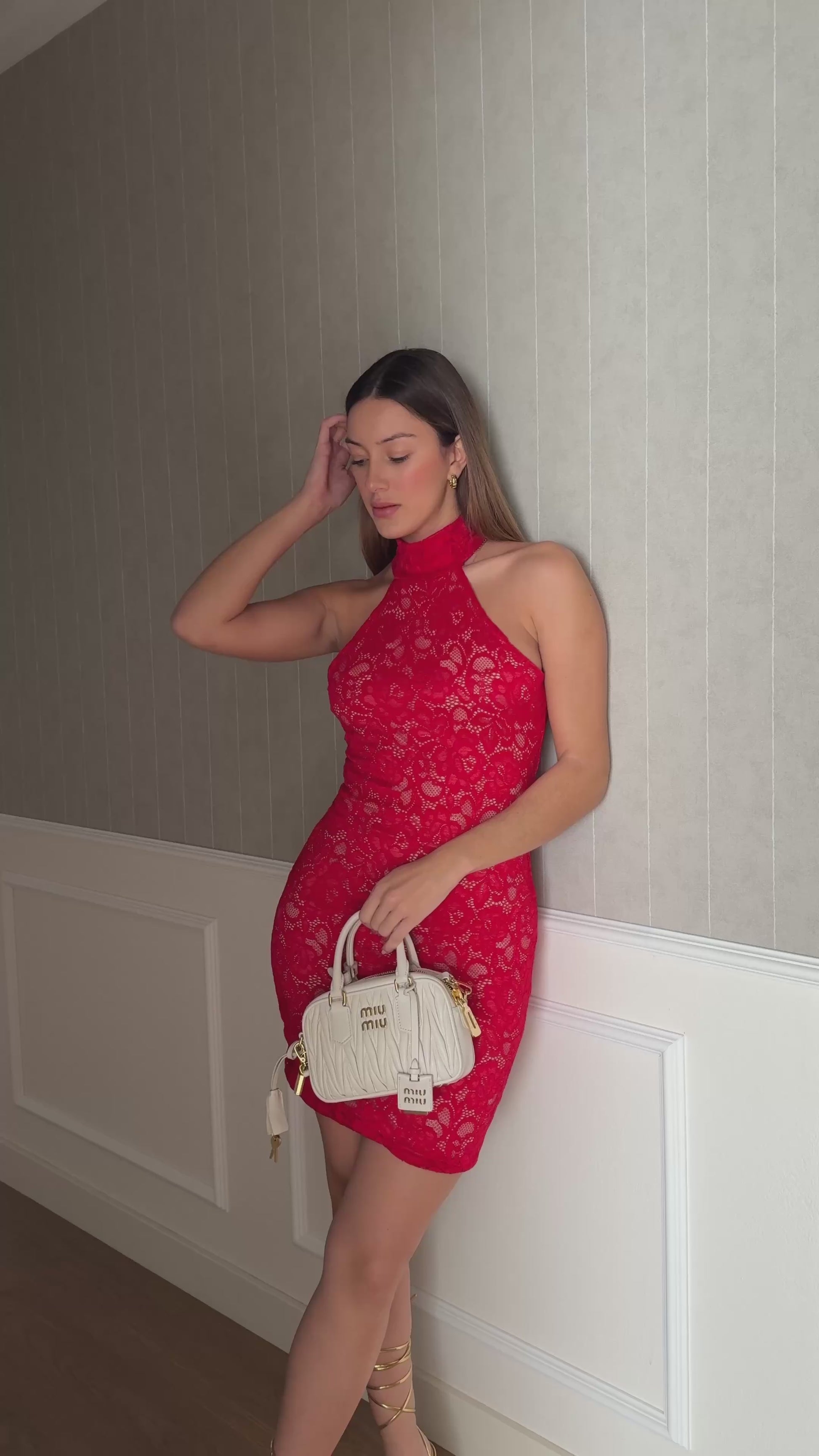 Jurk met halterkraag, volledig bedekt met stof voor een schijntransparantie-effect. Een super sensuele en perfecte jurk voor alle vrouwen. Het is one size fits all S naar de L (klein). Past goed tot 1,76 cm