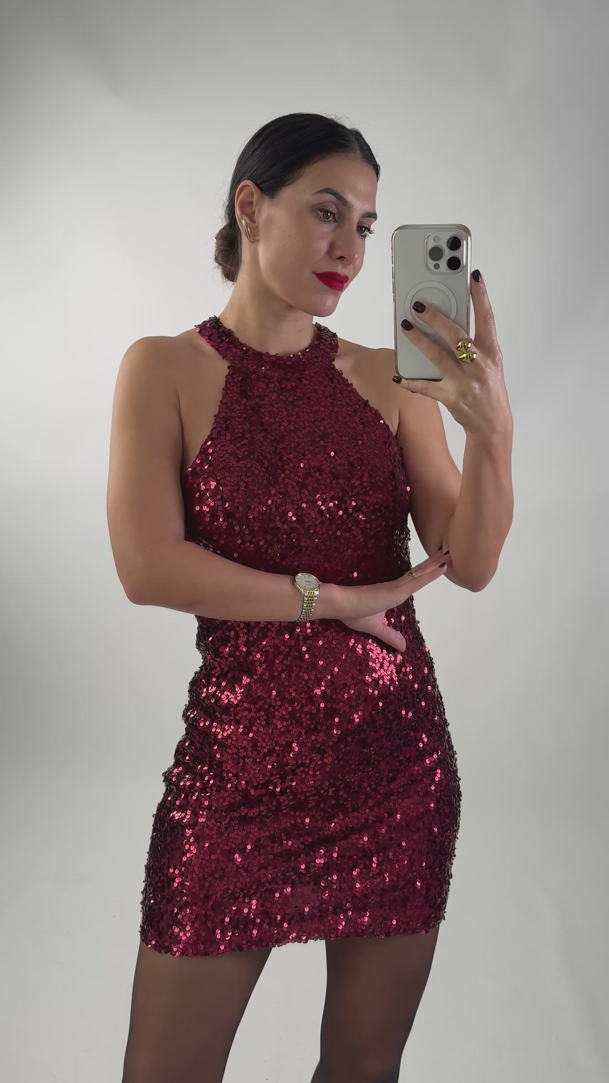 Korte jurk met halterhals, paillettendetails en contrasterende voering. Sluit aan de achterkant met een verborgen rits.