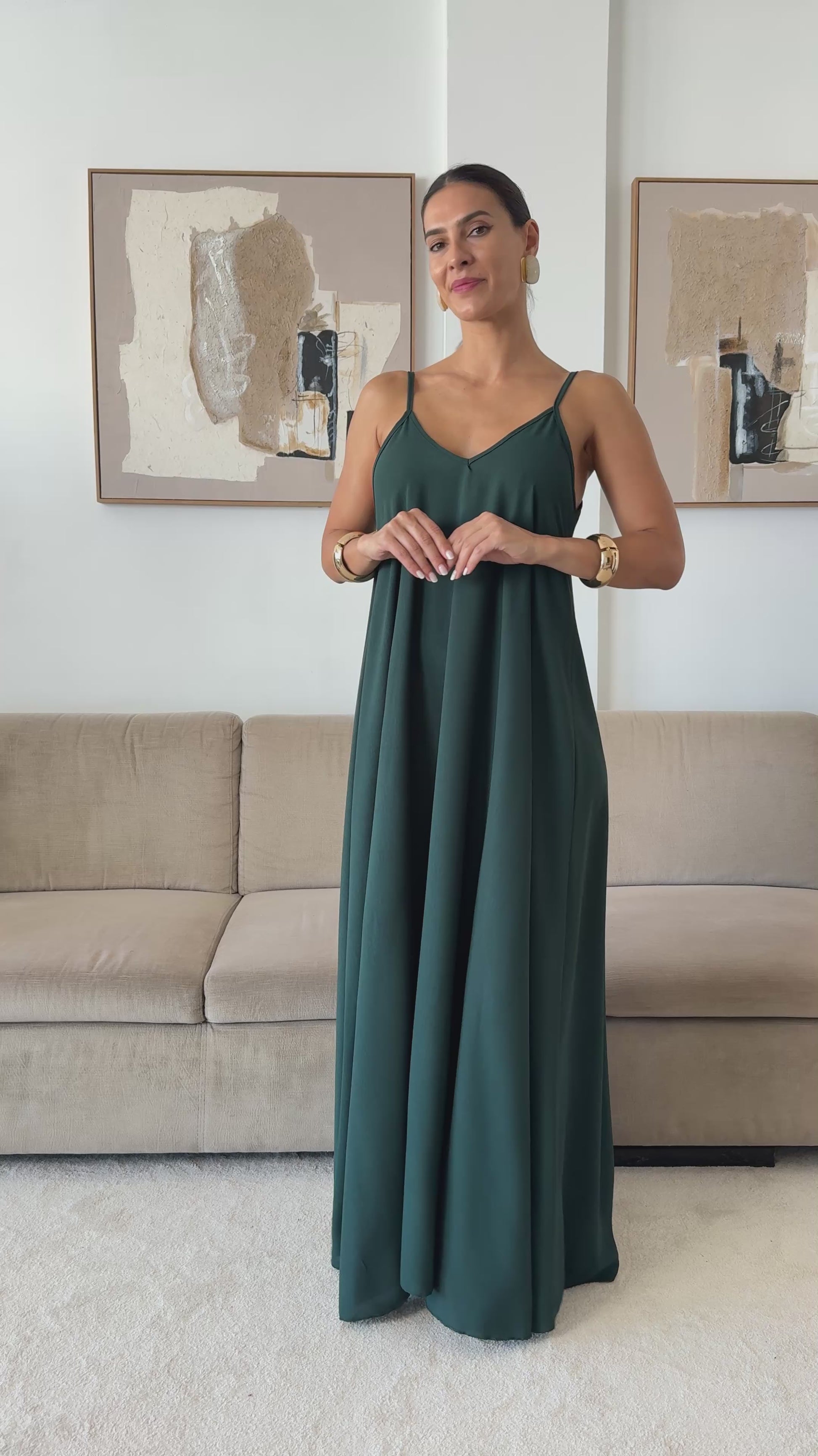 Lange jurk met V-hals aan de voor- en achterkant met verstelbare bandjes. 100% ondoorzichtig.
