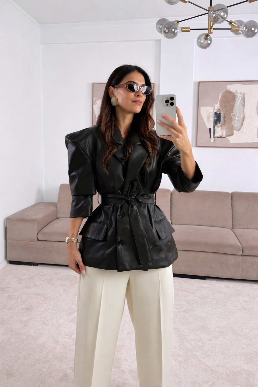 Damska czarna marynarka ze sztucznej skóry o dopasowanym kroju i wzmocnionych ramionach. Fason z podszewką, dwurzędowe zapięcie na guziki, kieszenie z patkami i pasek z tej samej tkaniny podkreślający sylwetkę.