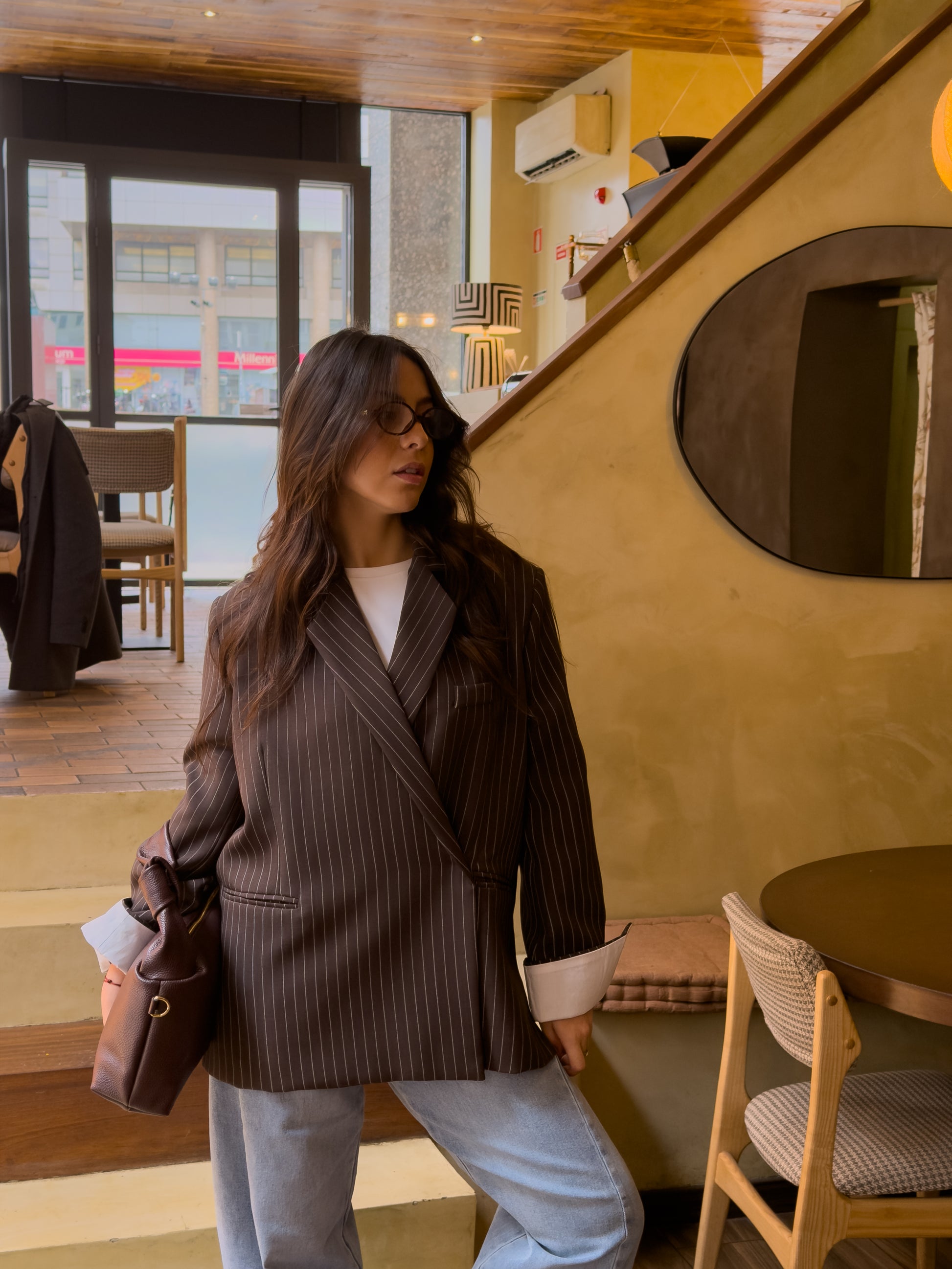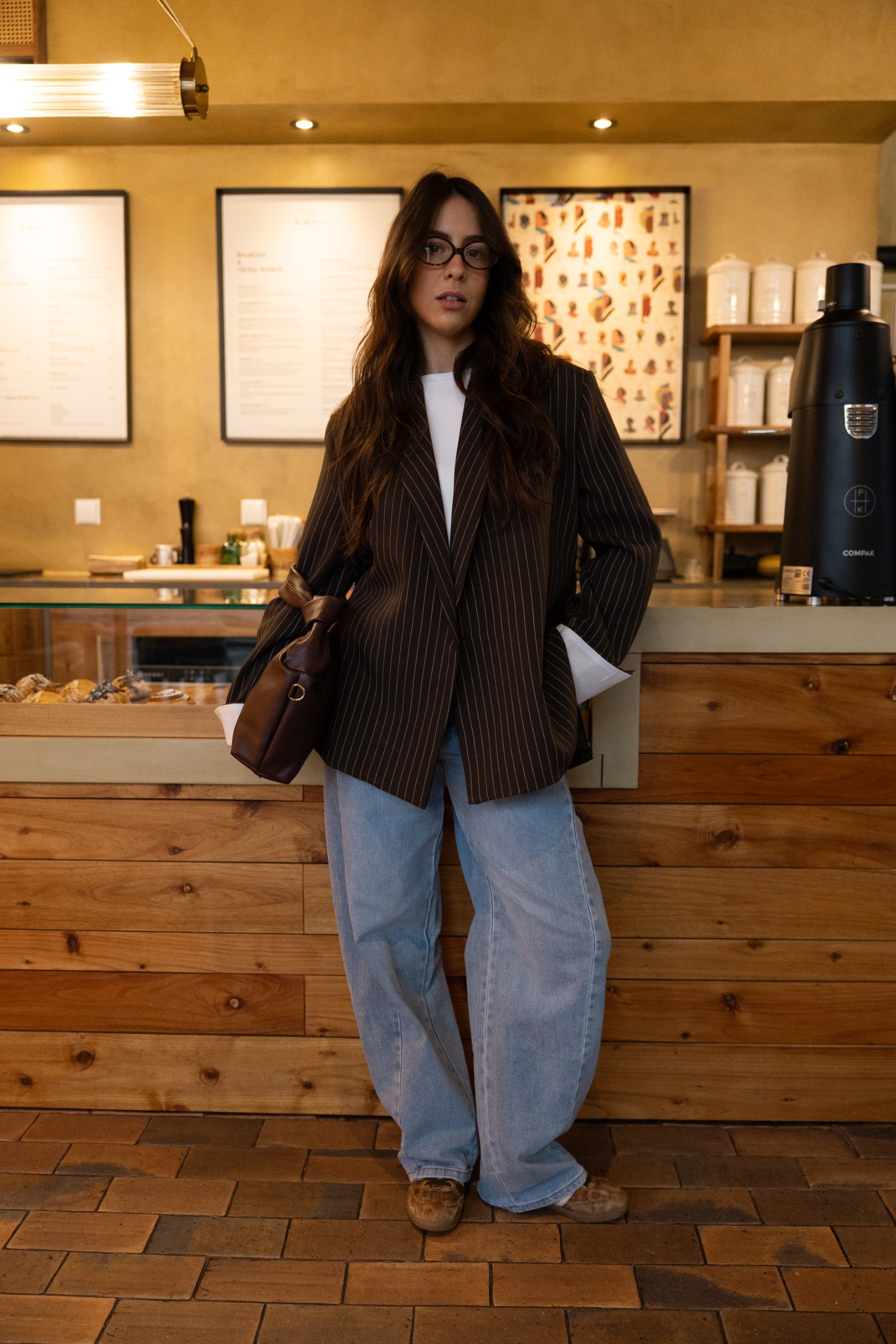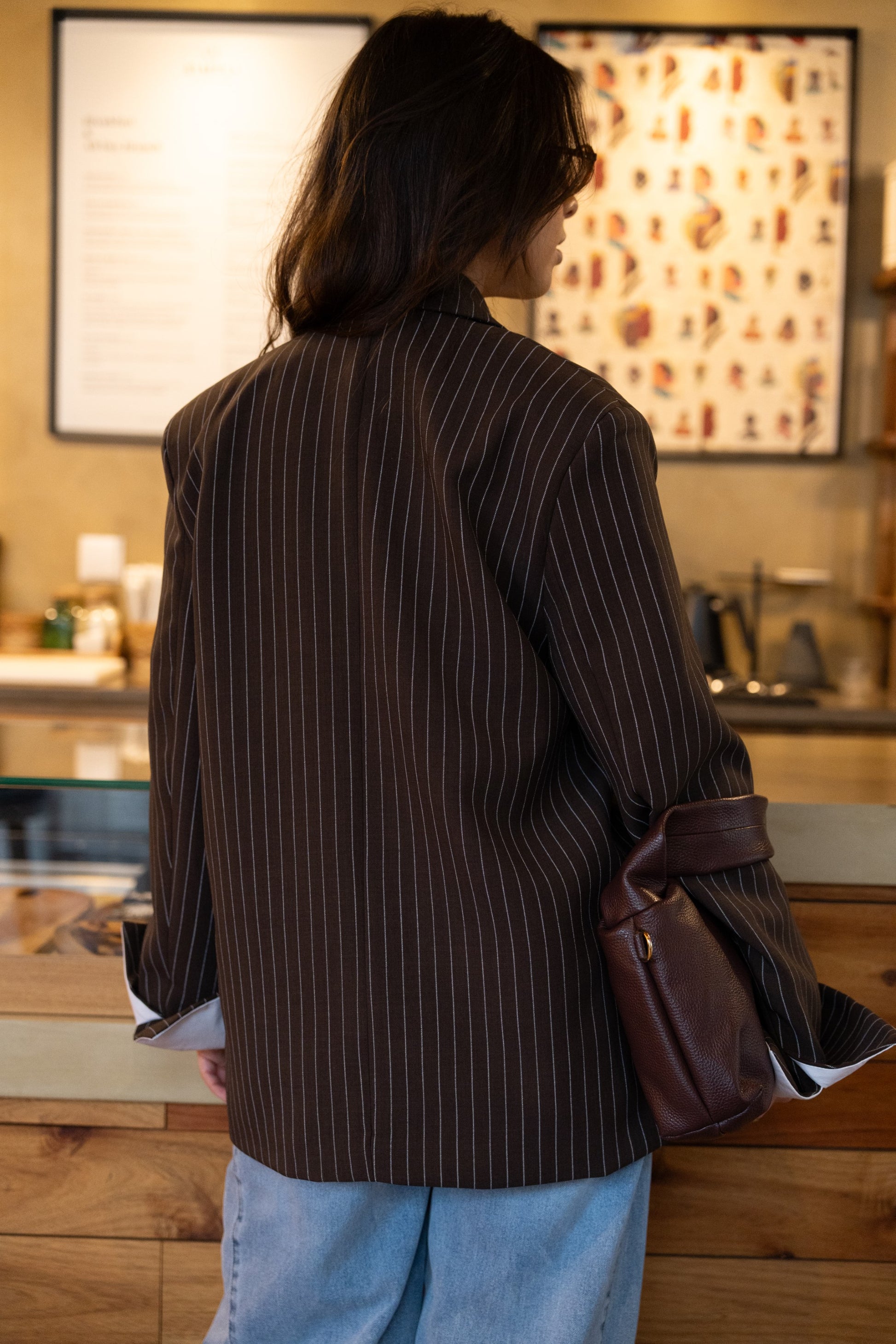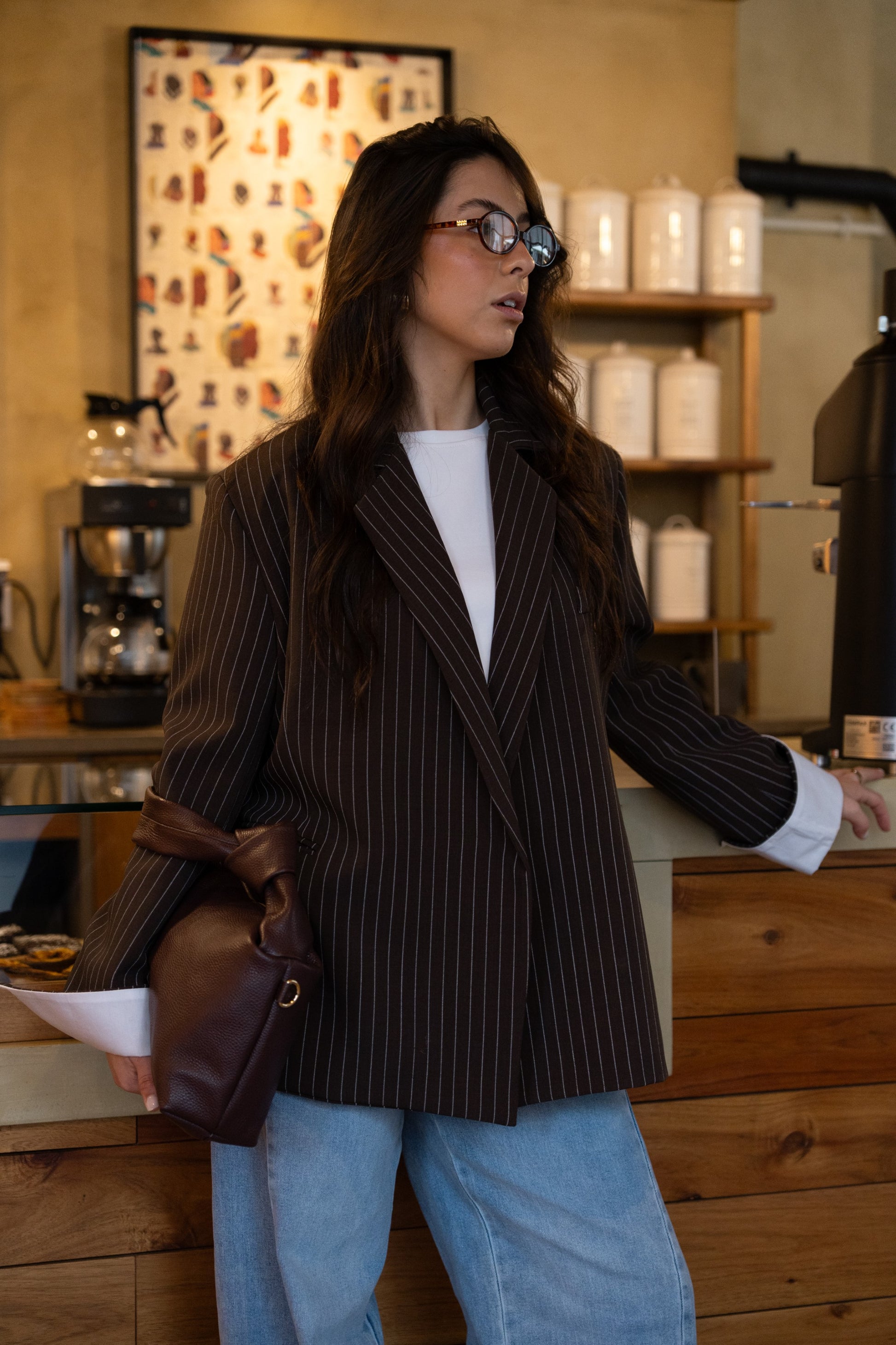 Czekoladowa, oversize'owa marynarka z paskiem dyplomatycznym
