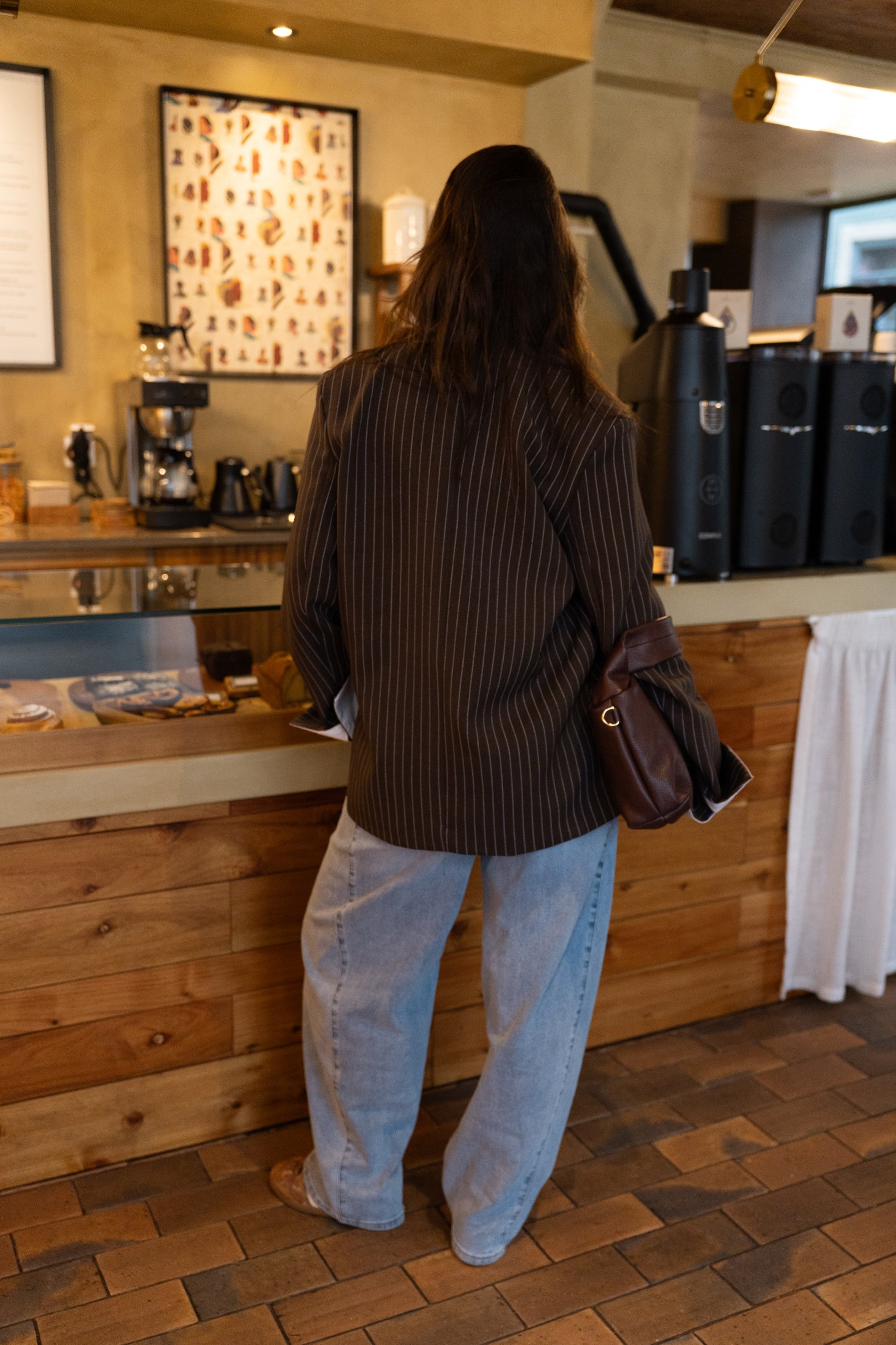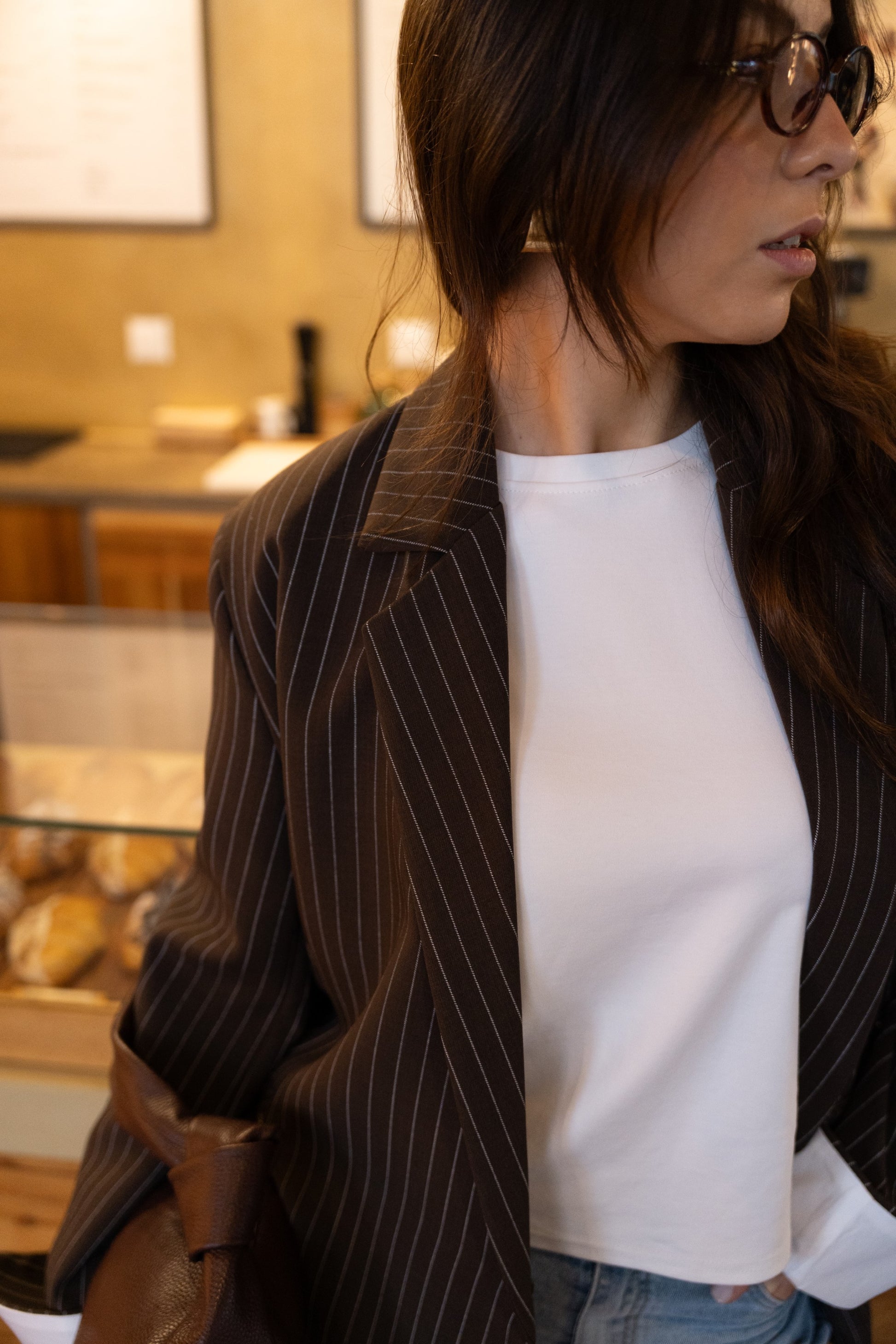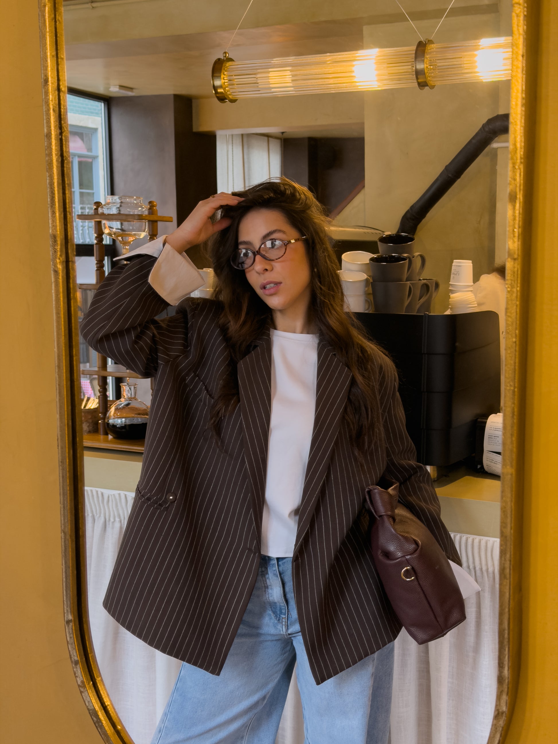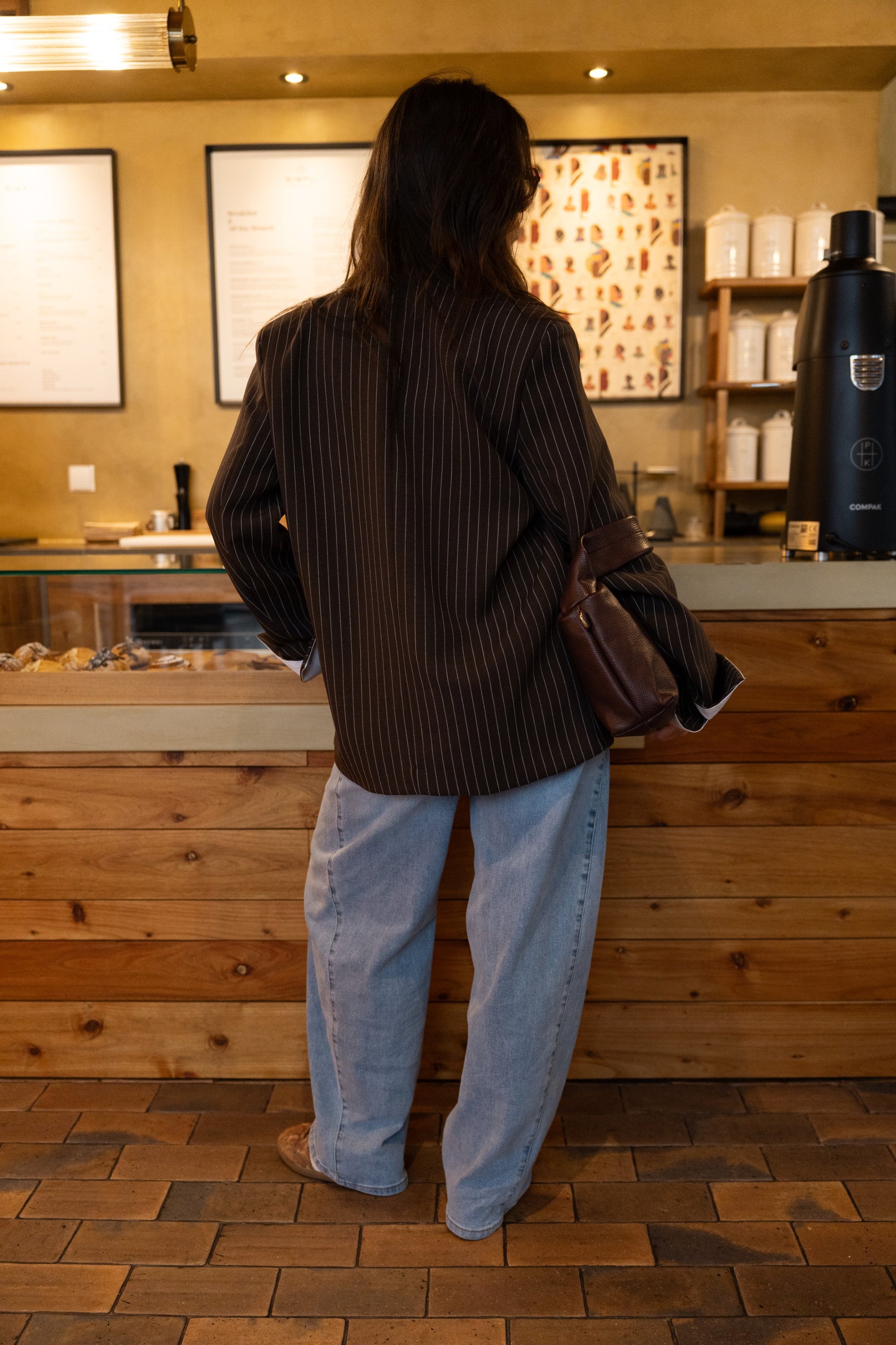 Czekoladowa, oversize'owa marynarka z paskiem dyplomatycznym