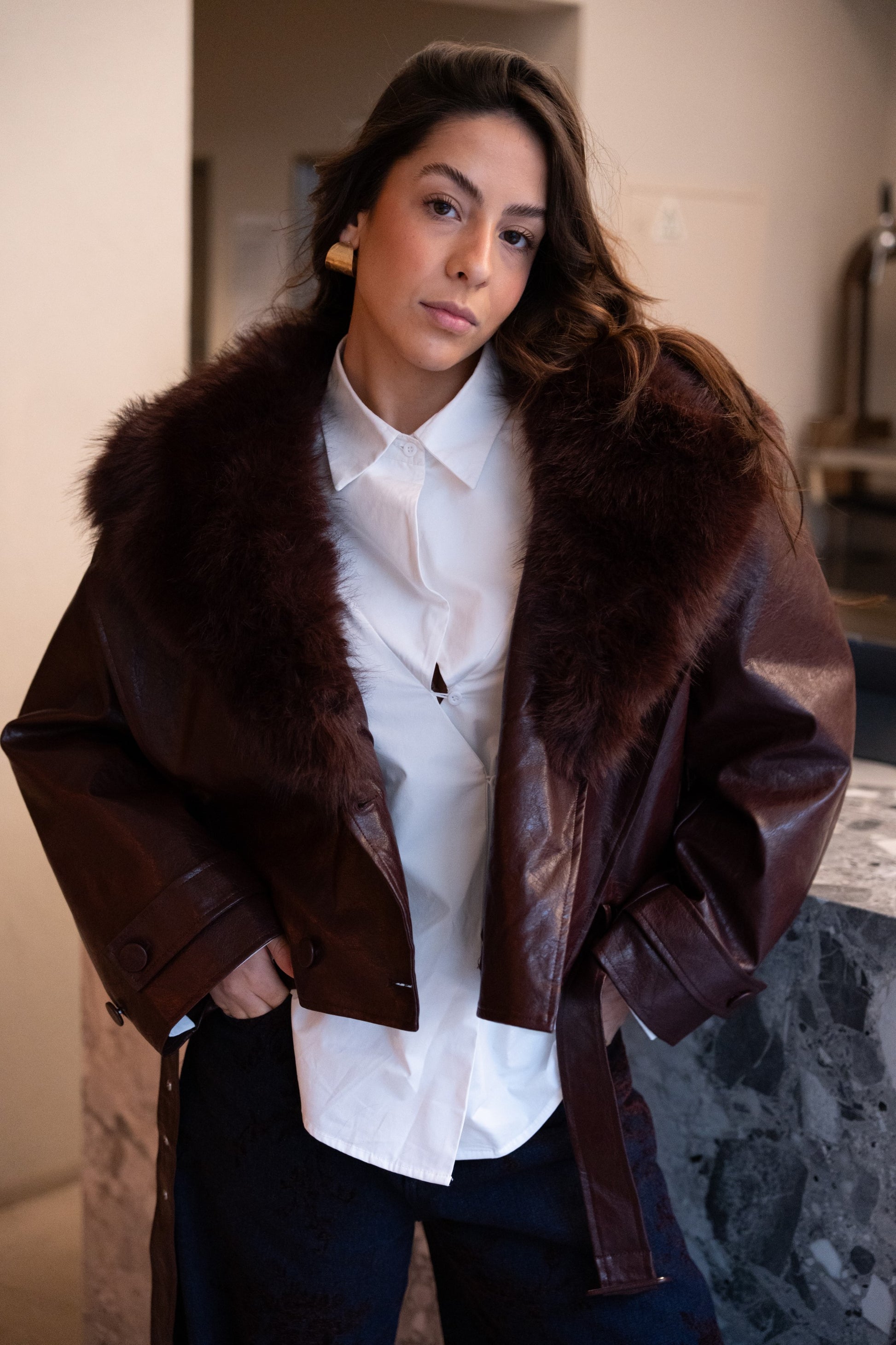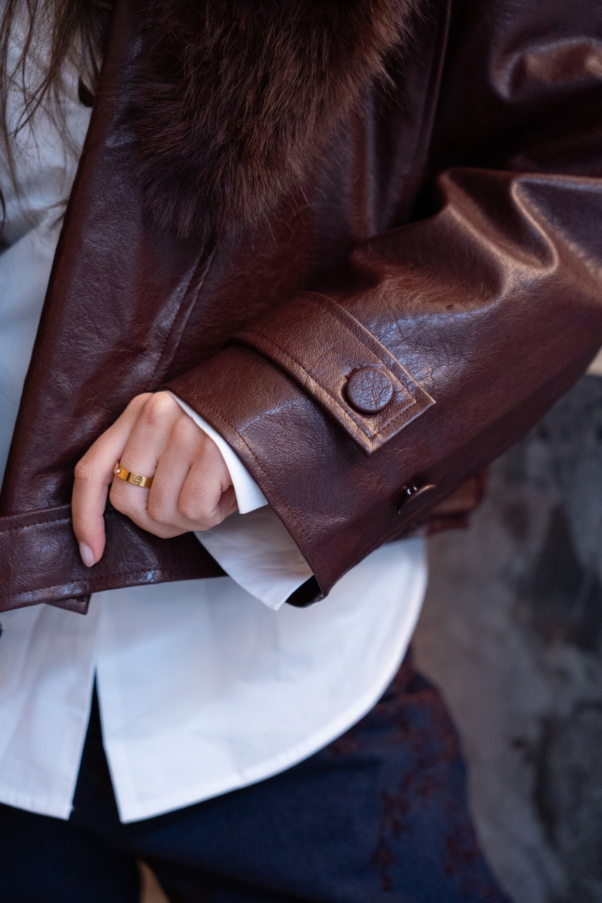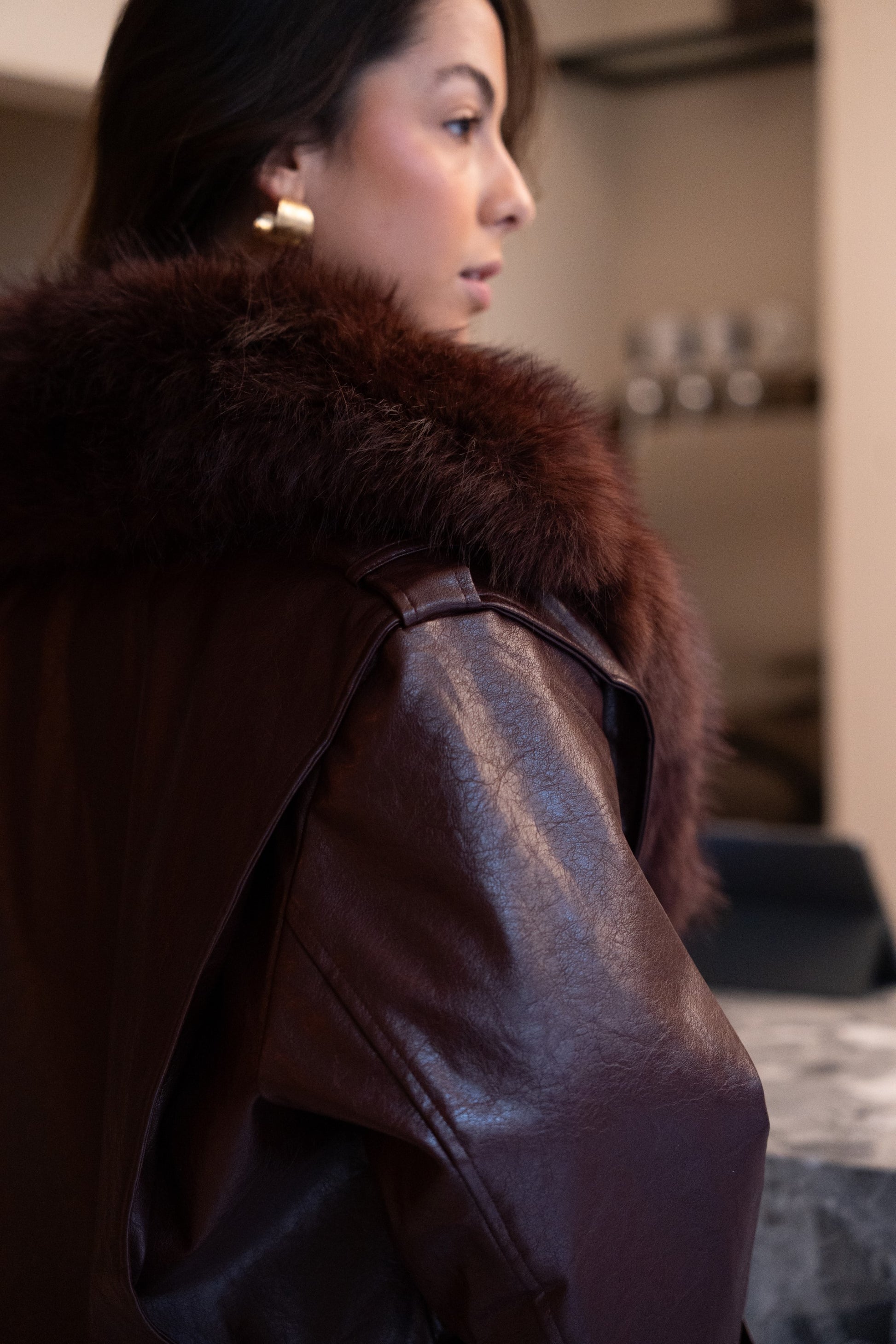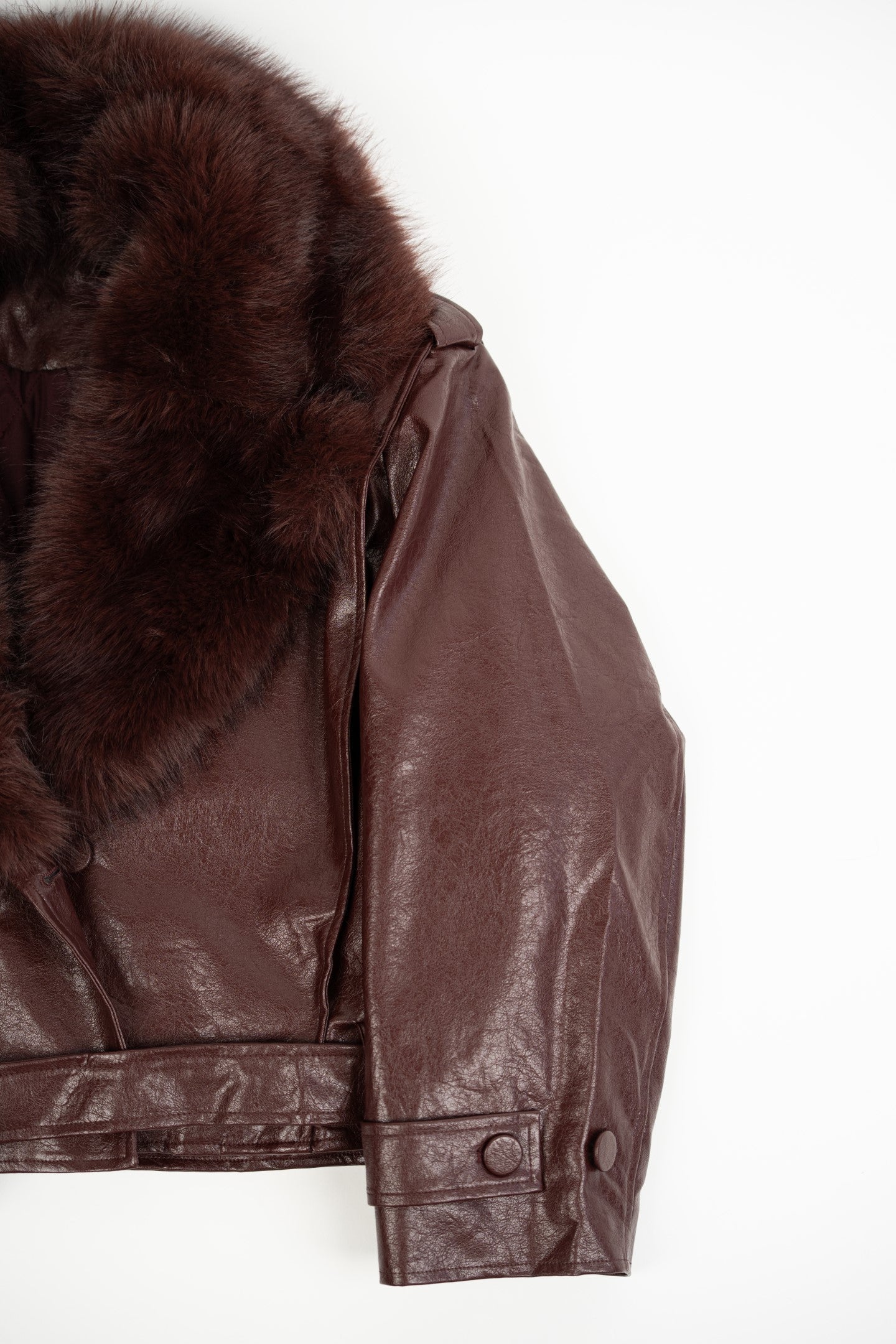 Bordowa kurtka ze skóry ekologicznej z odpinanym futerkiem.