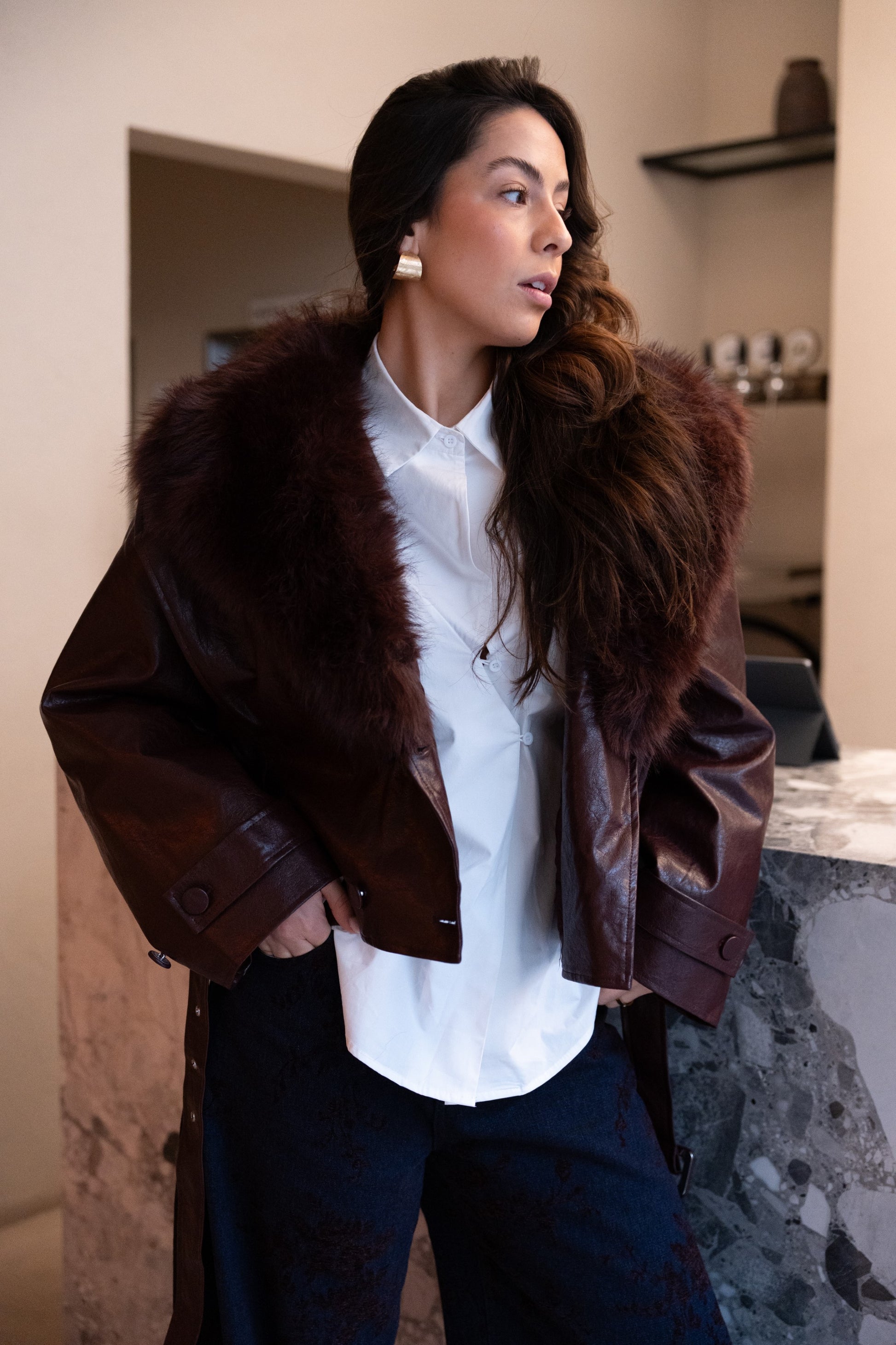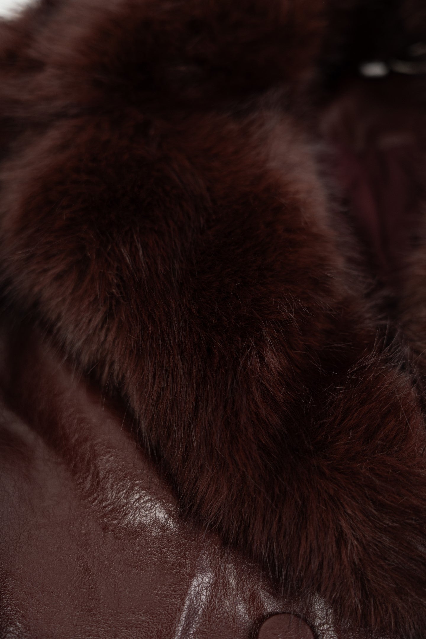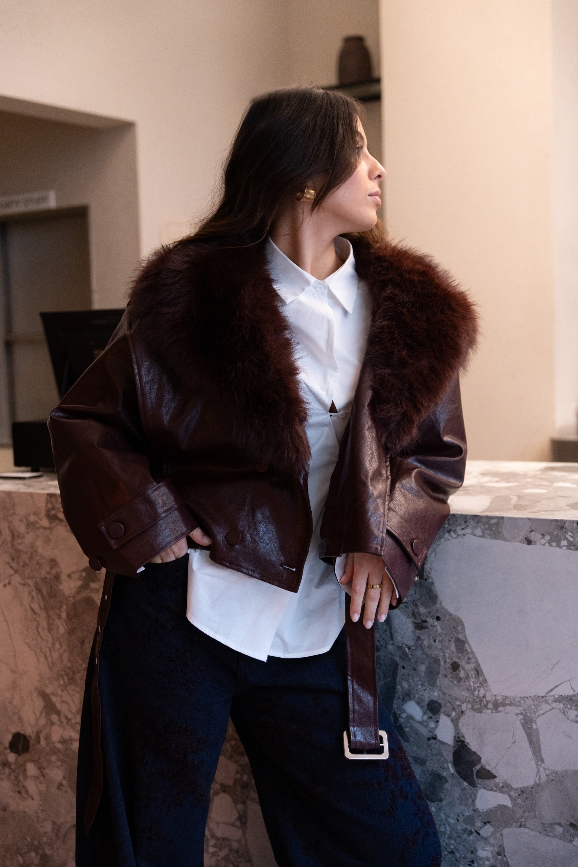Bordowa kurtka ze skóry ekologicznej z odpinanym futerkiem.