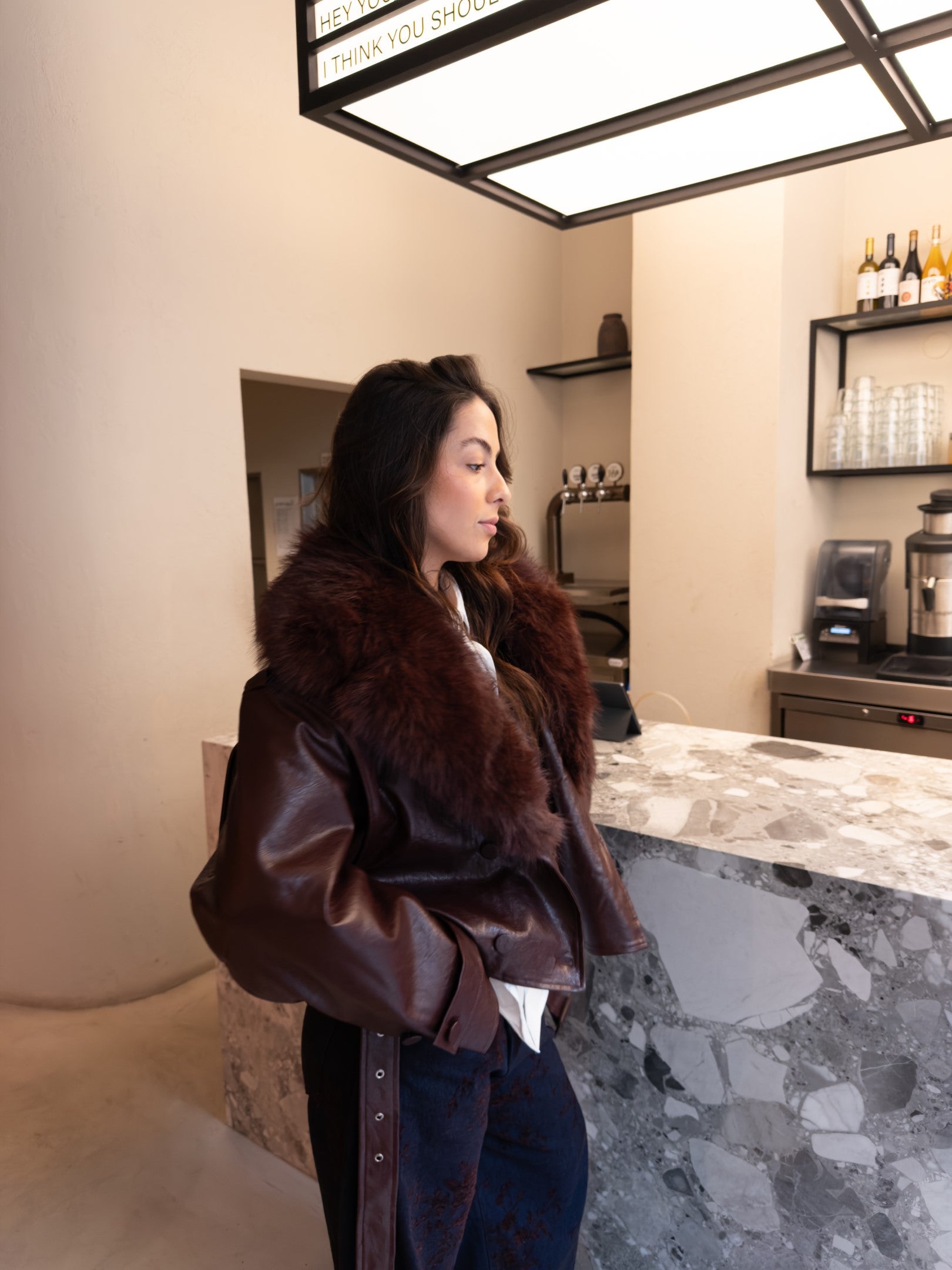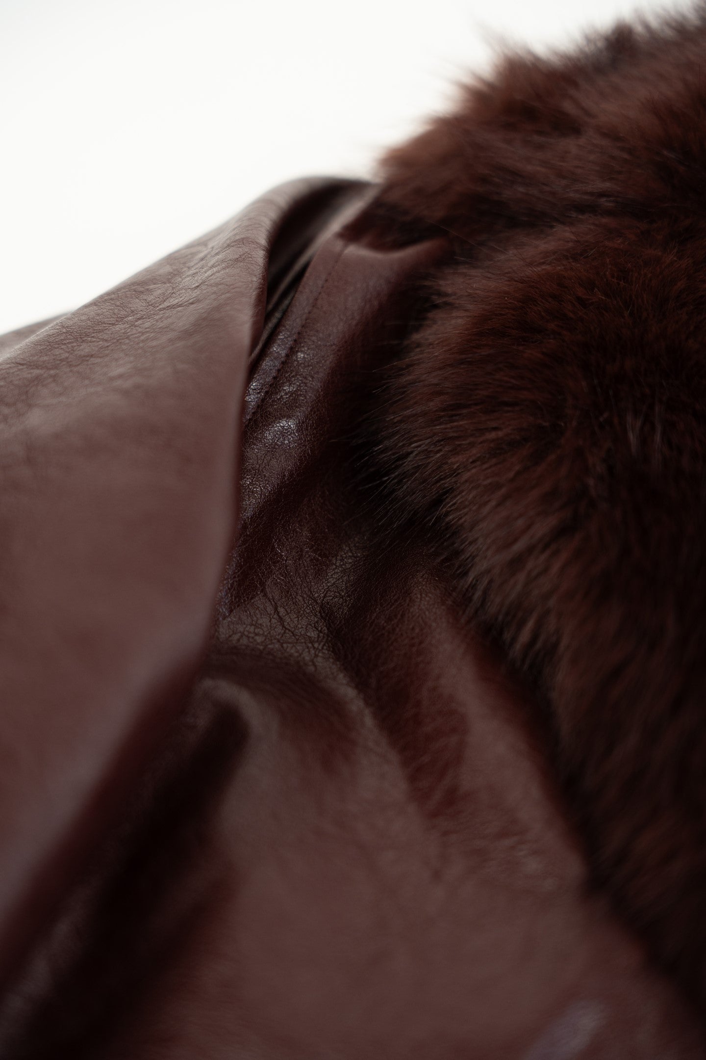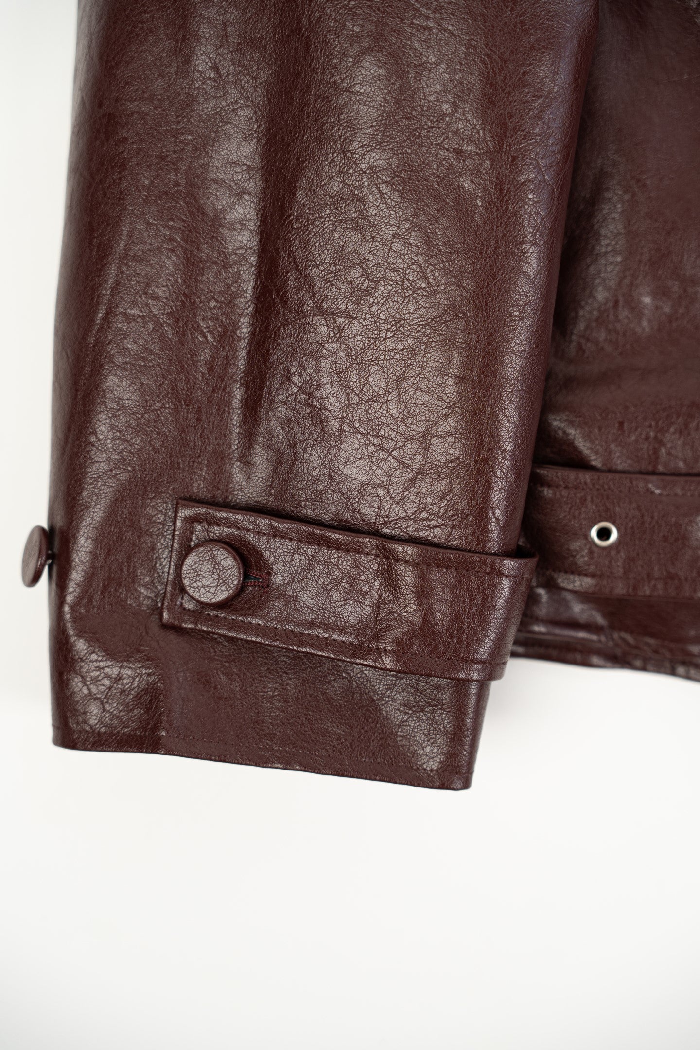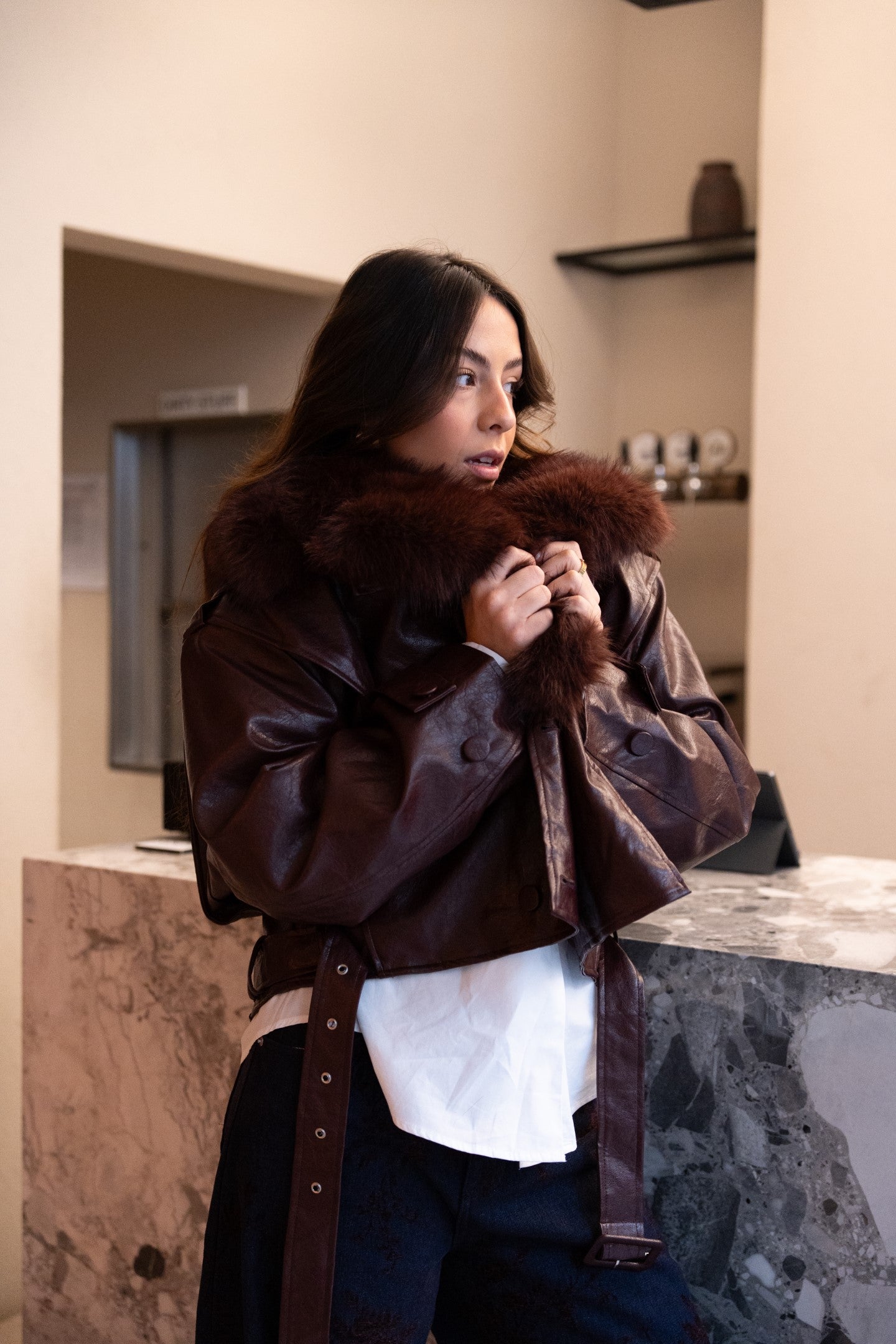 Bordowa kurtka ze skóry ekologicznej z odpinanym futerkiem.