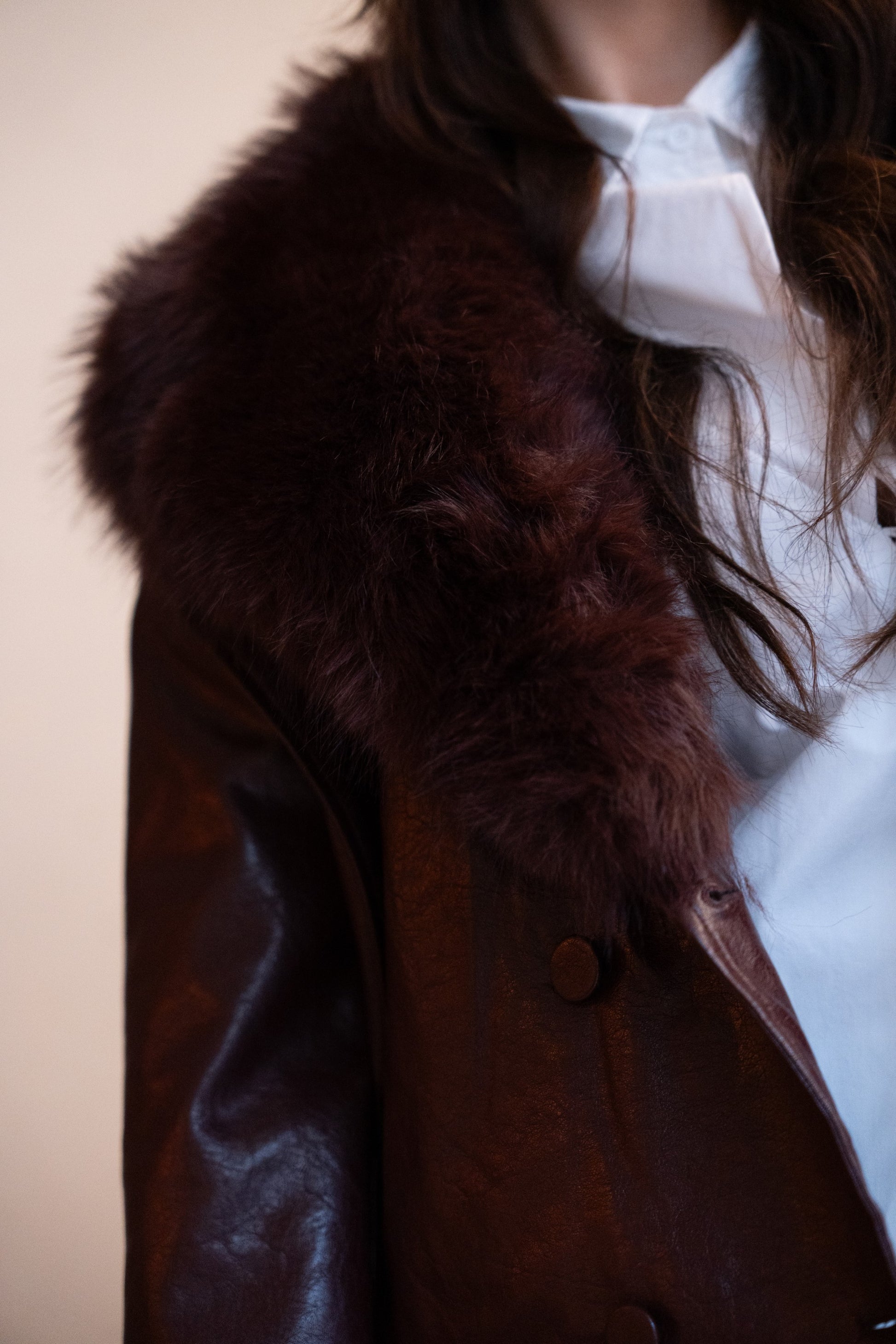 Bluzka z kołnierzem z klapami, długimi rękawami z pętelkami na ramiona i odpinanym futerkiem. Podszewka pikowana. Kieszenie z przodu zapinane na guziki w kształcie krzyża. Pasujący pasek z metalową klamrą. Pasuje od S do L.