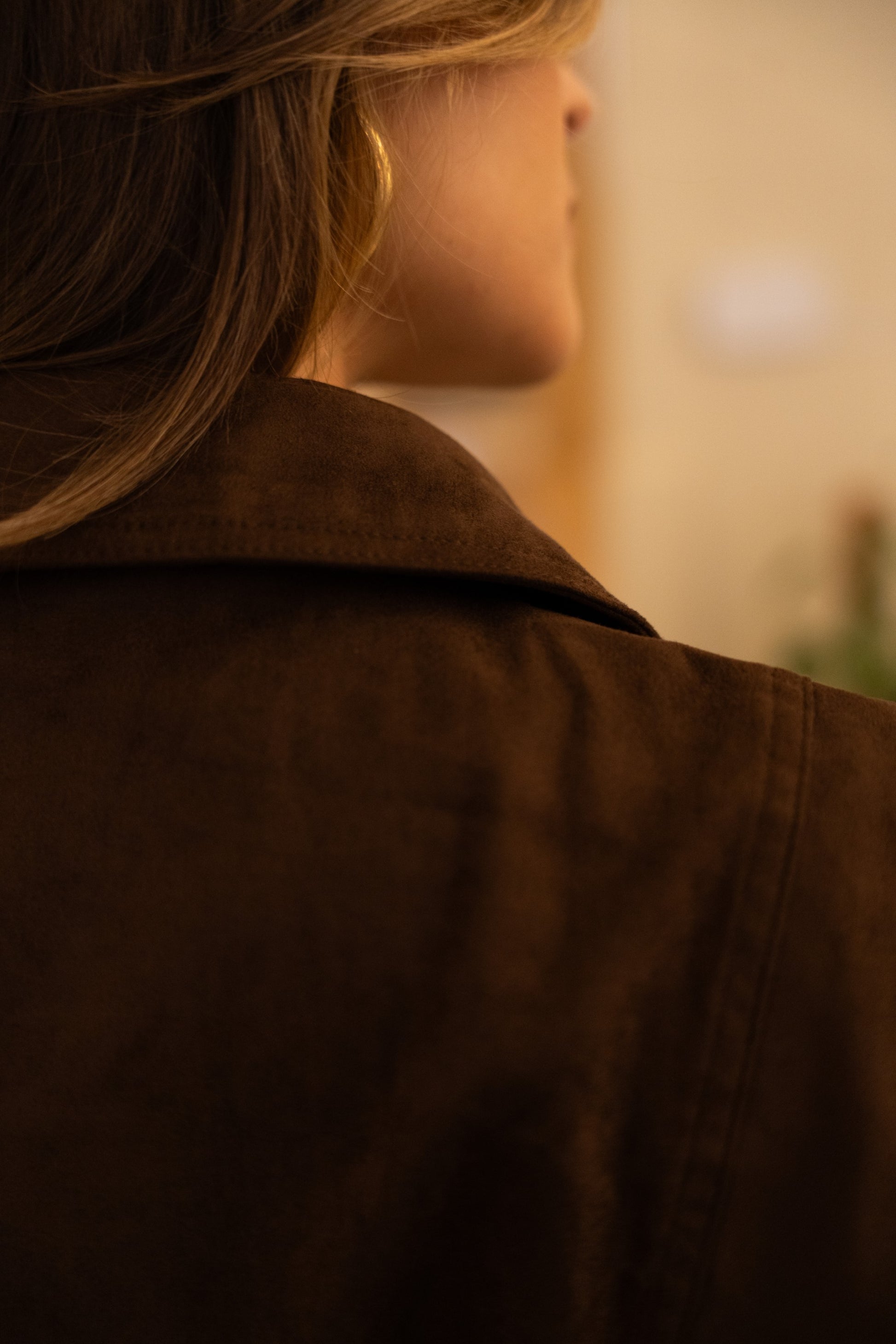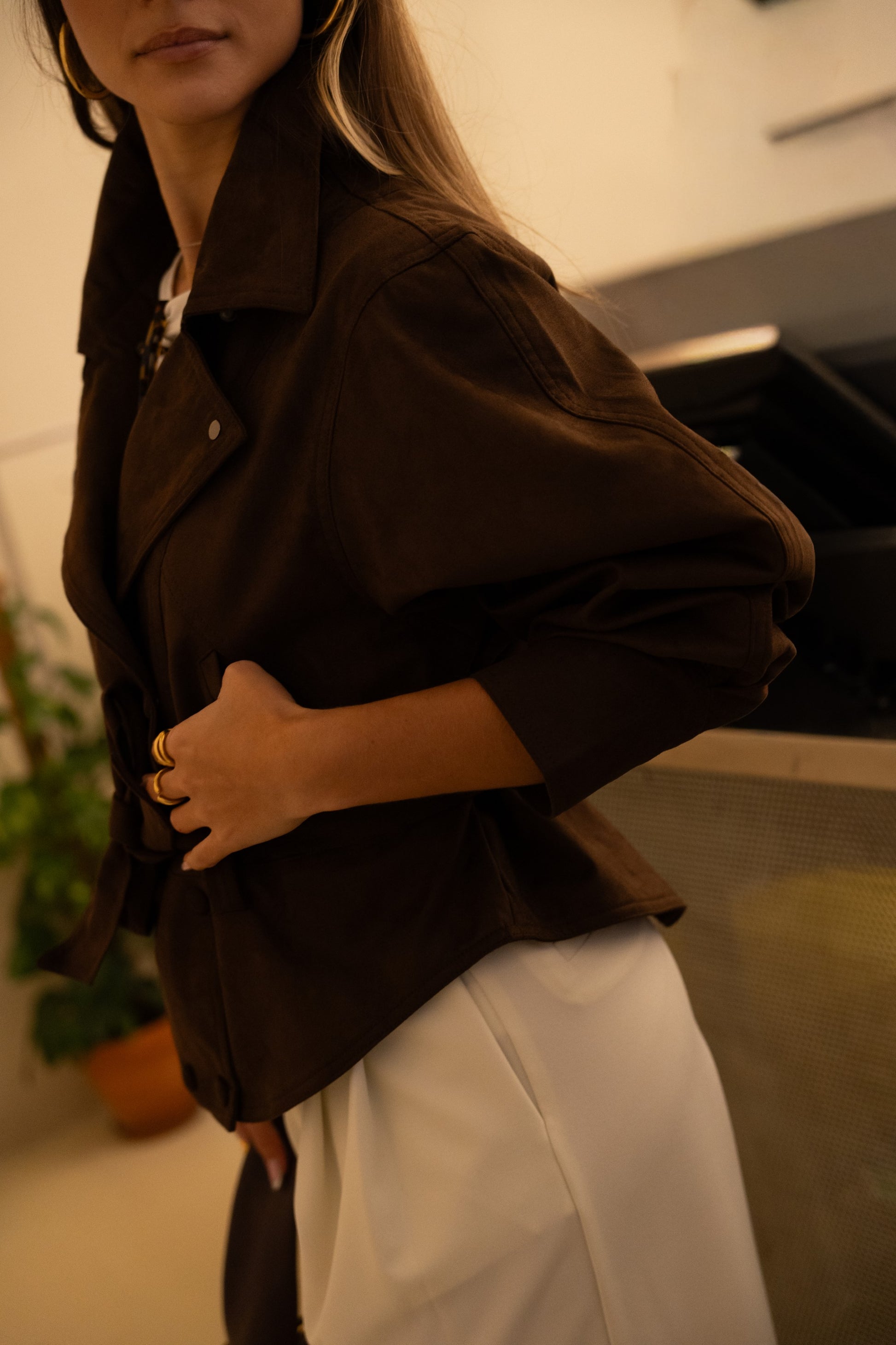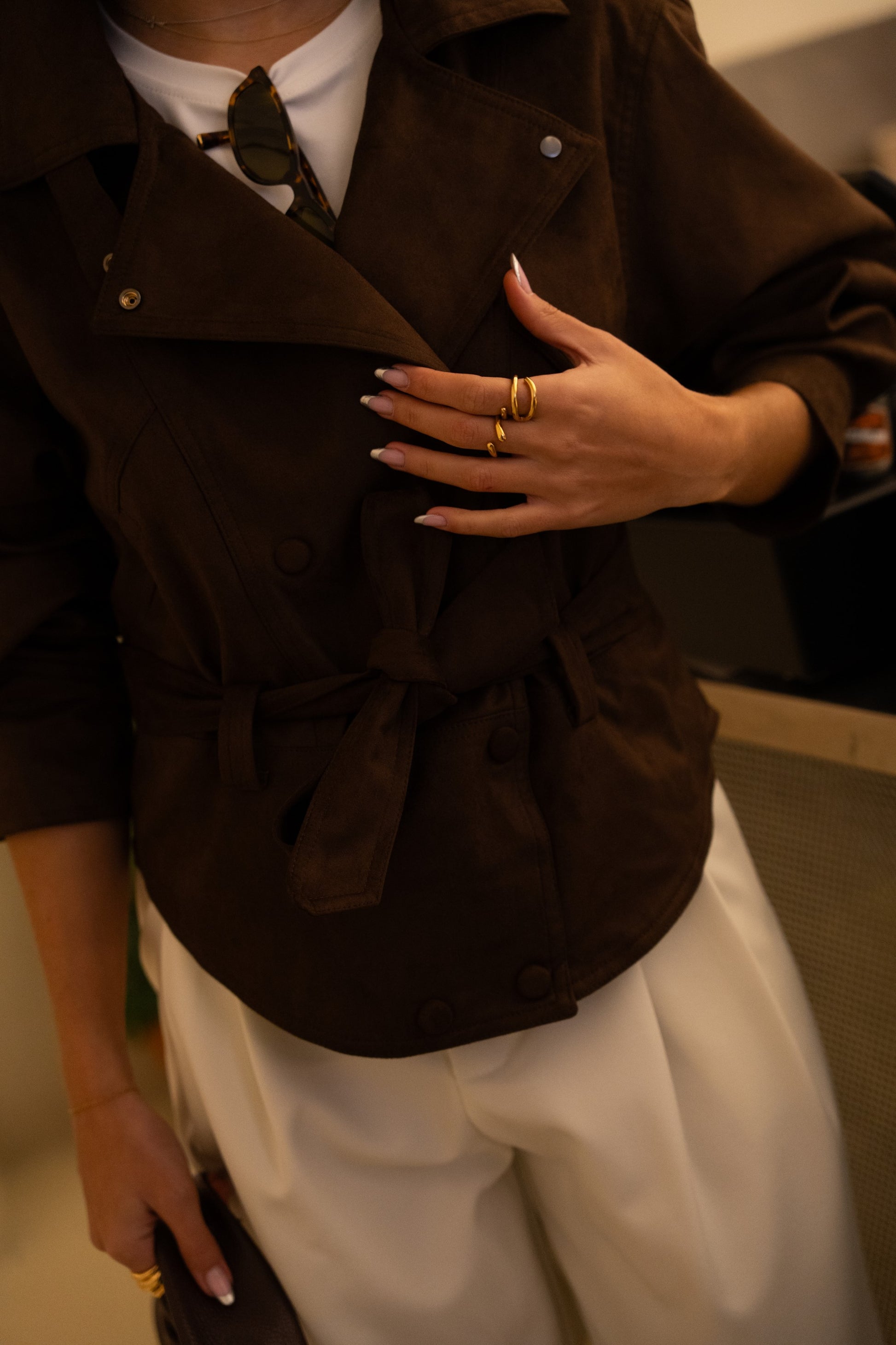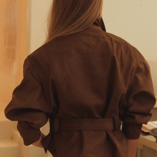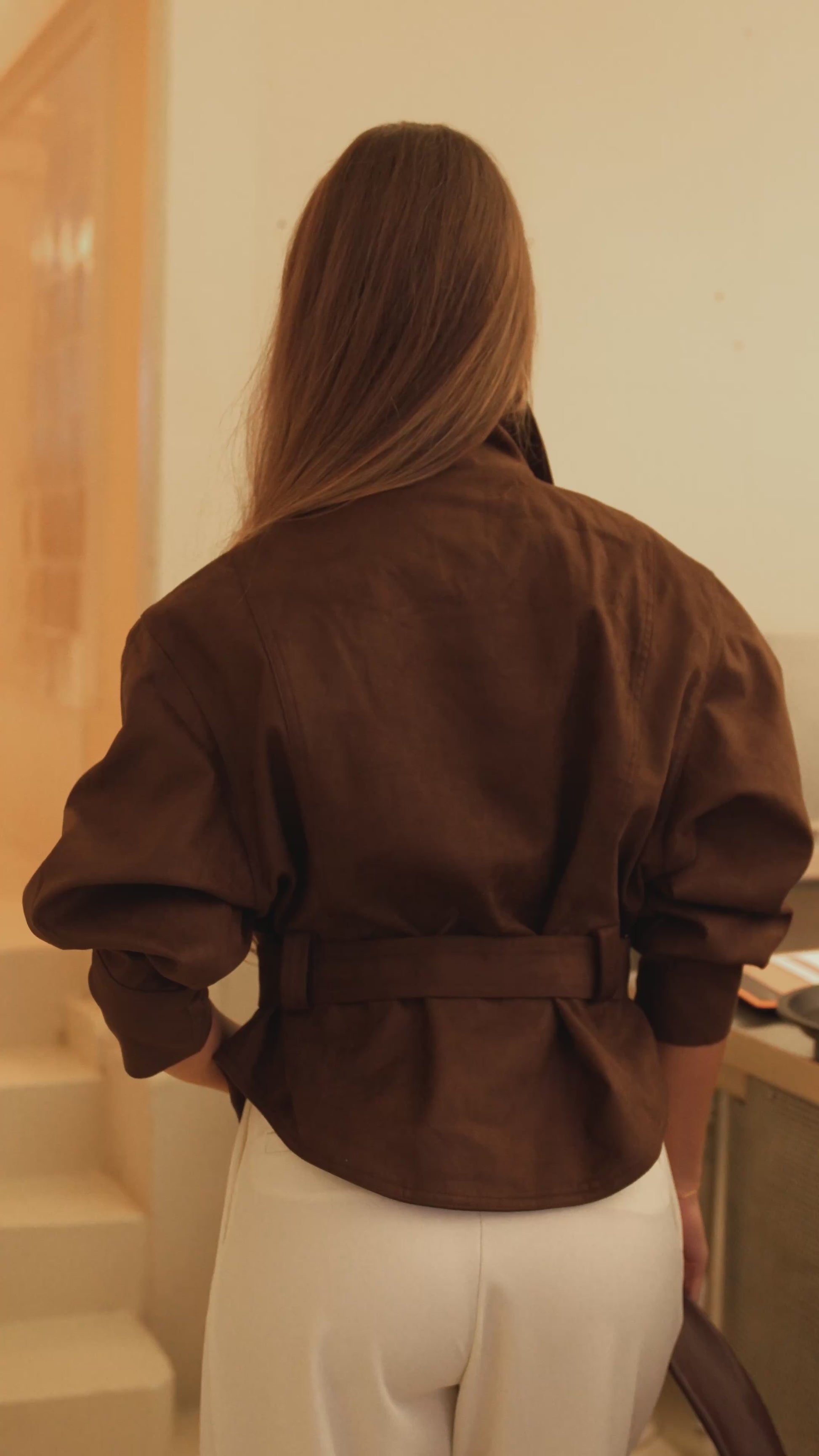 Brązowa, brzoskwiniowa, skórzana kurtka, z podszewką, zapinana z przodu na zatrzaski. Posiada funkcjonalne kieszenie z przodu zapinane na zatrzaski i pasek z tej samej tkaniny. Pasuje od S do L.