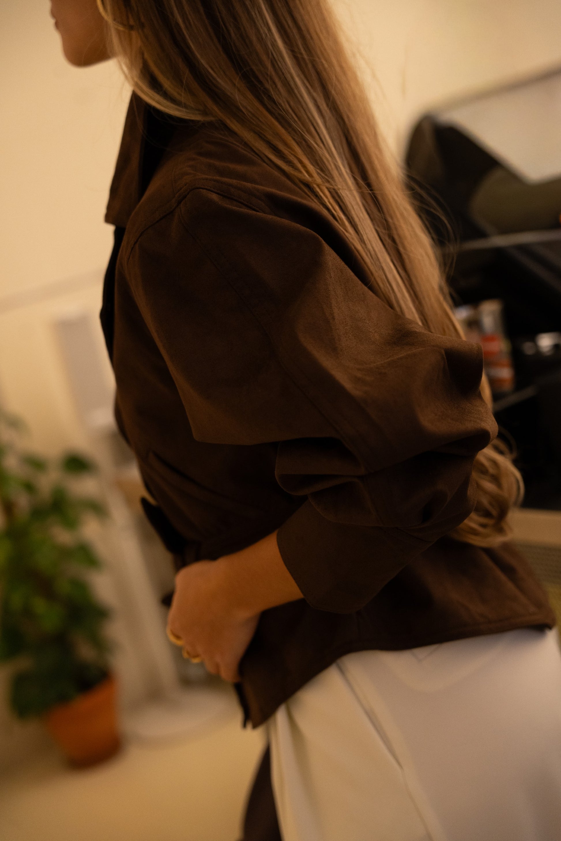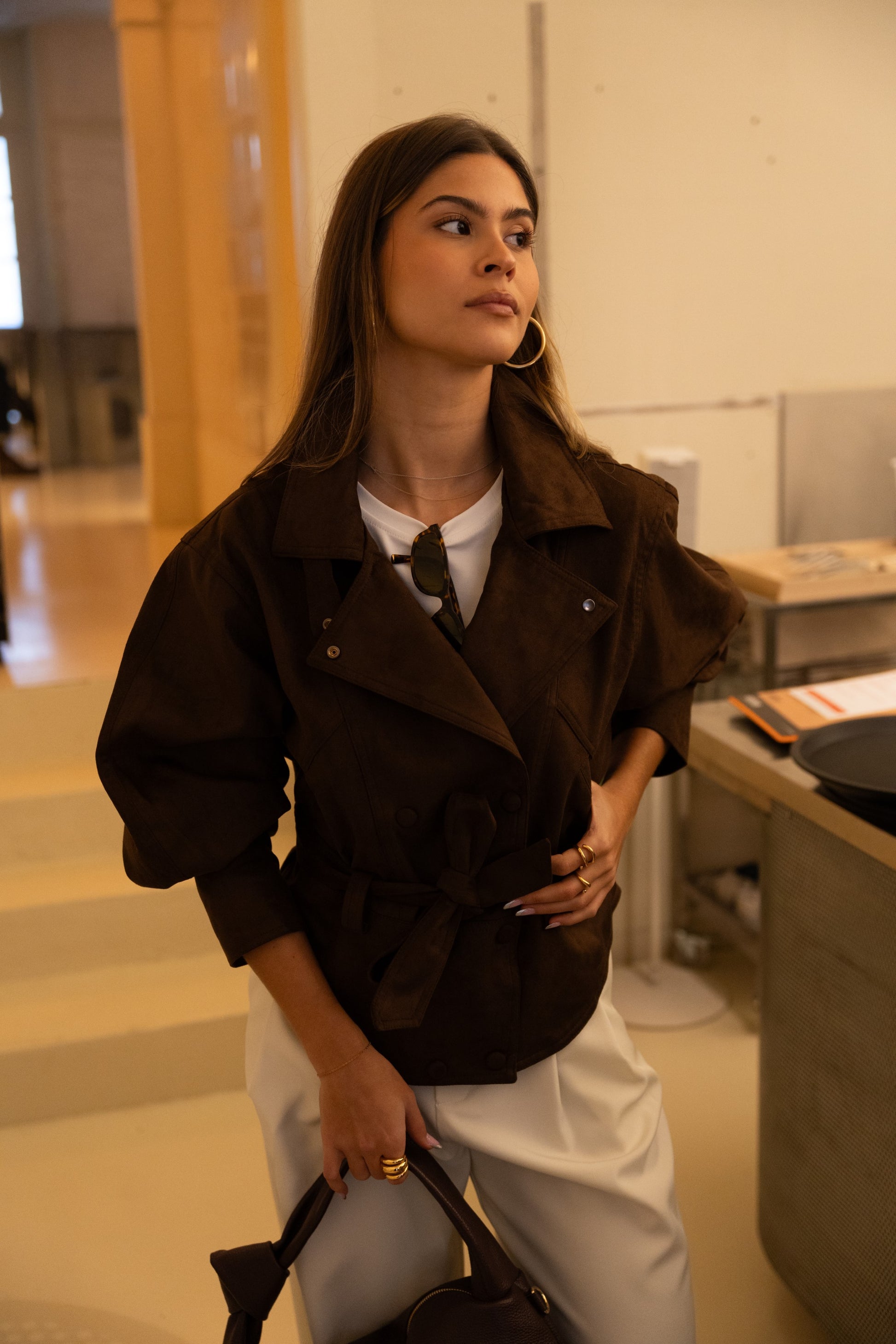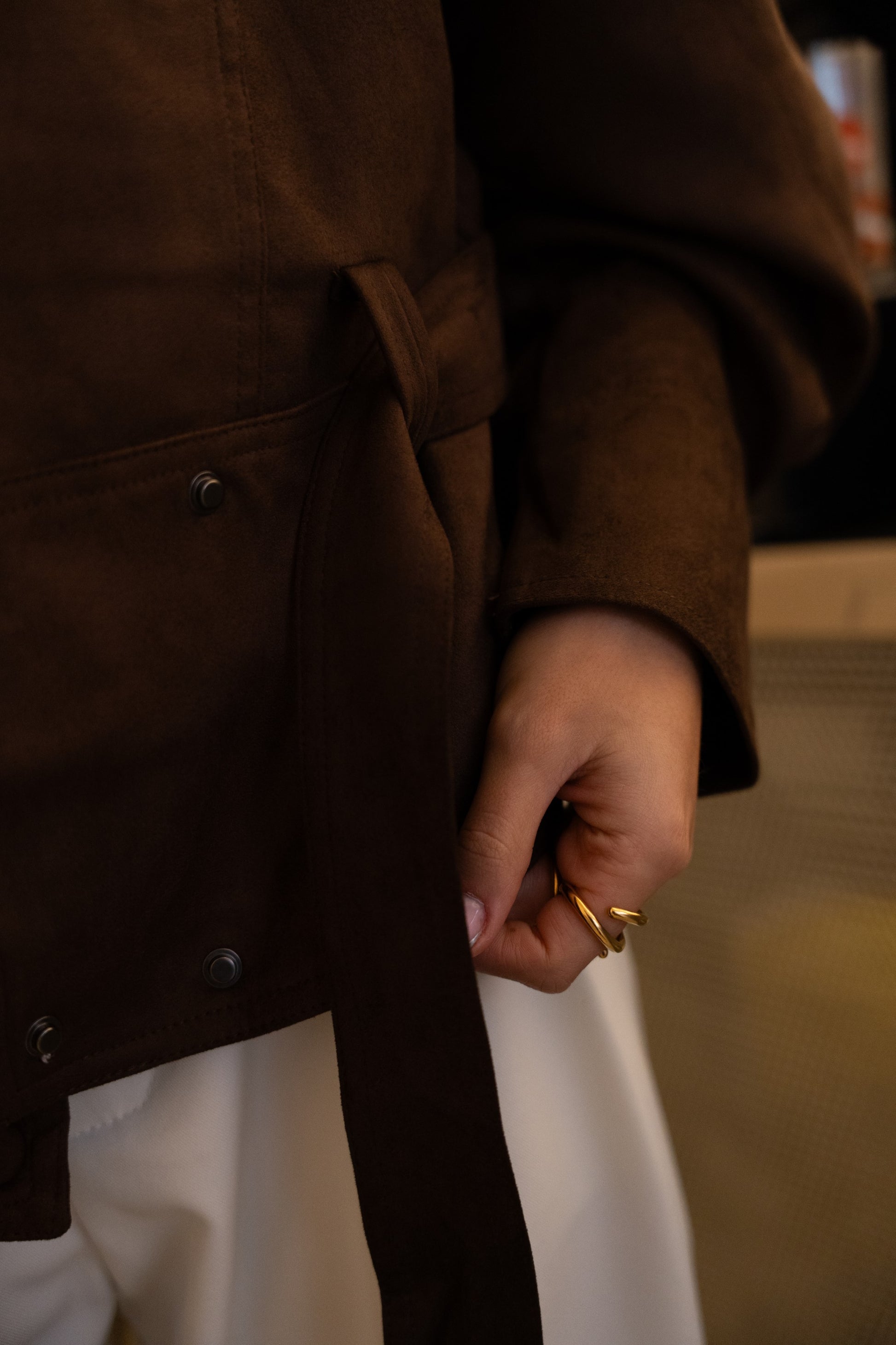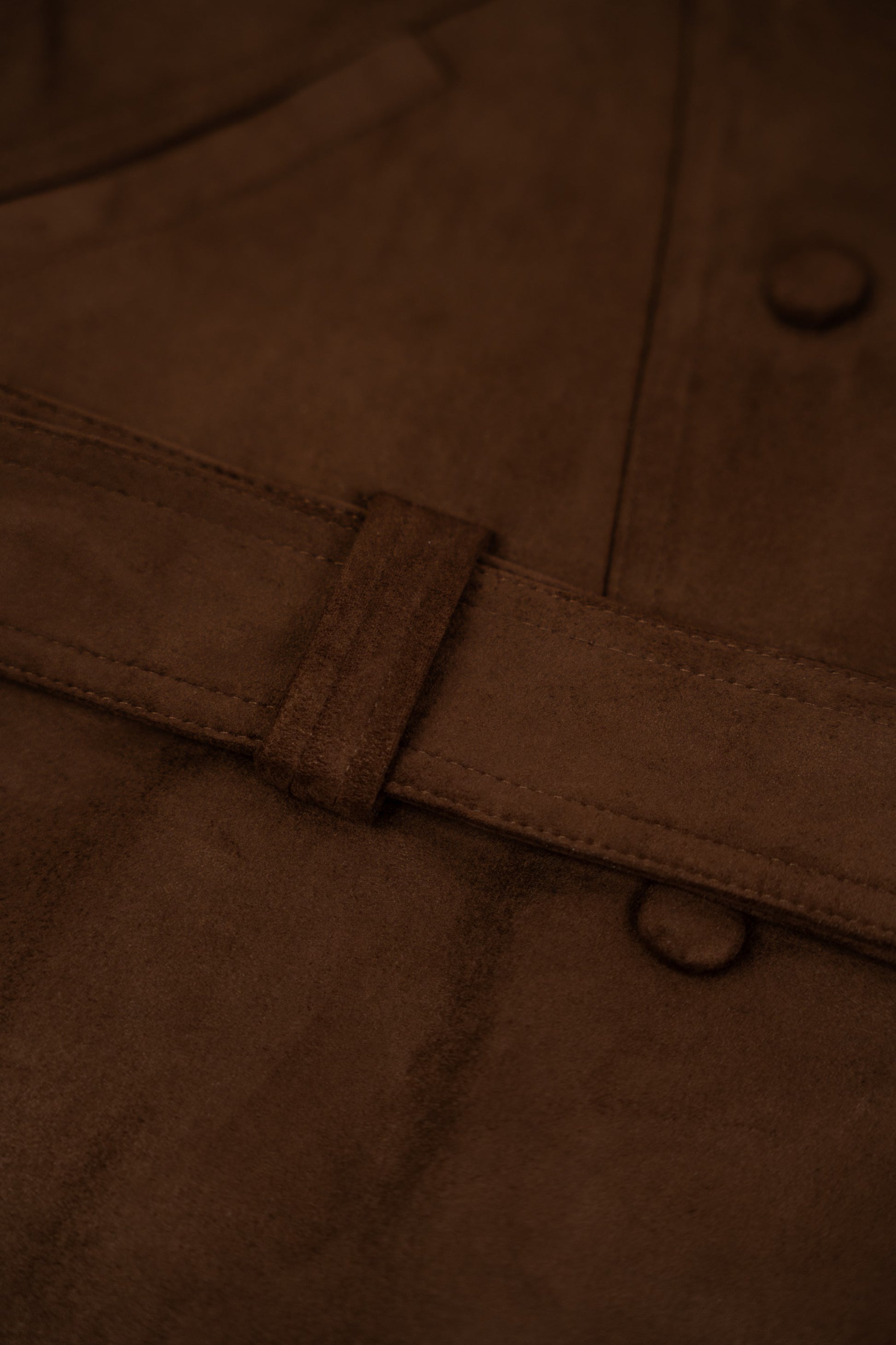 Brązowa, brzoskwiniowa, skórzana kurtka, z podszewką, zapinana z przodu na zatrzaski. Posiada funkcjonalne kieszenie z przodu zapinane na zatrzaski i pasek z tej samej tkaniny. Pasuje od S do L.