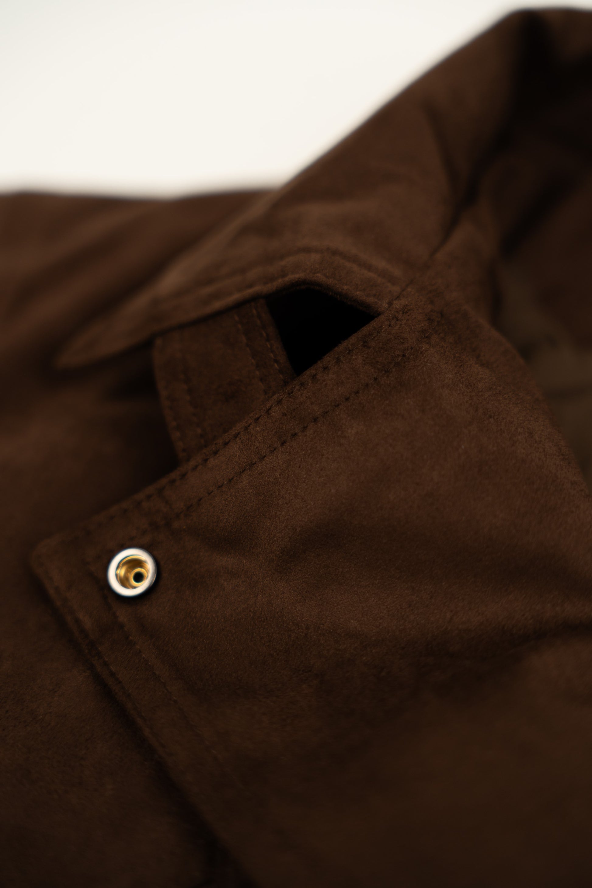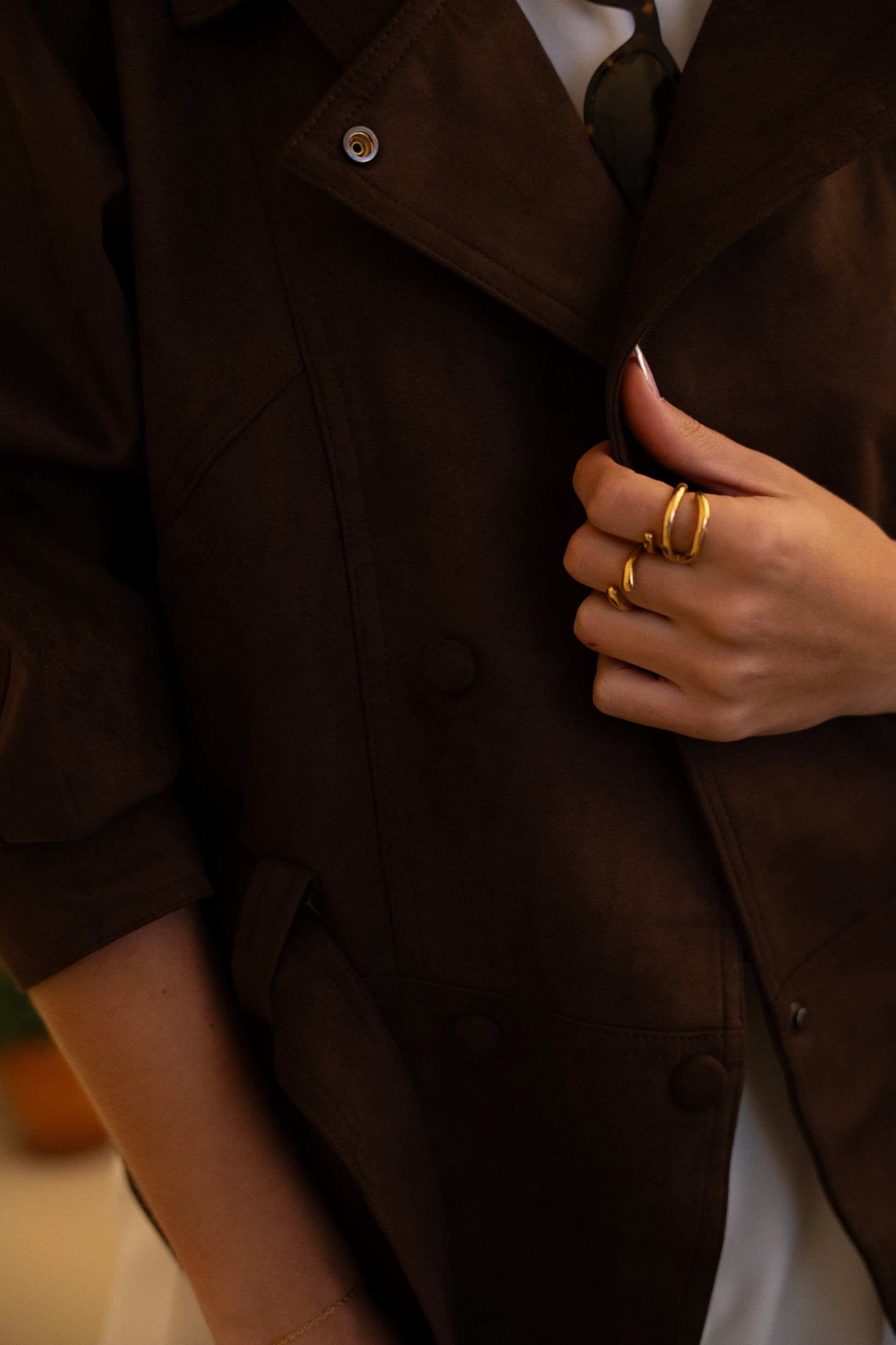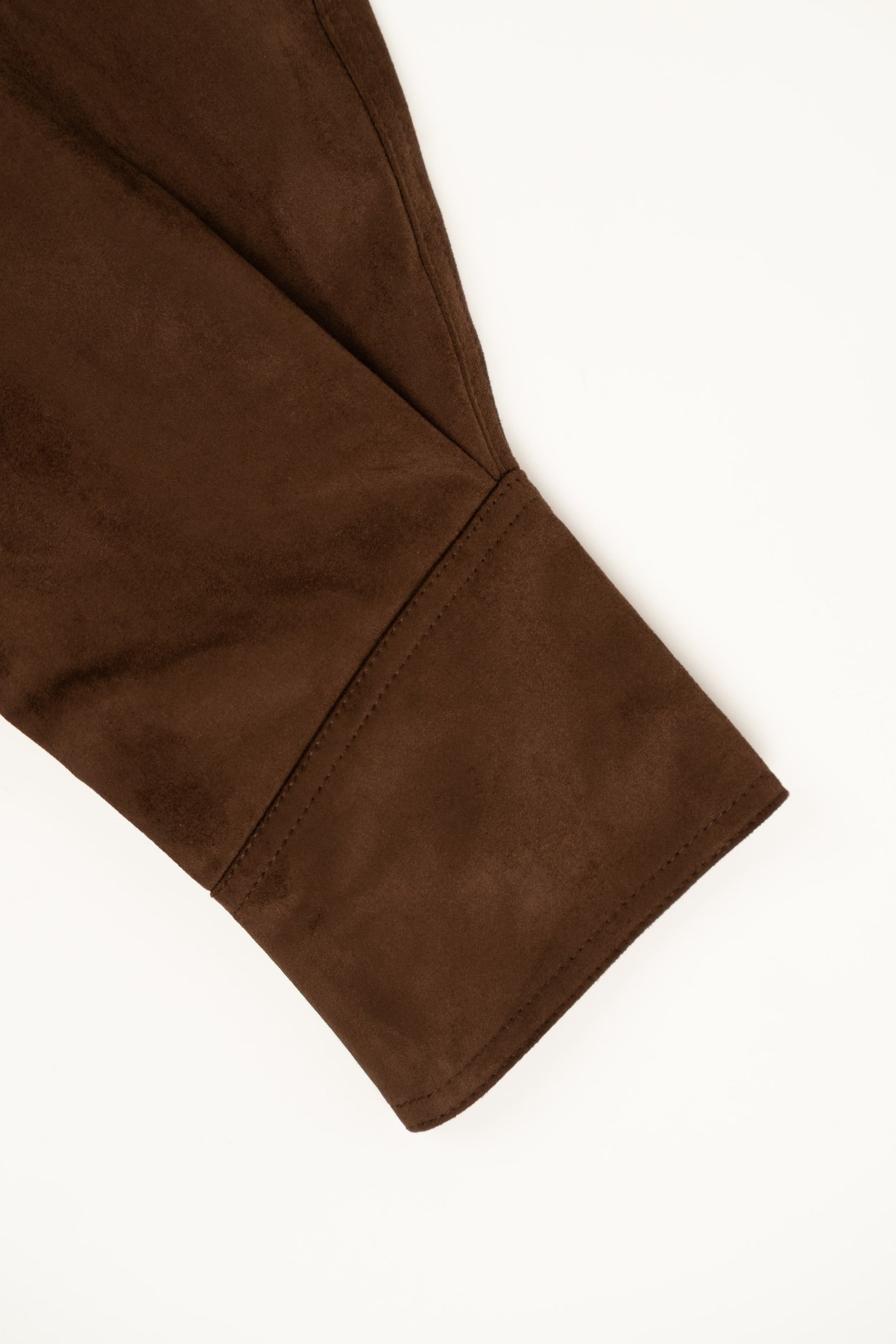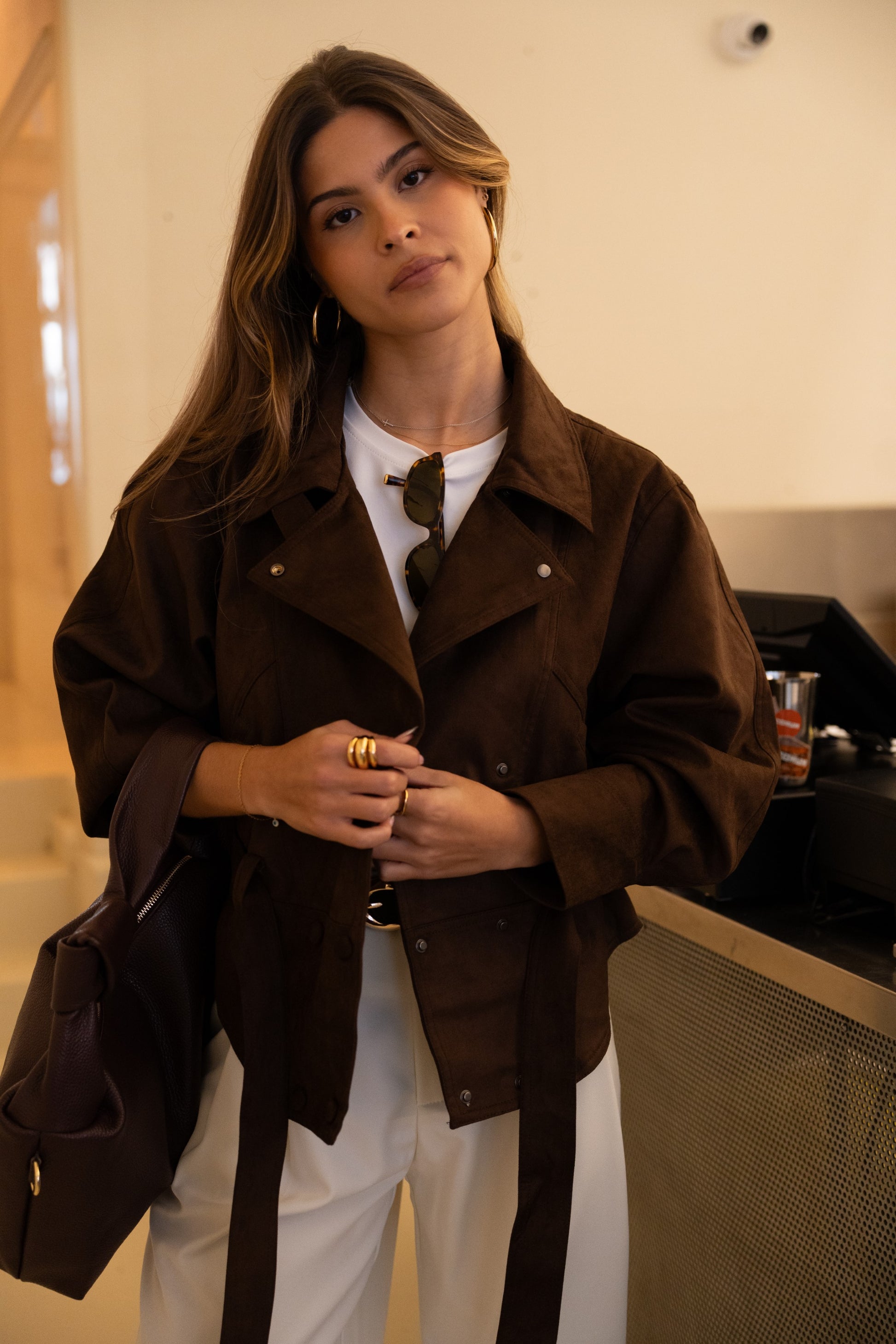 Brązowa, brzoskwiniowa, skórzana kurtka, z podszewką, zapinana z przodu na zatrzaski. Posiada funkcjonalne kieszenie z przodu zapinane na zatrzaski i pasek z tej samej tkaniny. Pasuje od S do L.