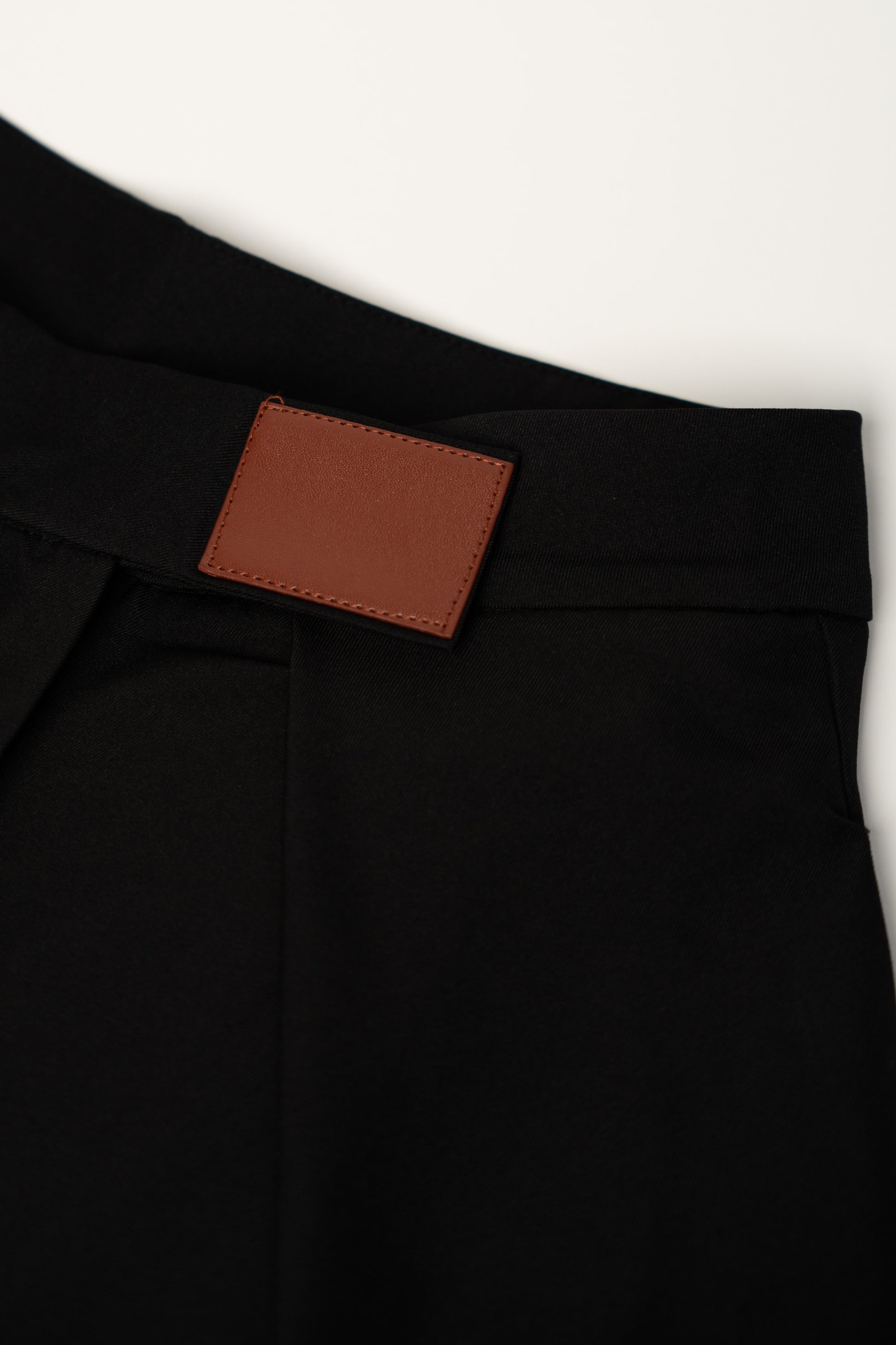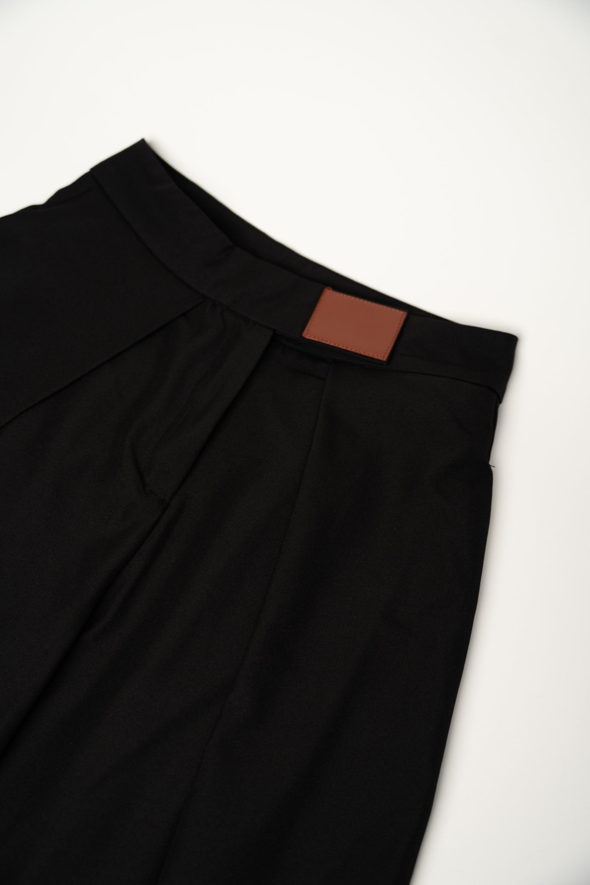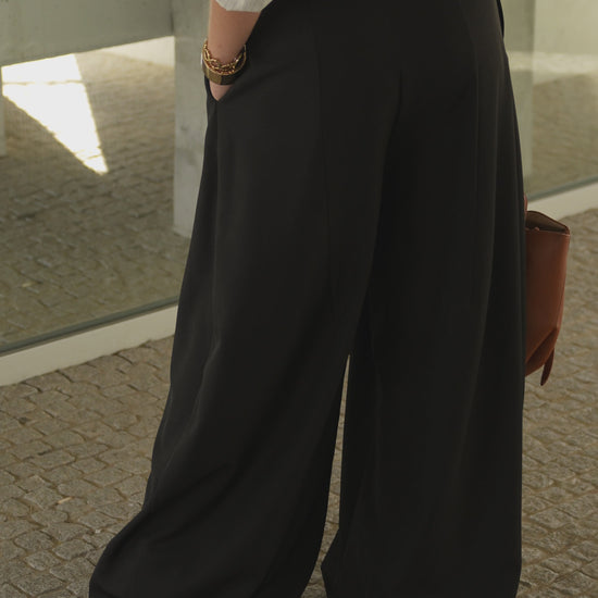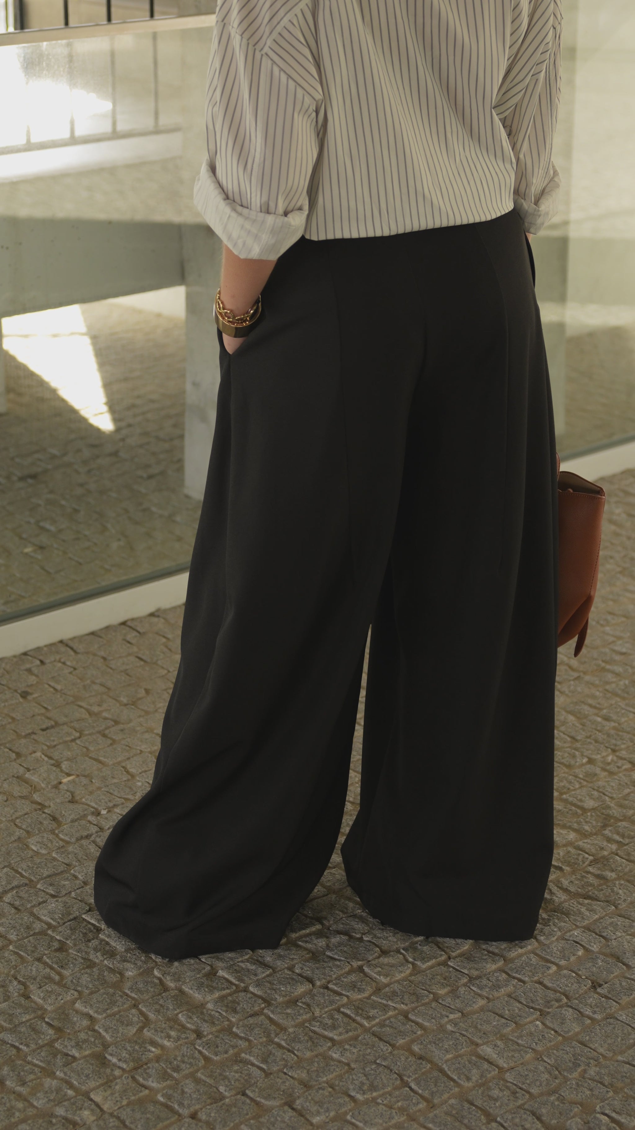 Spodnie o dopasowanym kroju z wysokim stanem i szlufkami na pasek. Kieszenie boczne. Z przodu duże zakładki. Szerokie, proste nogawki. Zapięcie z przodu na zamek błyskawiczny, guzik wewnętrzny i metalowe haftki.