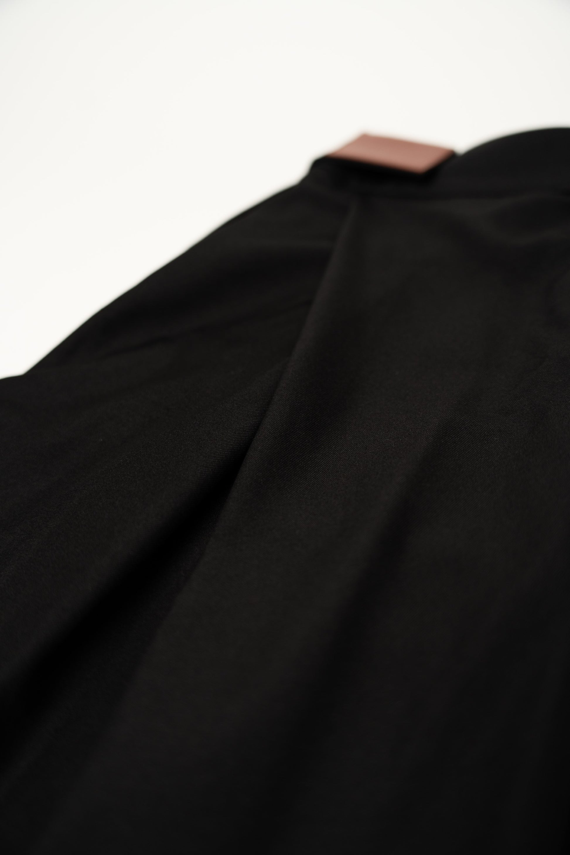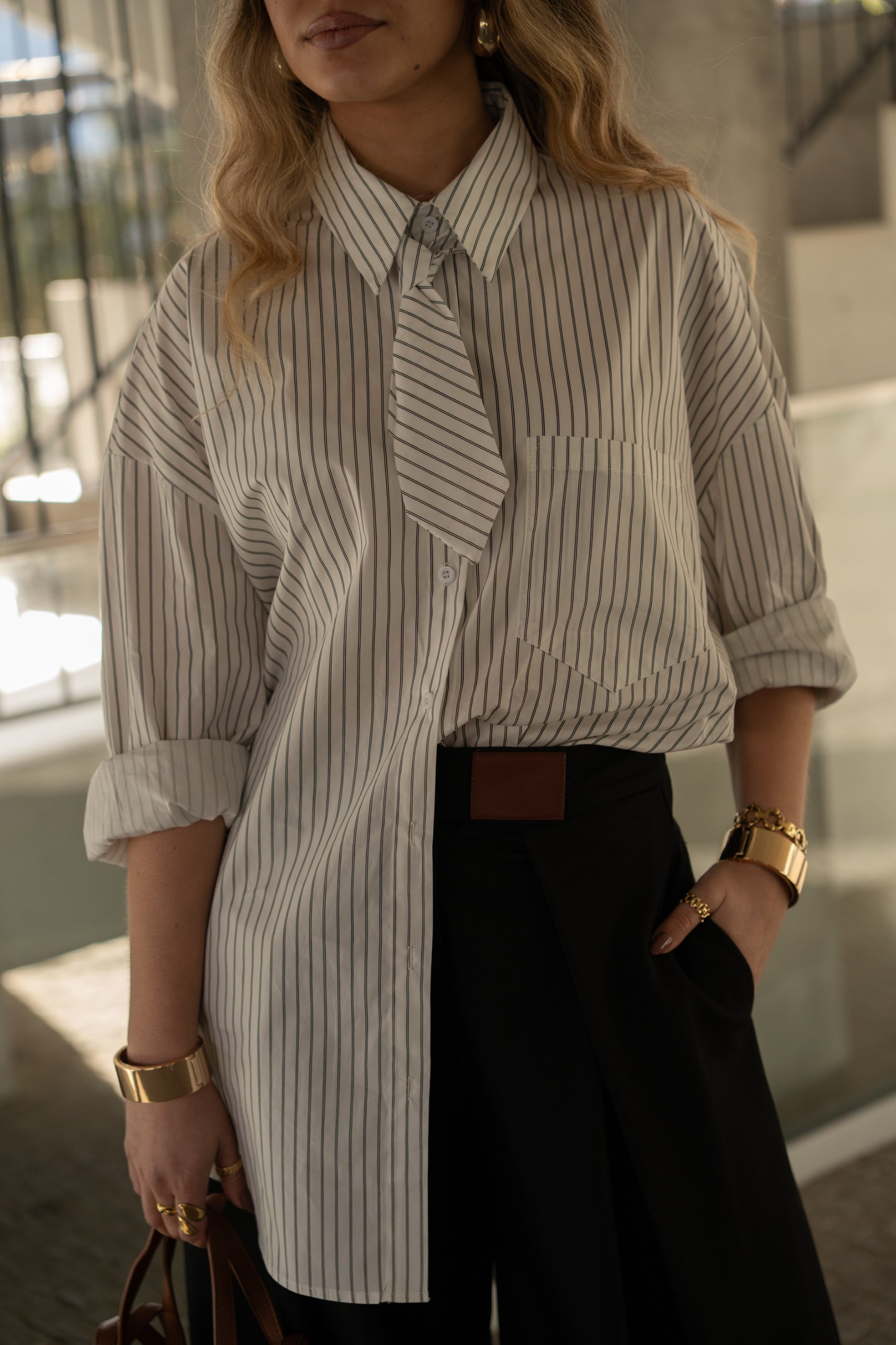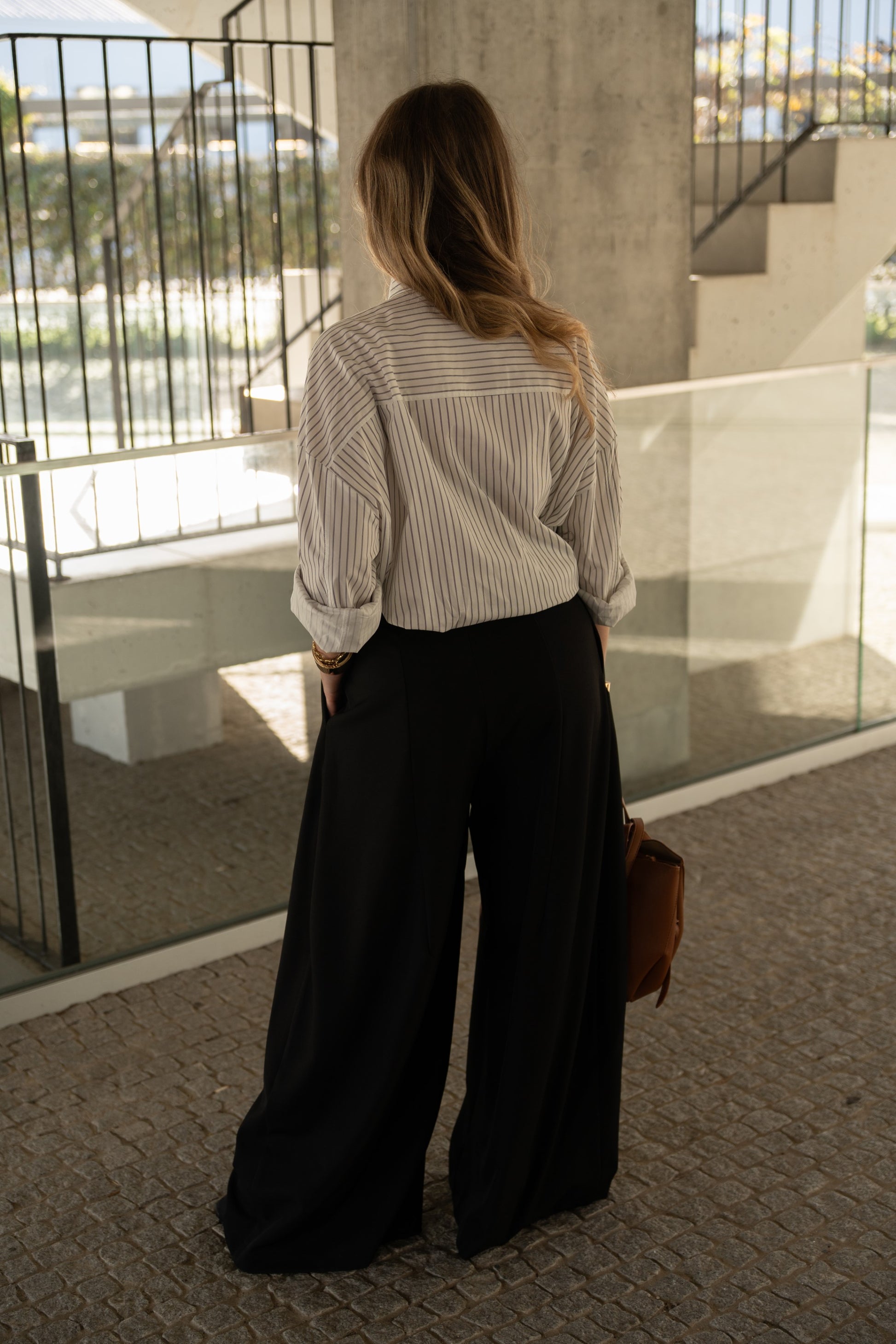 Spodnie o dopasowanym kroju z wysokim stanem i szlufkami na pasek. Kieszenie boczne. Z przodu duże zakładki. Szerokie, proste nogawki. Zapięcie z przodu na zamek błyskawiczny, guzik wewnętrzny i metalowe haftki.