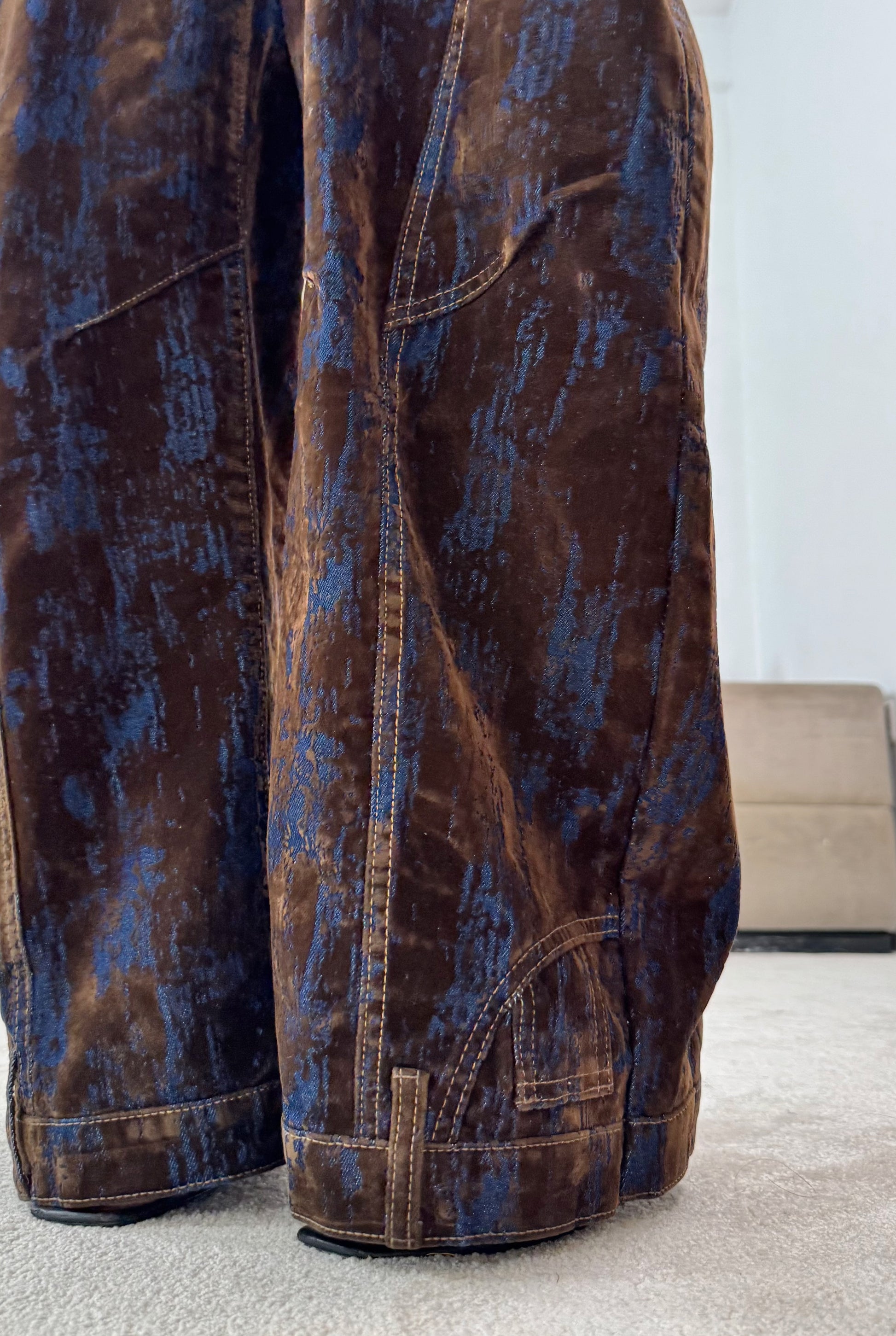 Spodnie z szerokimi nogawkami i efektem odwróconej talii. Aksamitne detale w odcieniach brązu. Fason z pięcioma tradycyjnymi kieszeniami, zapięciem na suwak i guzik z przodu.