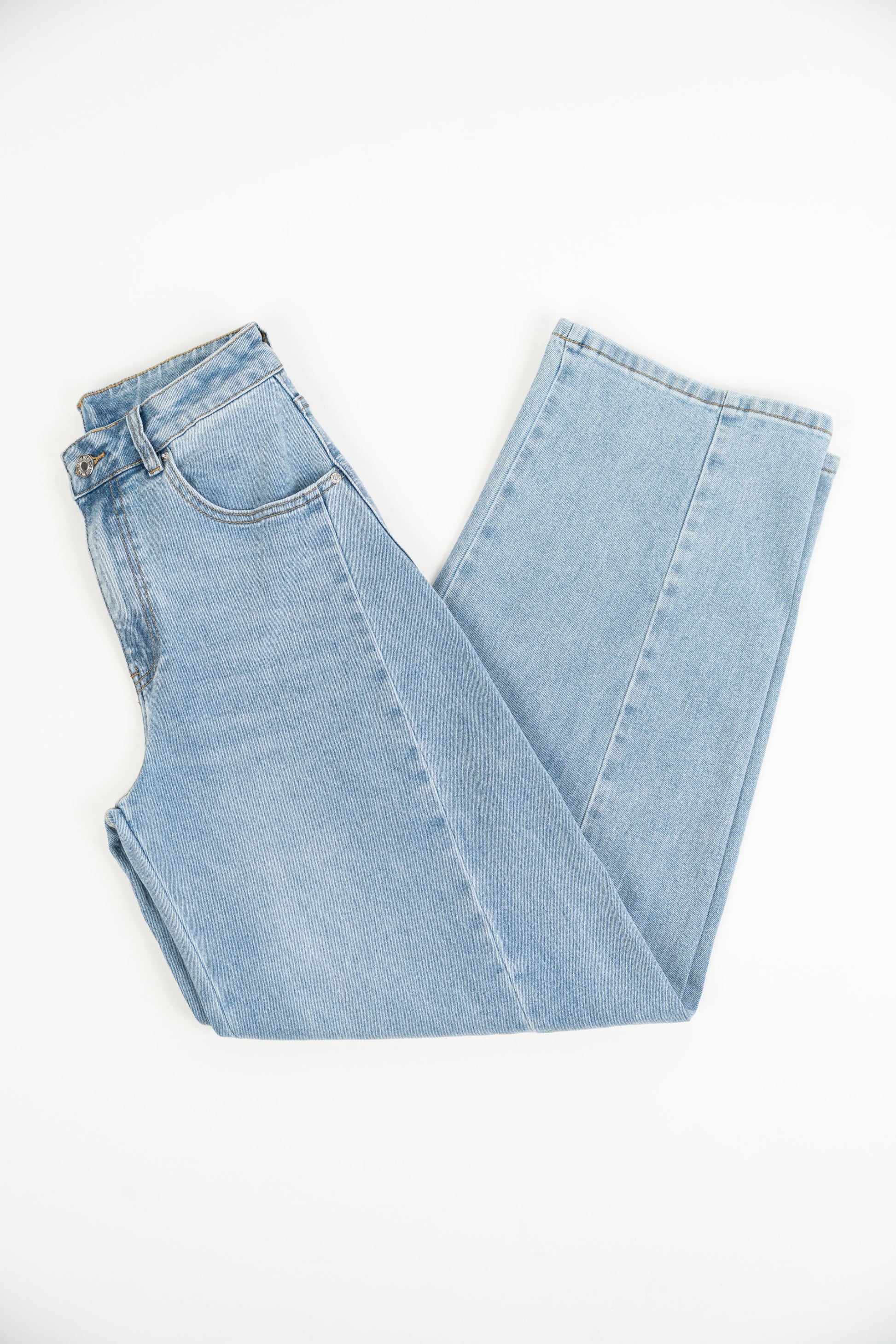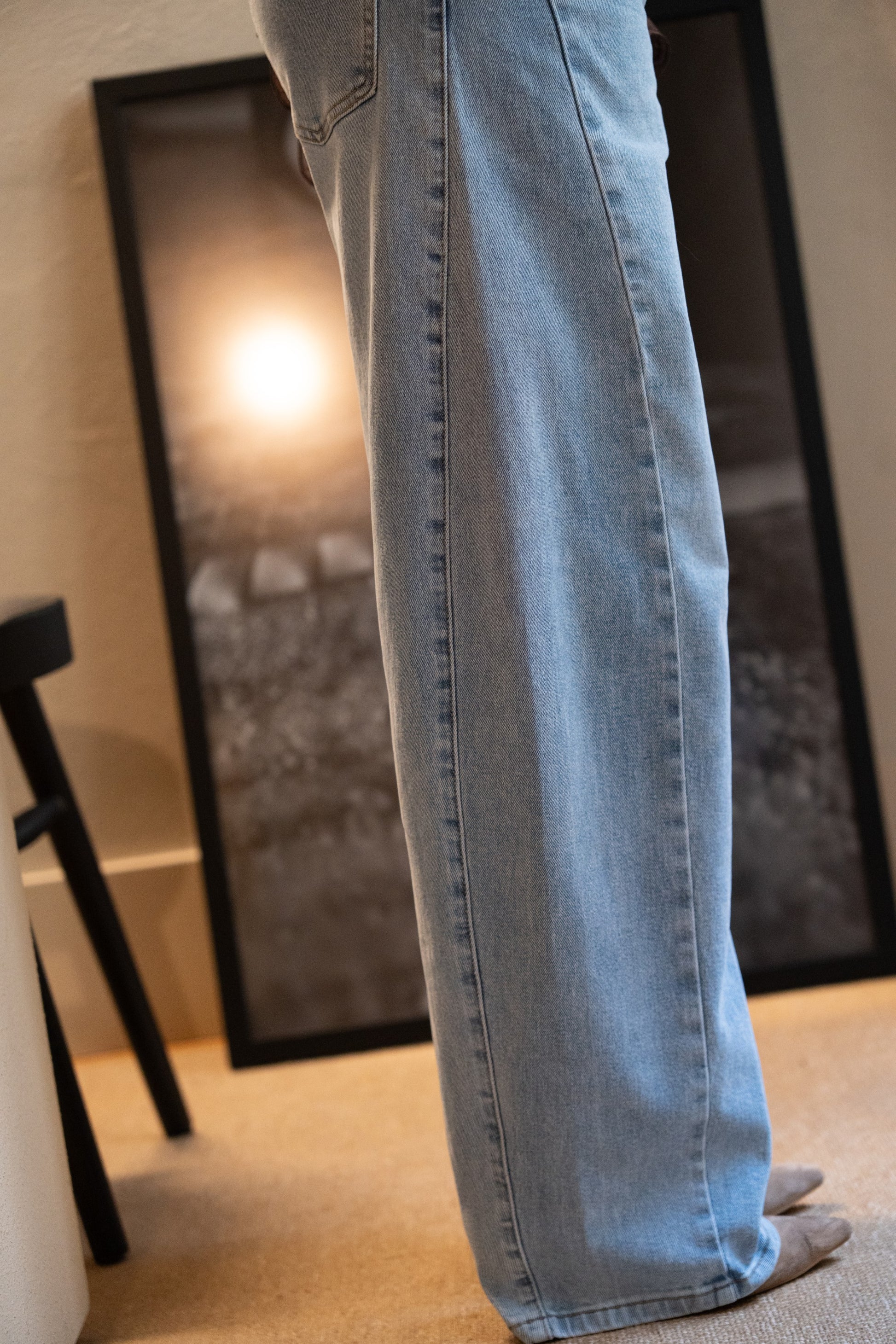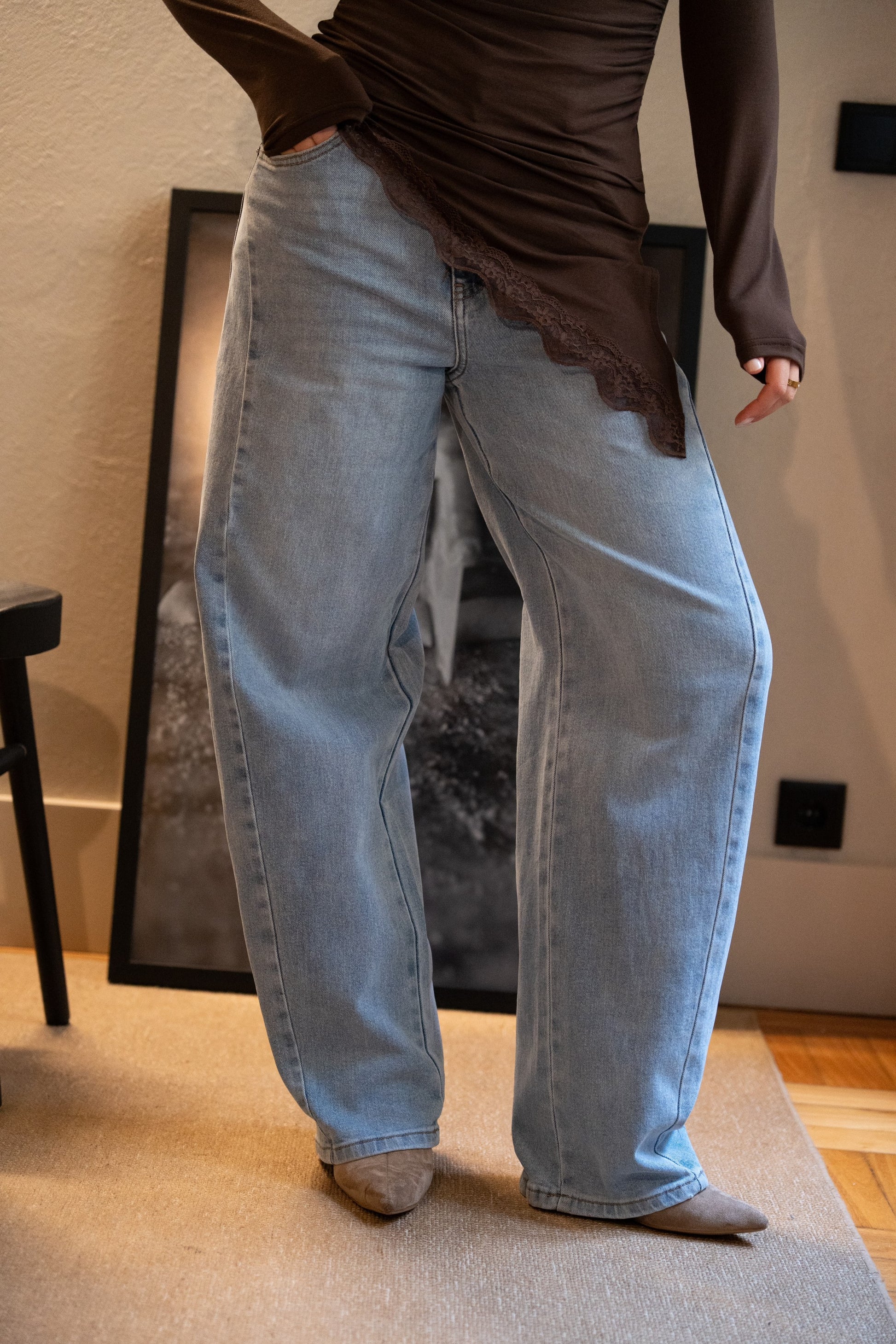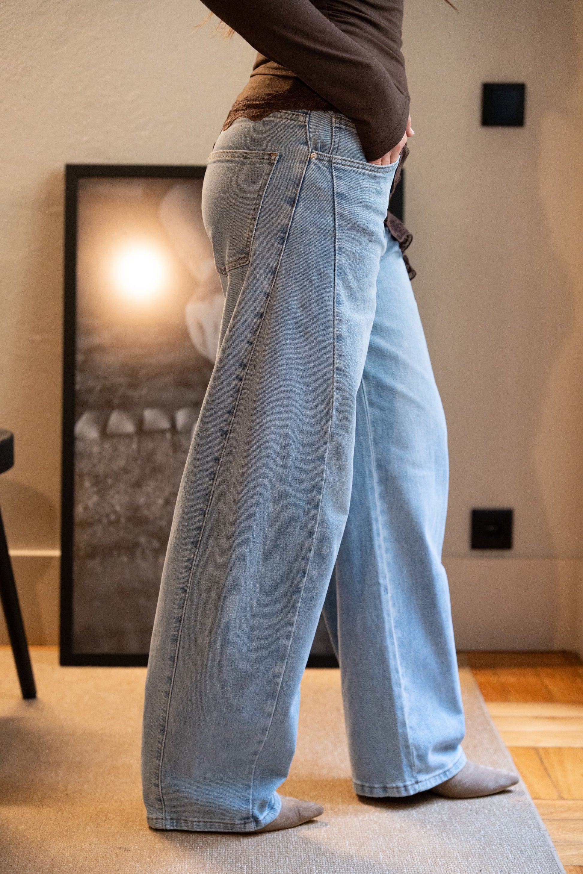 Spodnie jeansowe Balloon Light Denim z elastyczną podeszwą. Wysoki stan, zapięcie na suwak i guzik, szlufki na pasek i kieszenie. Prosty krój od kieszeni do dołu.