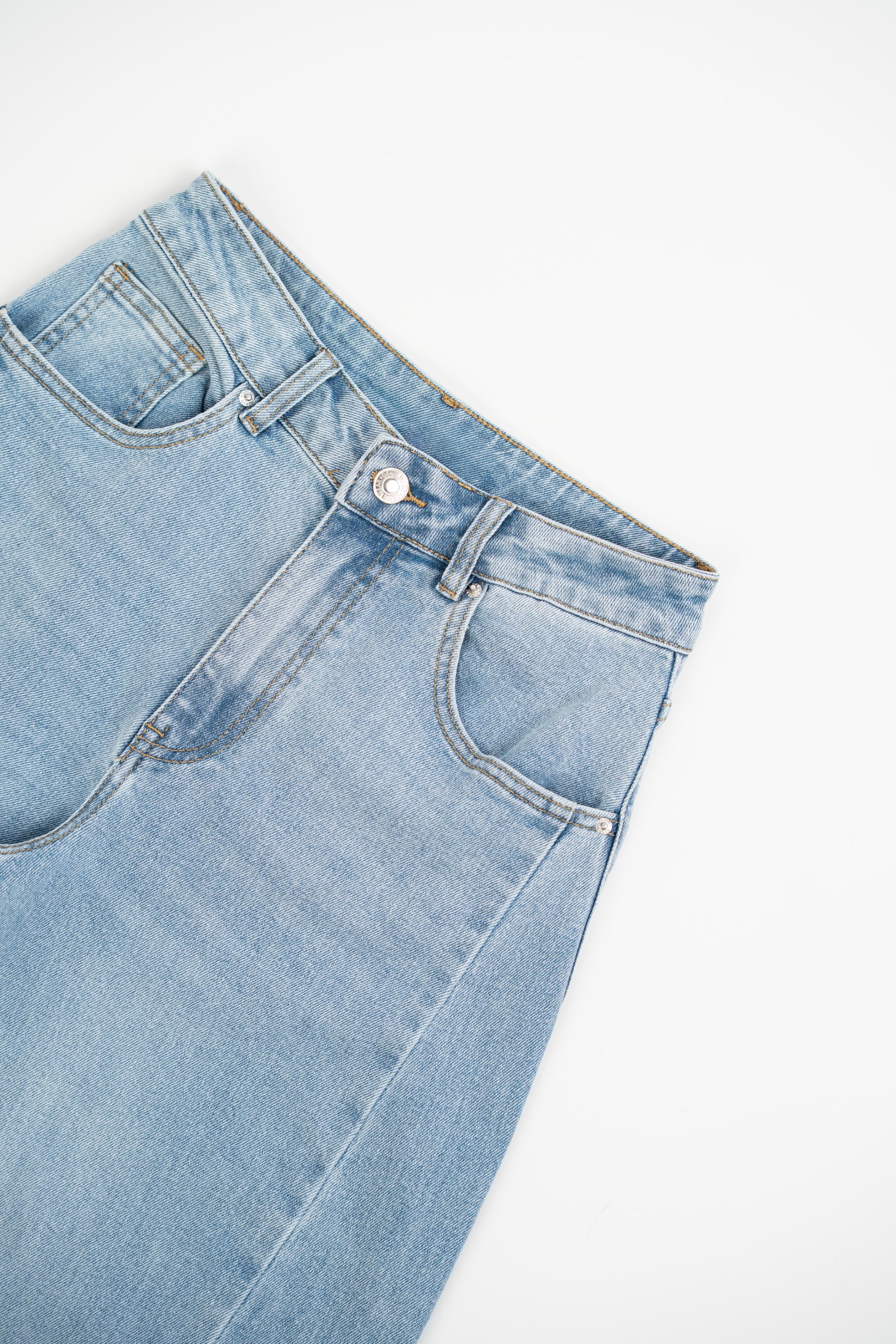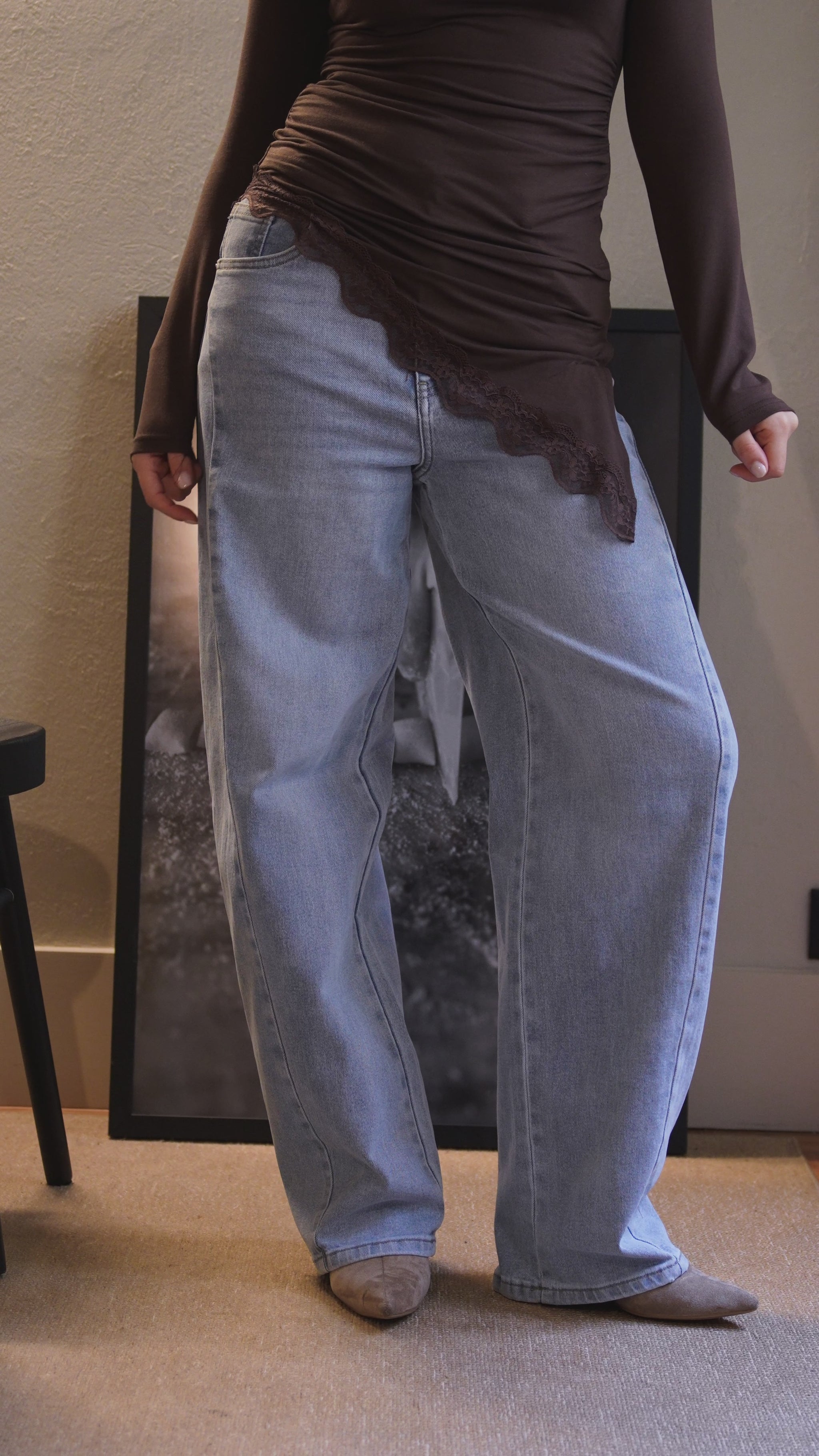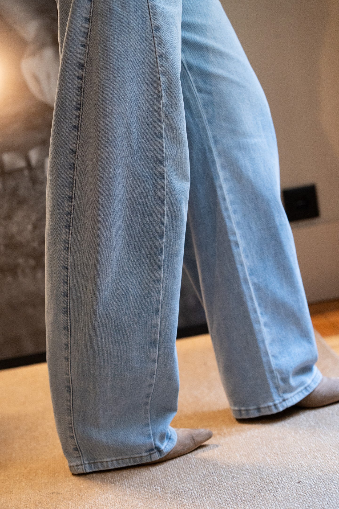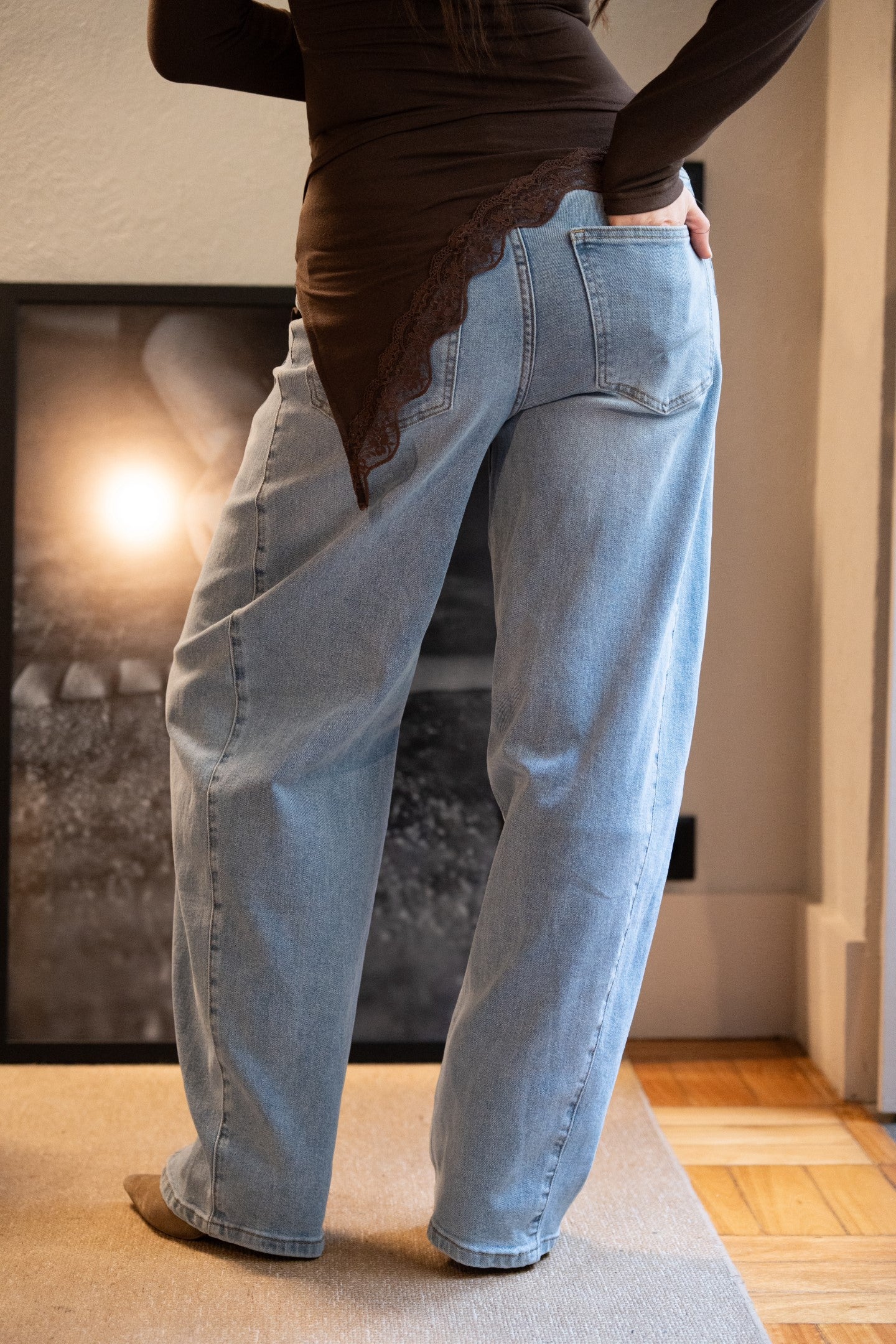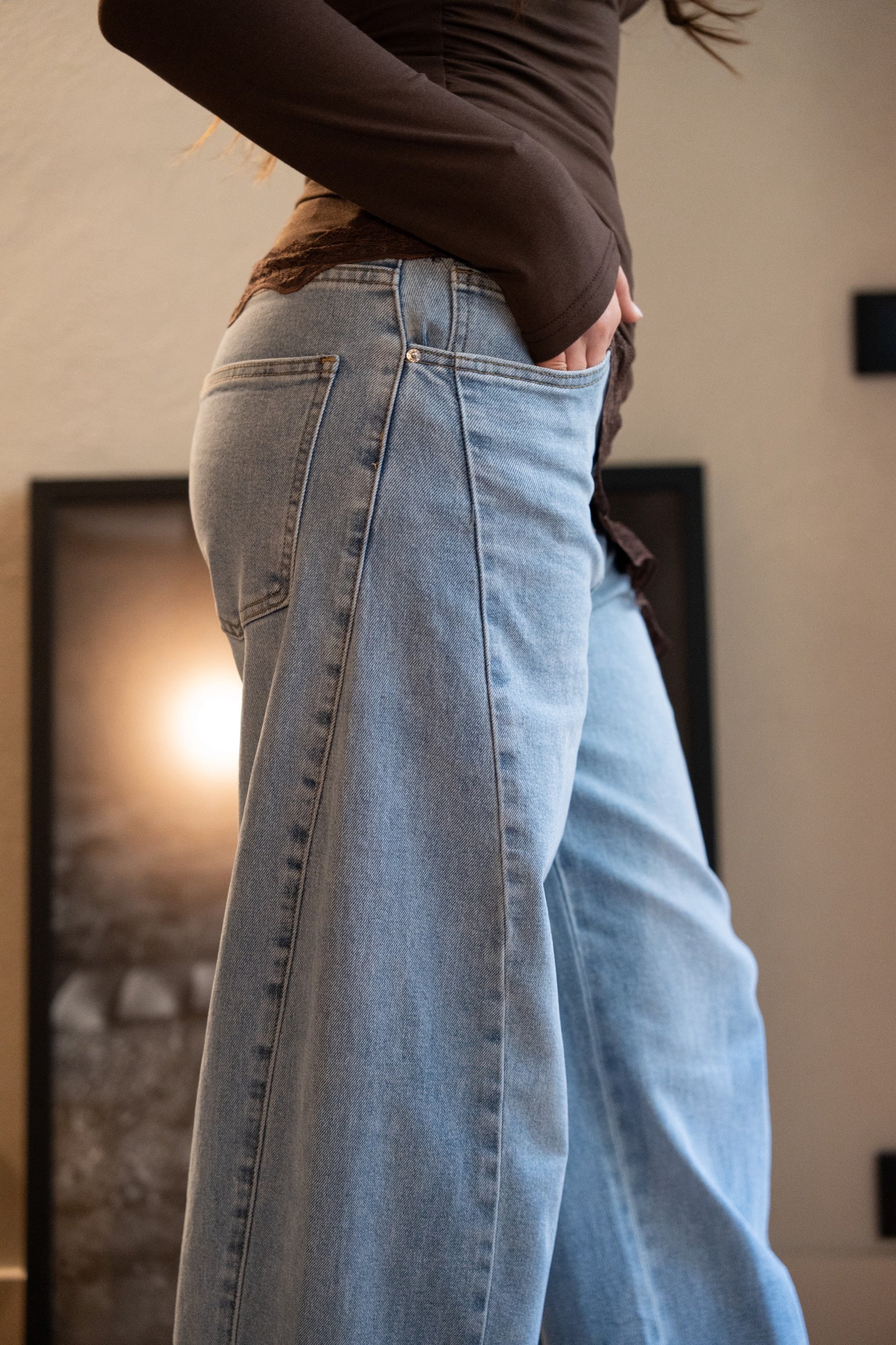 Spodnie jeansowe Balloon Light Denim z elastyczną podeszwą. Wysoki stan, zapięcie na suwak i guzik, szlufki na pasek i kieszenie. Prosty krój od kieszeni do dołu.