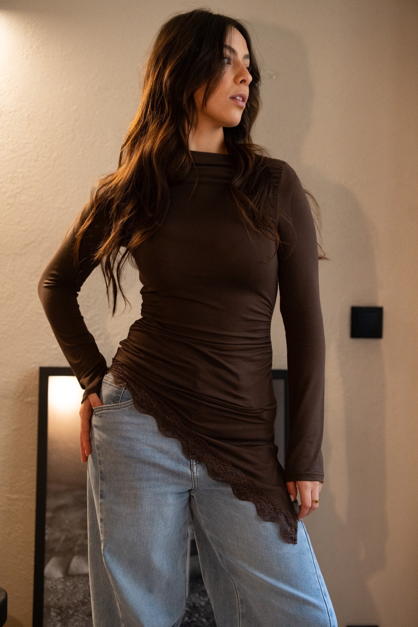 Modelka ma 1,75 m wzrostu, zazwyczaj nosi rozmiar 36/38 i ma na sobie M dla szerszego i dłuższego efektu.