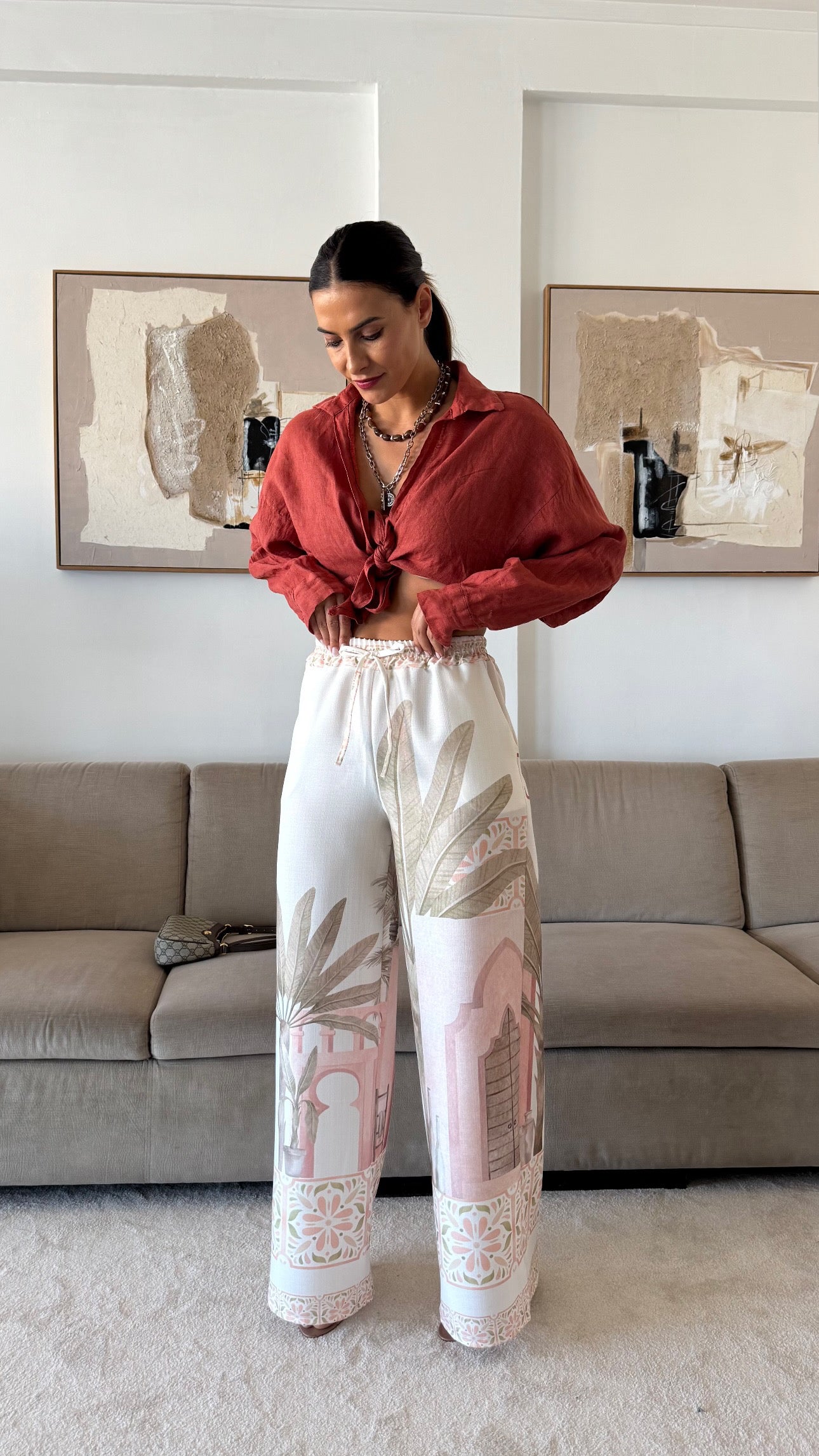 Spodnie z szerokimi nogawkami i podszewką. Elastyczny pas i kieszenie. Dopasowane. S do L.