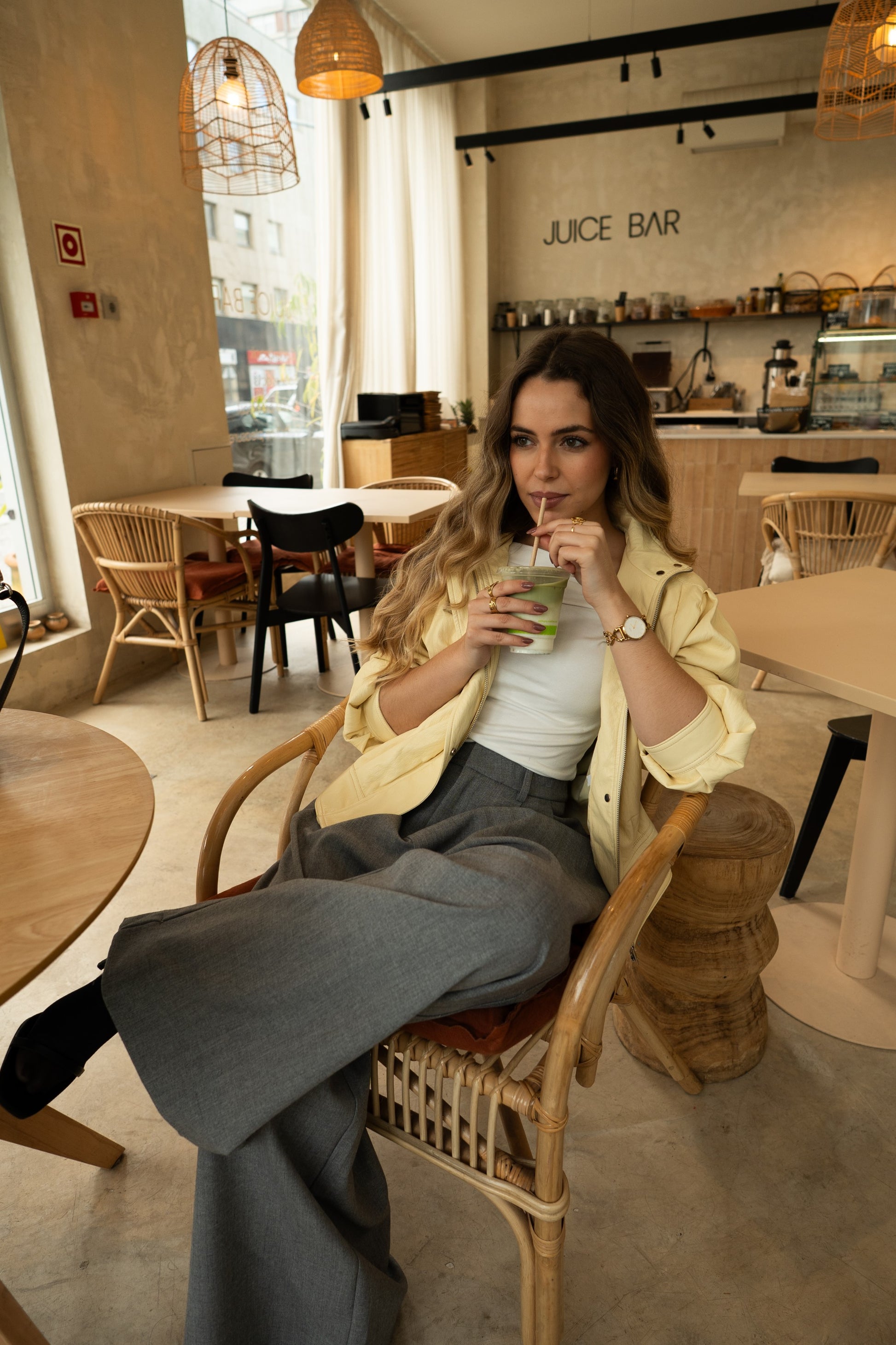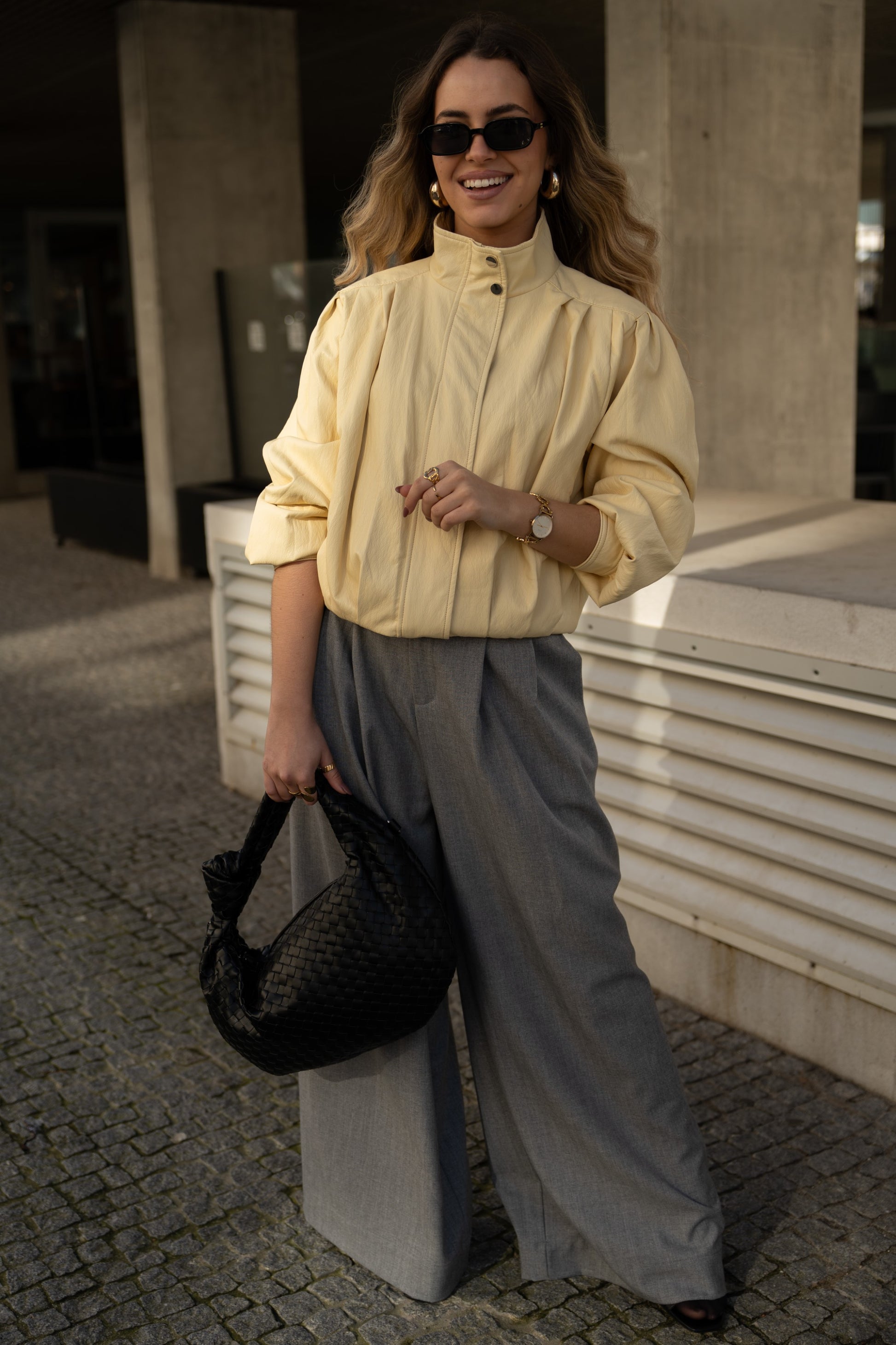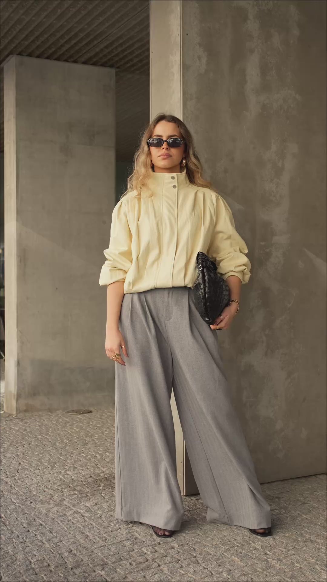 Spodnie dopasowane z wysokim stanem i kieszeniami. Plisowane. Zapięcie z przodu na zamek błyskawiczny, wewnętrzny guzik i metalową haftkę.Posiada klipsy do paska.