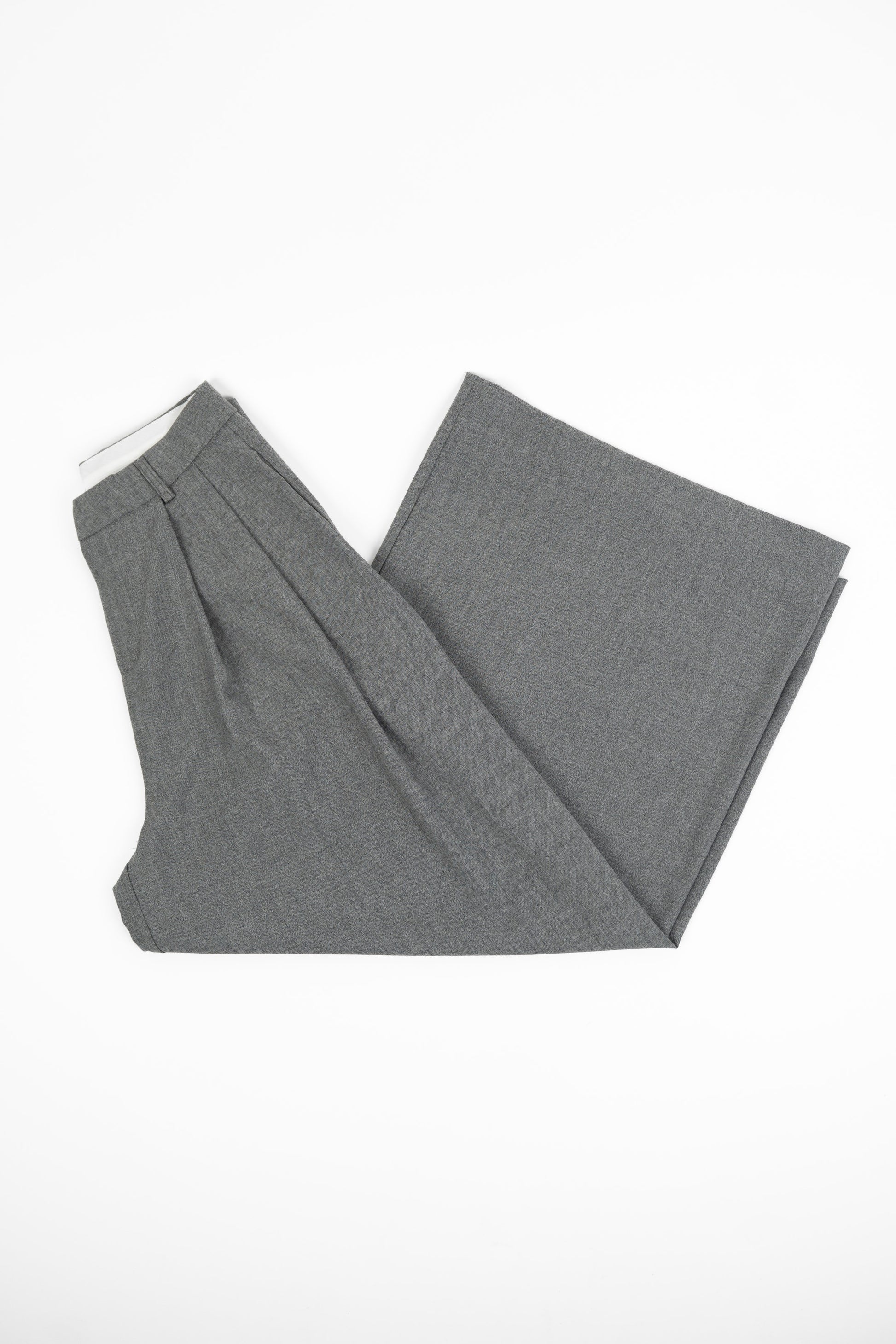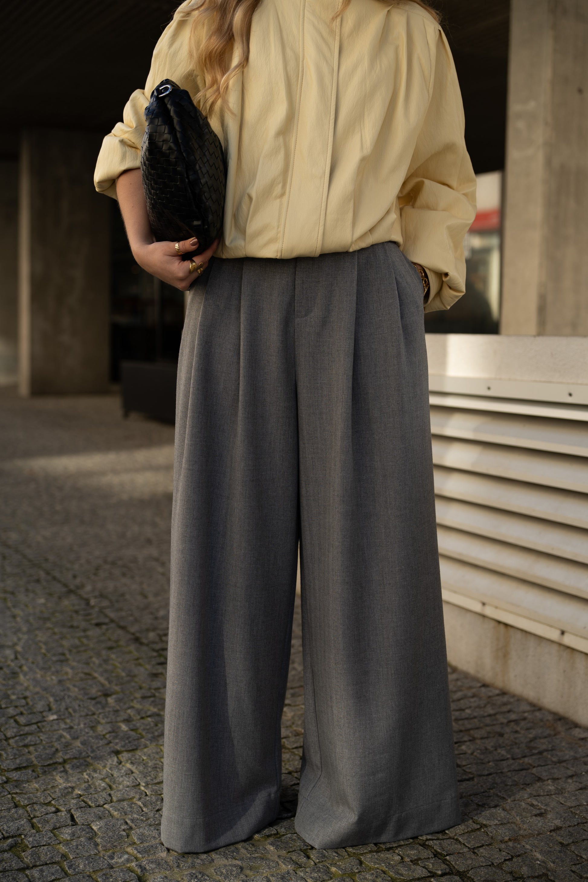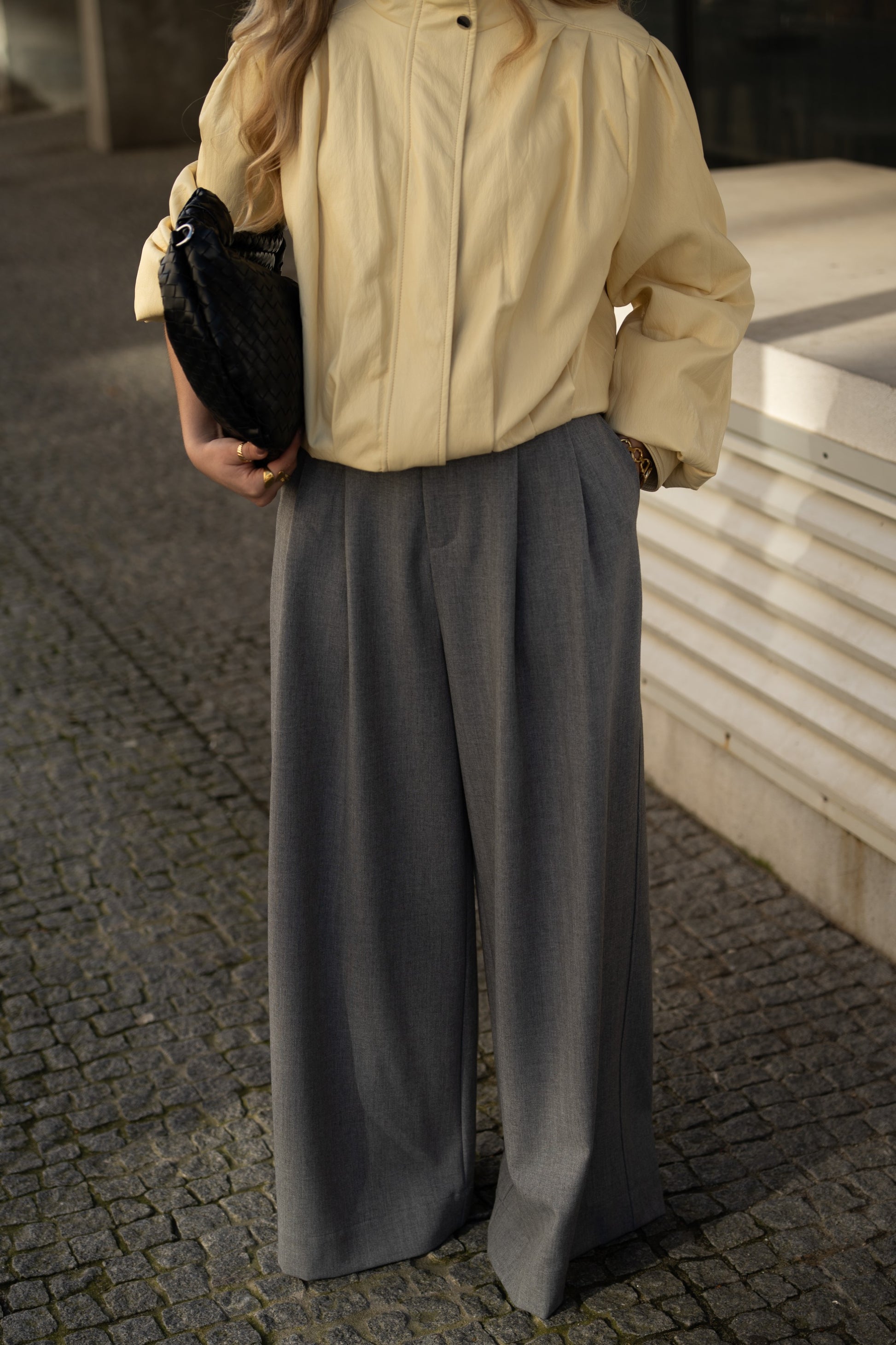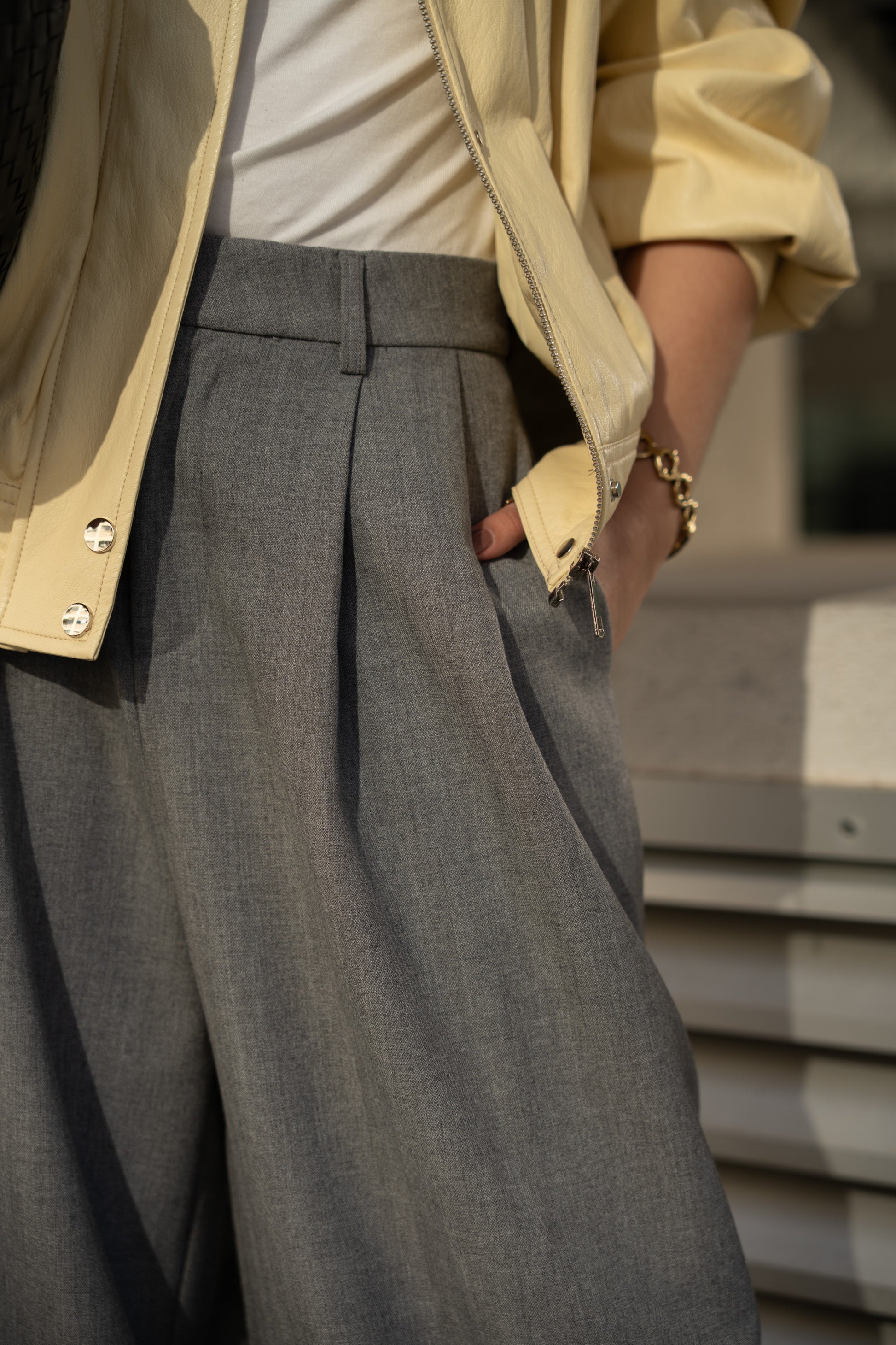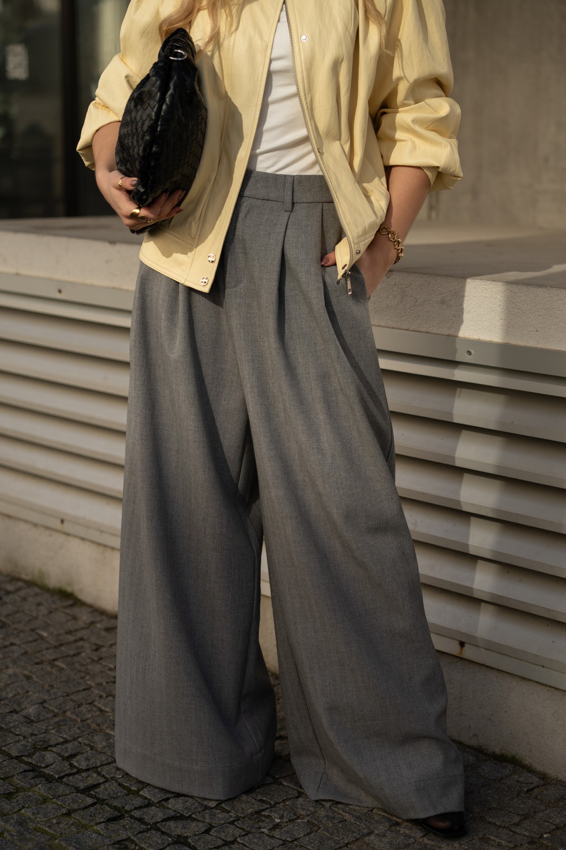 Szare, dopasowane spodnie z szerokimi nogawkami