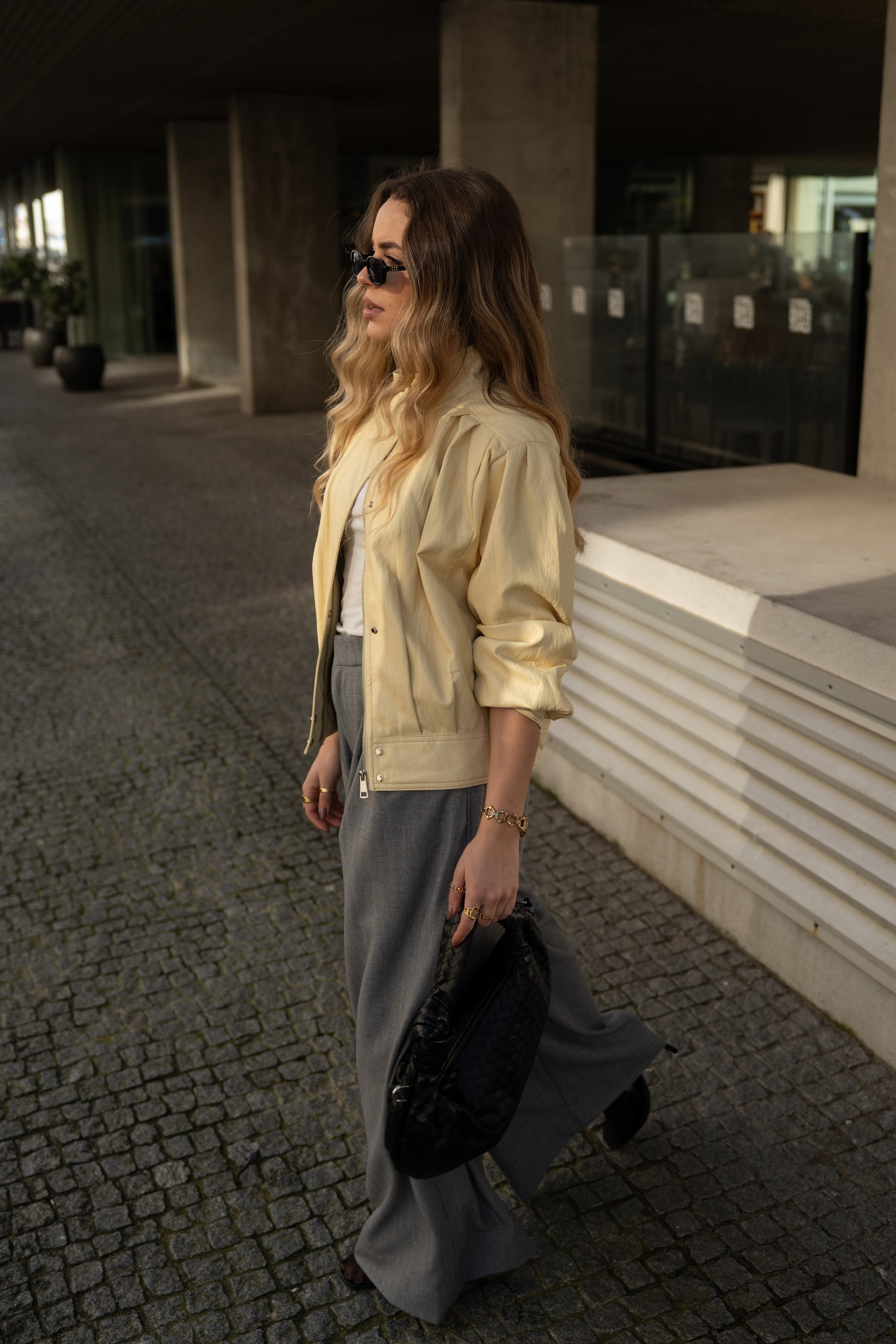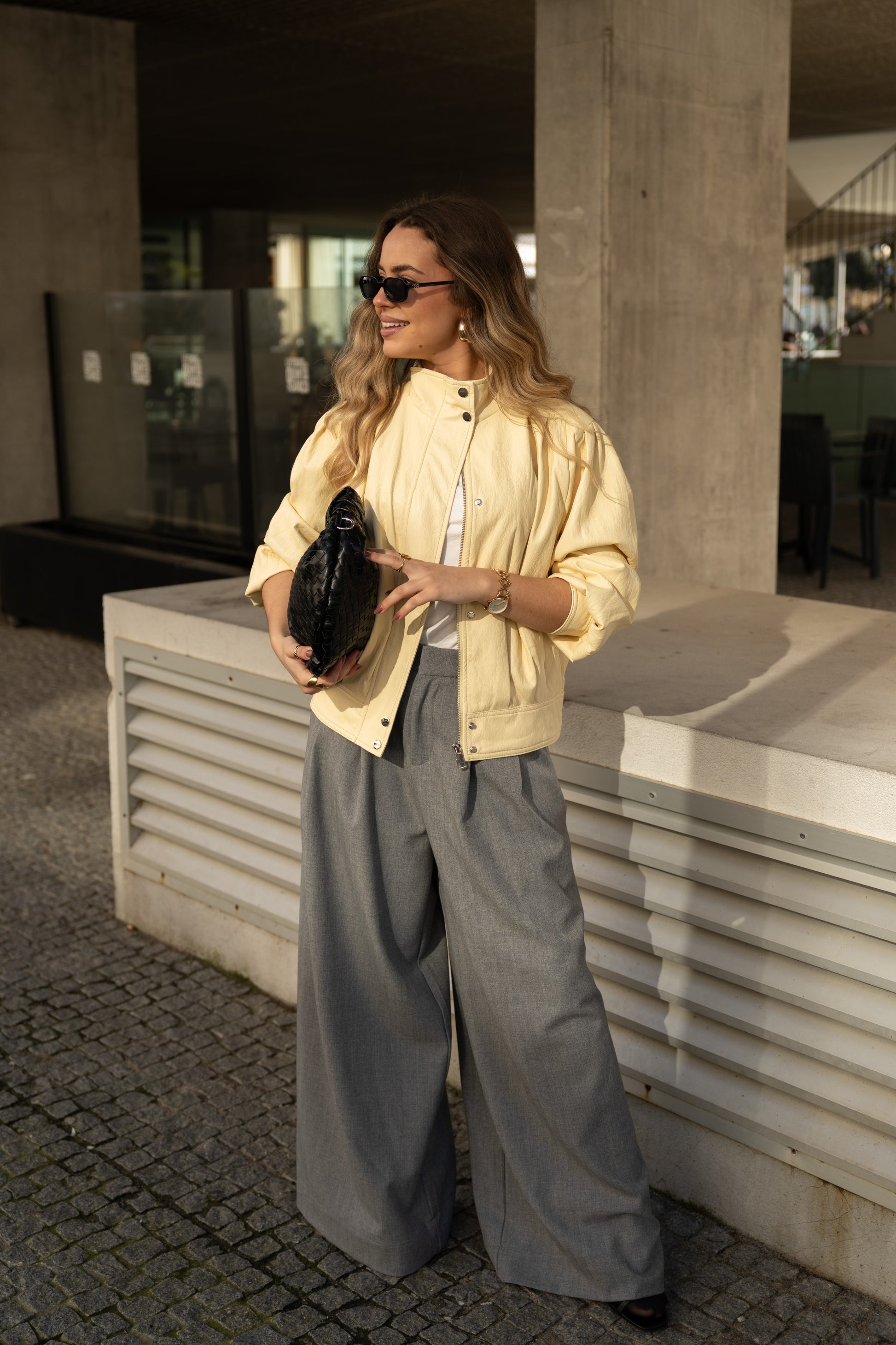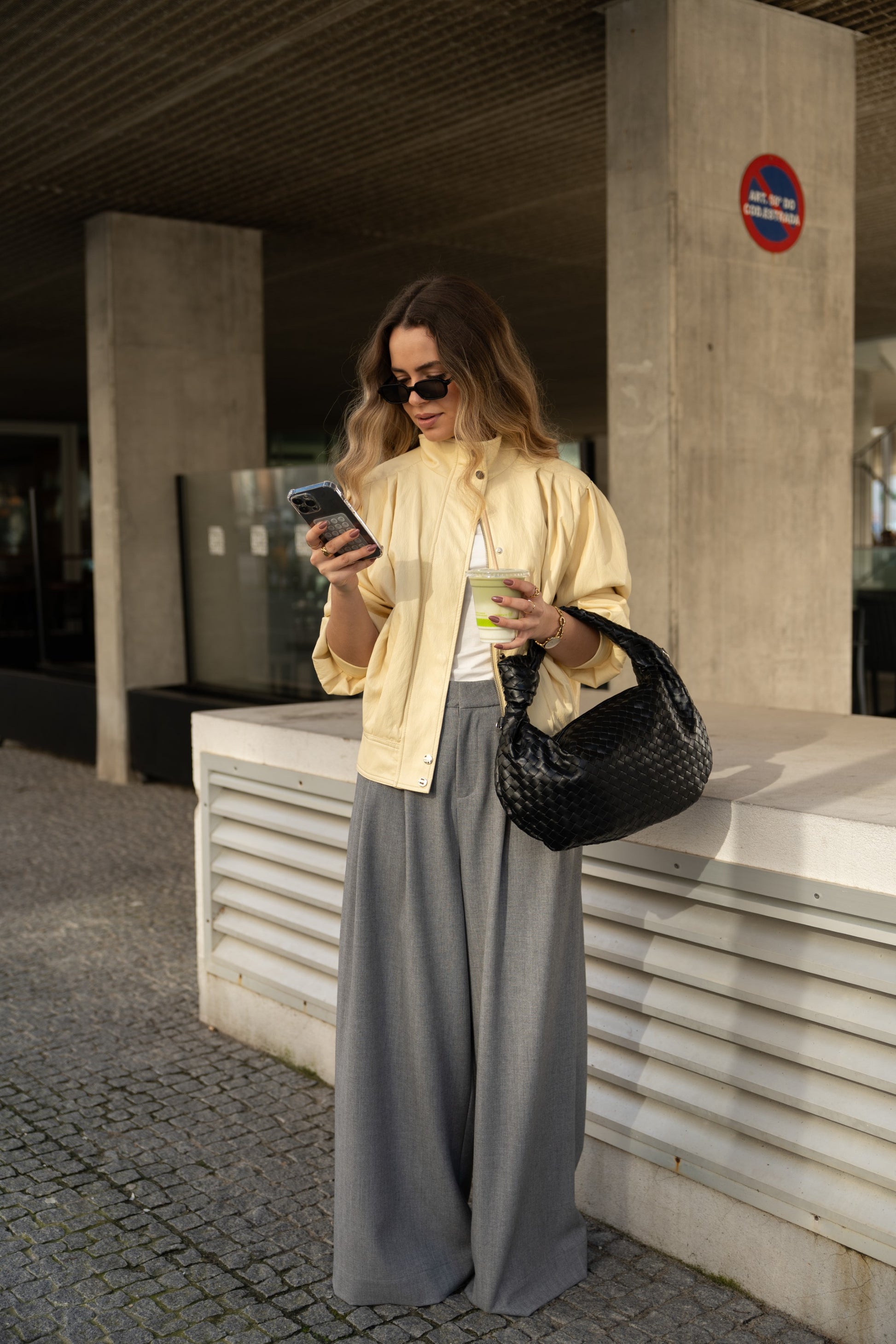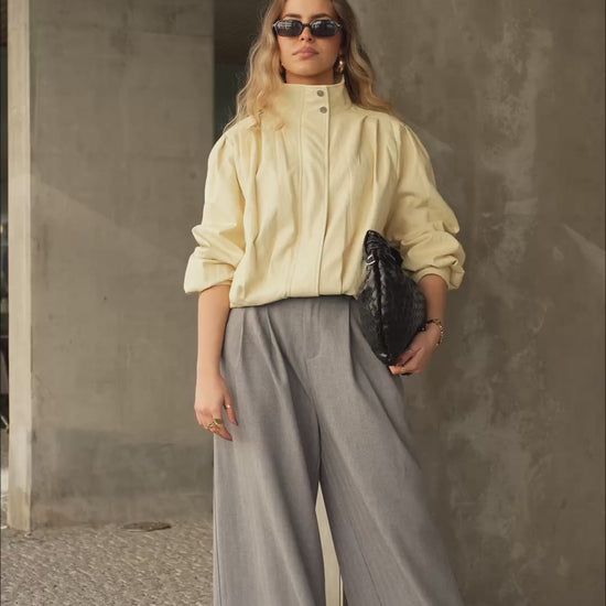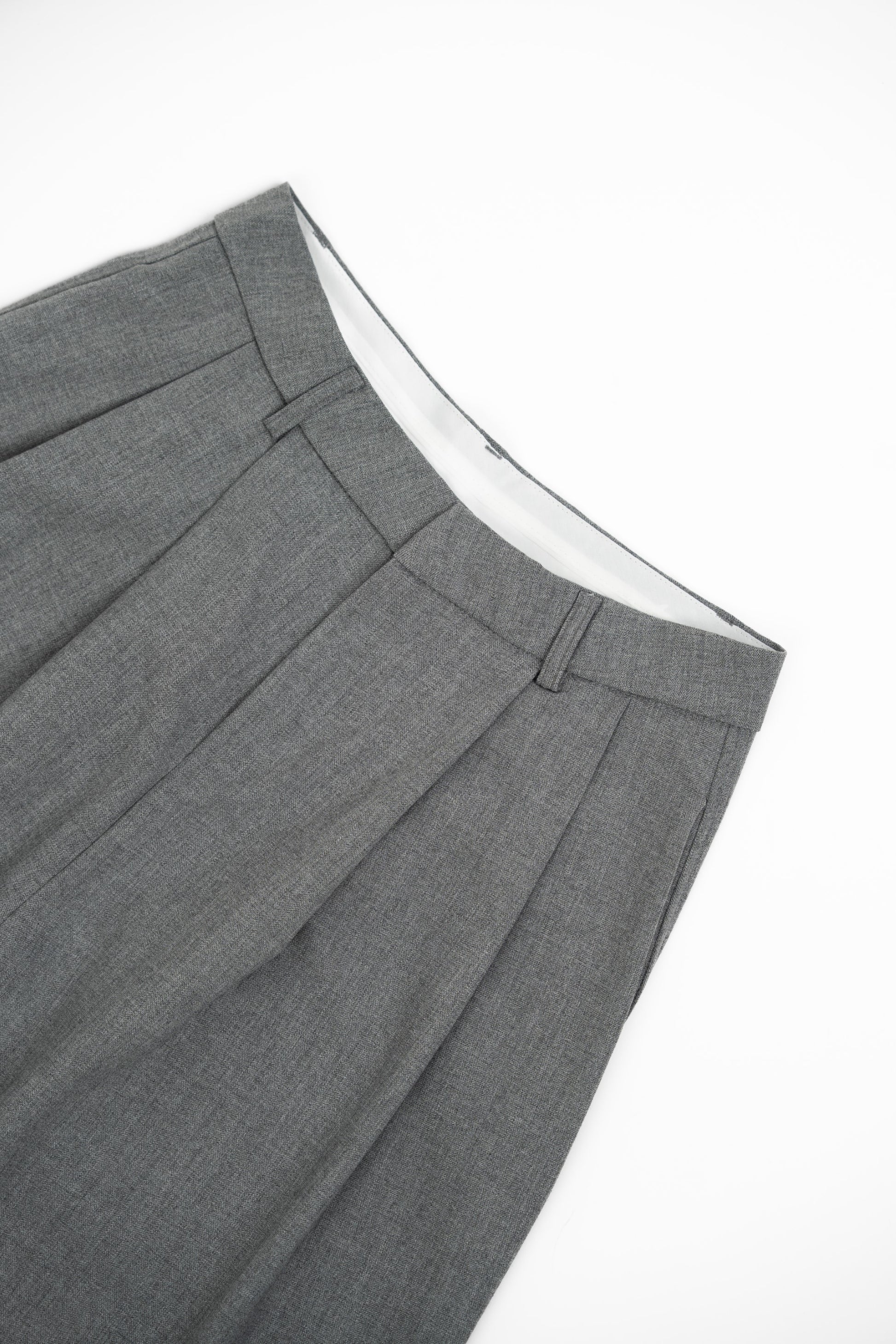 Szare, dopasowane spodnie z szerokimi nogawkami
